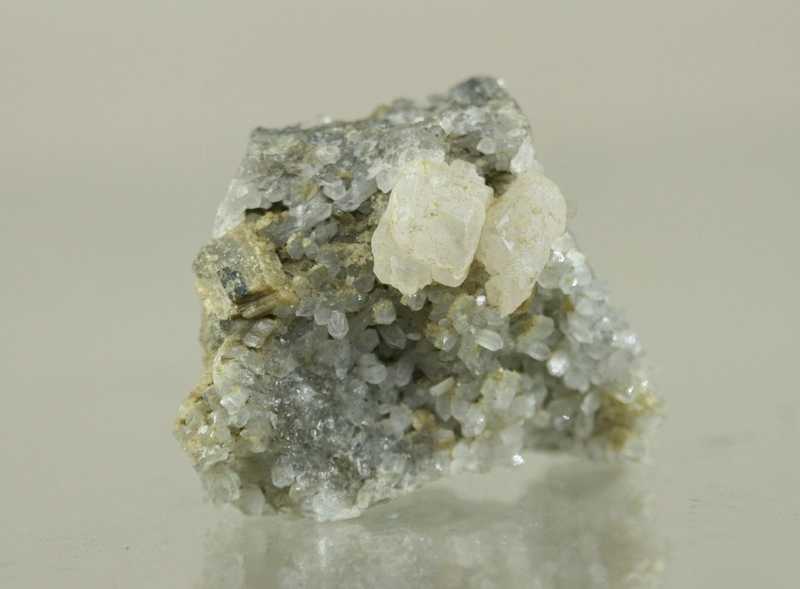 Kleinere, reiche Auswahl an Příbram Mineralen. Probe von hochglänzenden Arsenopyrit-Kristallen auf Quarz, auf der anderen Seite Siderit-Kristalle zusammen mit Nagelkopf-Kristallen von Calcit .
