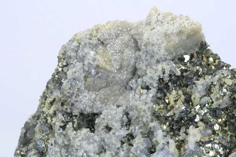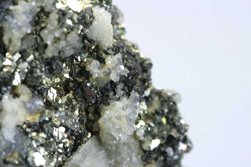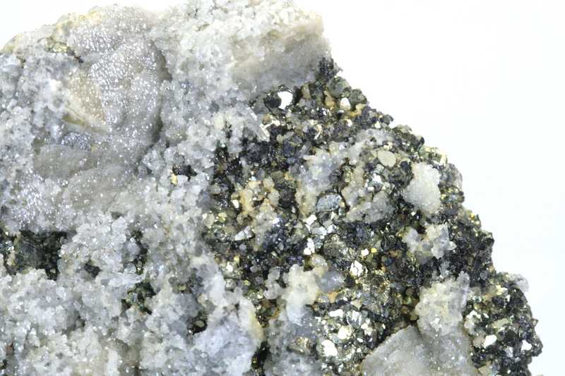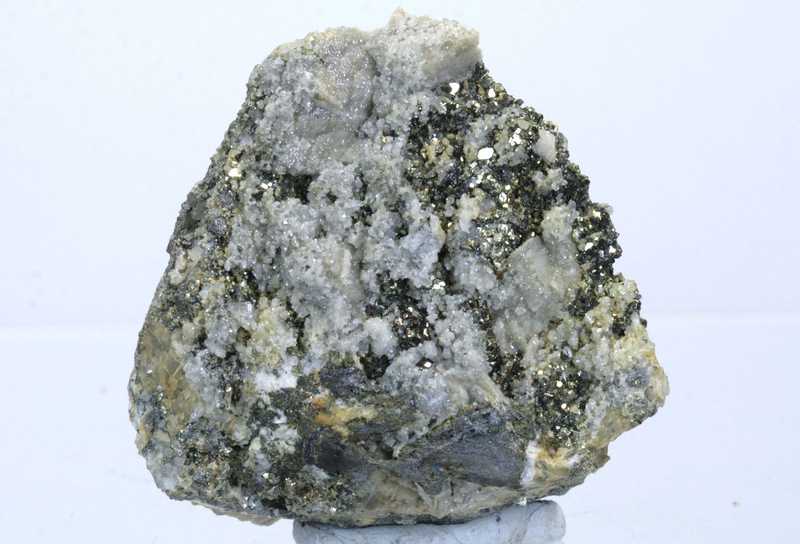 Ästhetisches Beispiel klassischer Minerale aus den Příbram Erzgruben. Eine sehr schöne Sample einer Druse von Siderit-Kristallen, die zu einem großen Teil von kleinen Quarz-Kristallen überwachsen sind und zwischen denen sich goldgelbe Pyritkristalle und schwarze Sphalerit-Kristalle befinden .