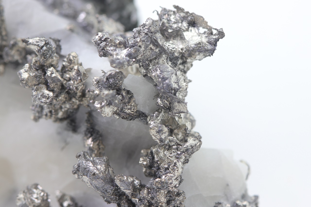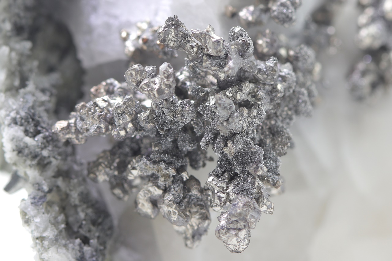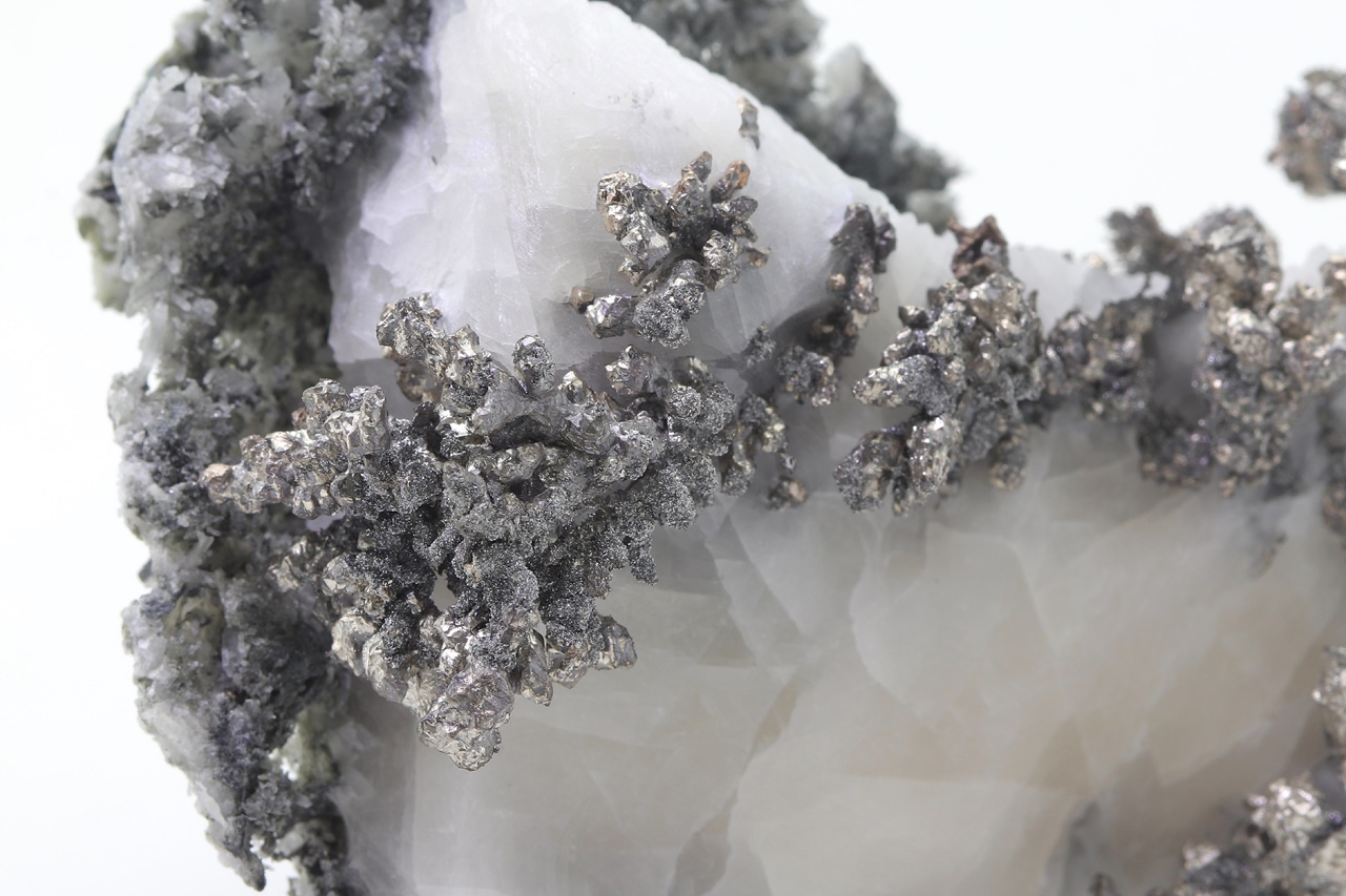 Wunderschönes Exemplar von reinem Silber, in dendritischen Formen wachsend mit einzelnen Kristallen bis zu 3 mm aus weißem Kalkstein herausragend.