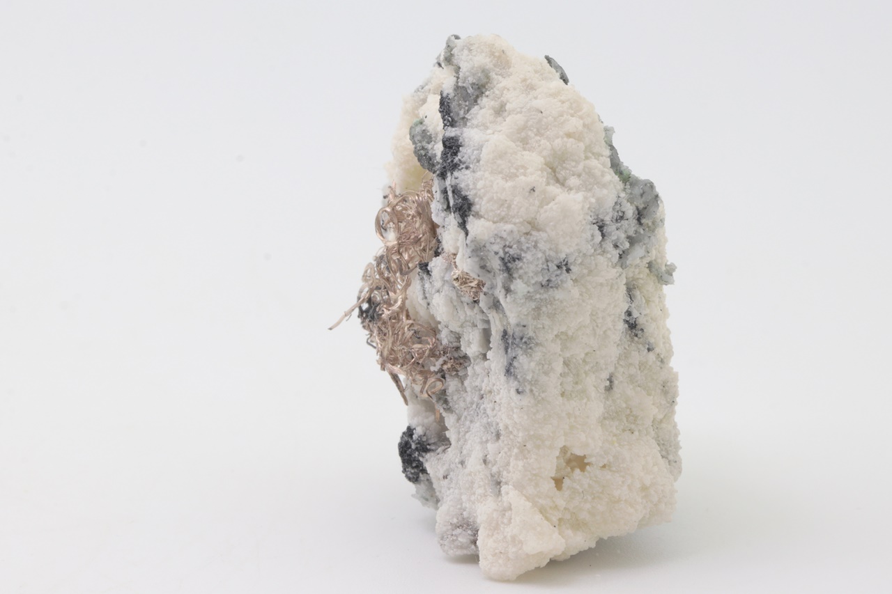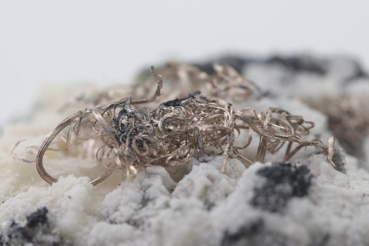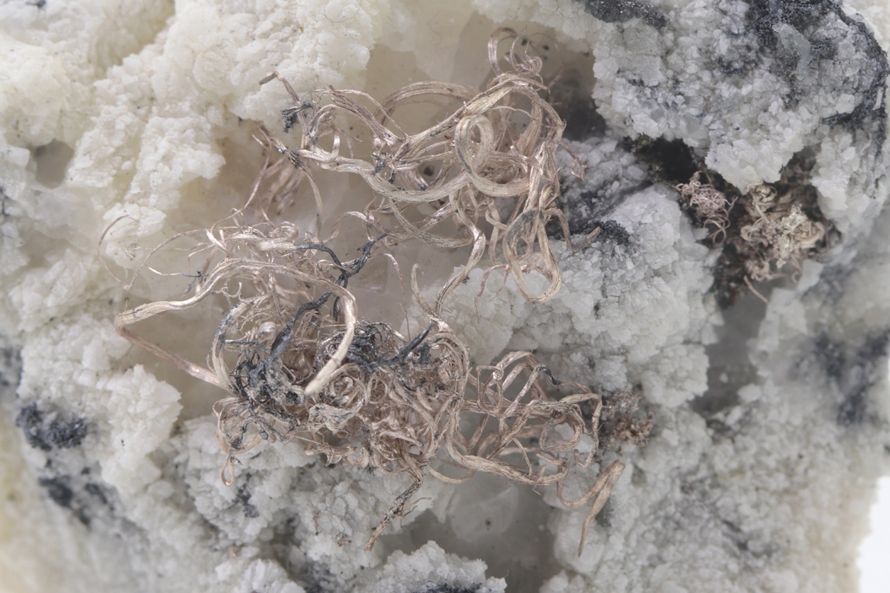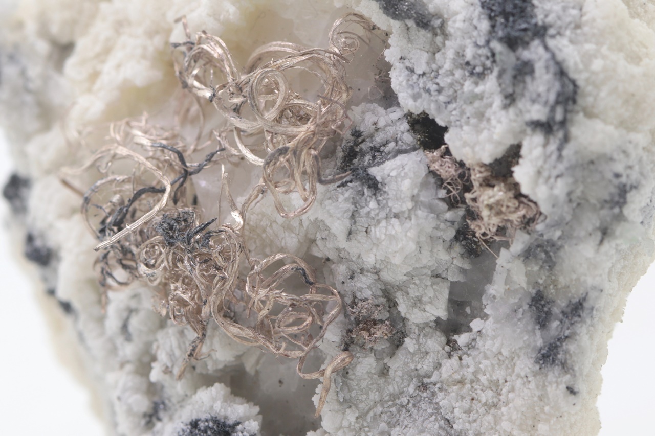 Ein herrliches Exemplar großer Flöze aus reinem Silber, aufgewachsen auf weißem Kalkstein. Silber bildet auf diese Weise gut entwickelte, abgerundete Drähte relativ selten, was dieses Stück sehr außergewöhnlich macht .