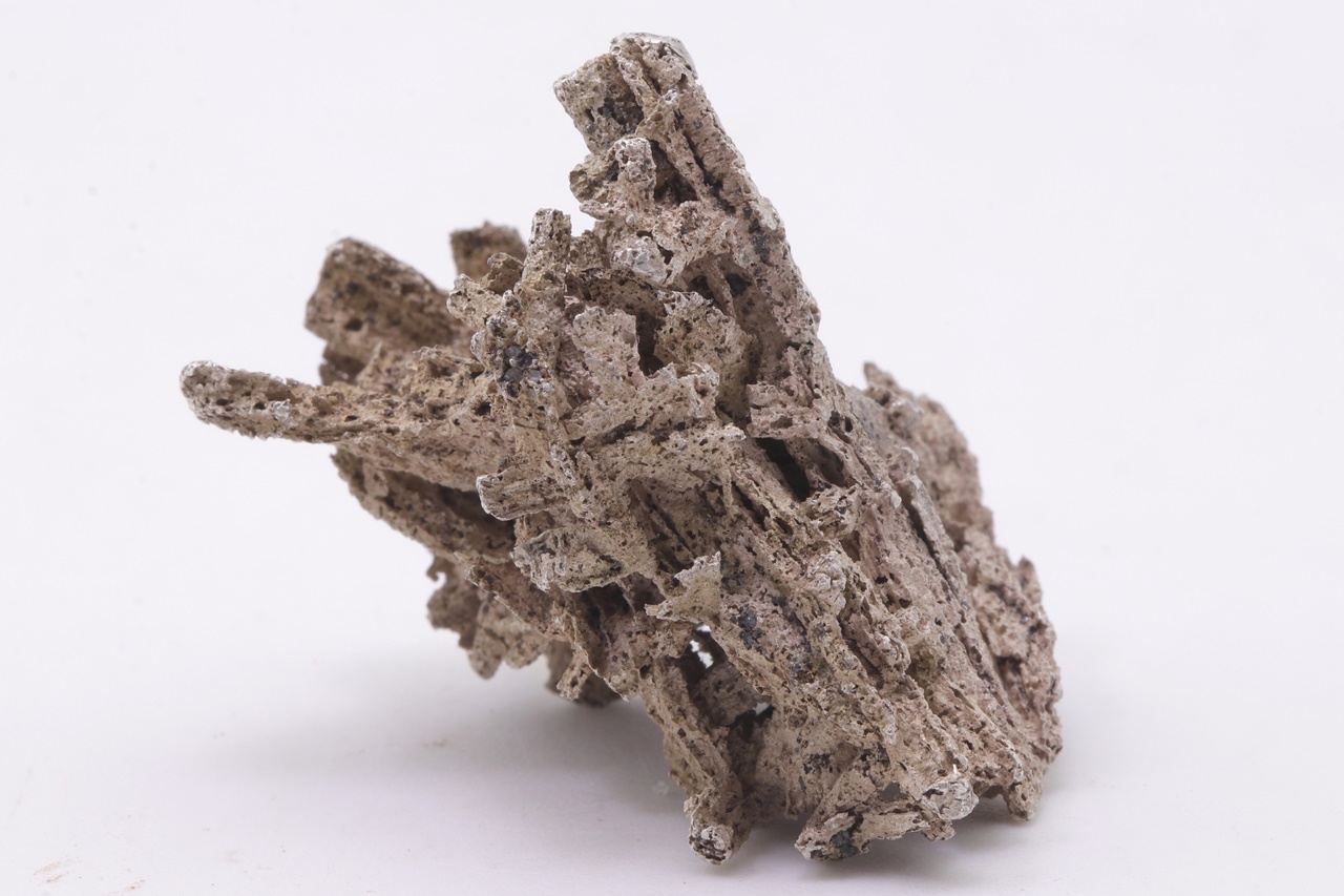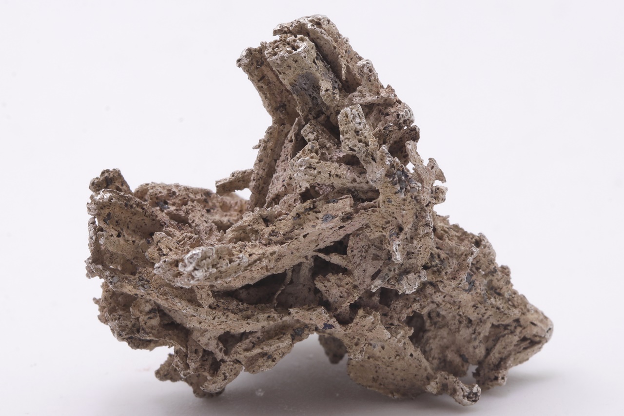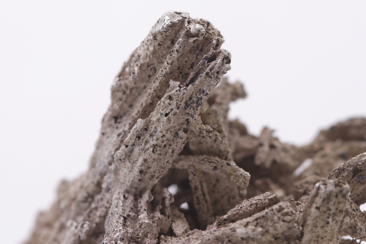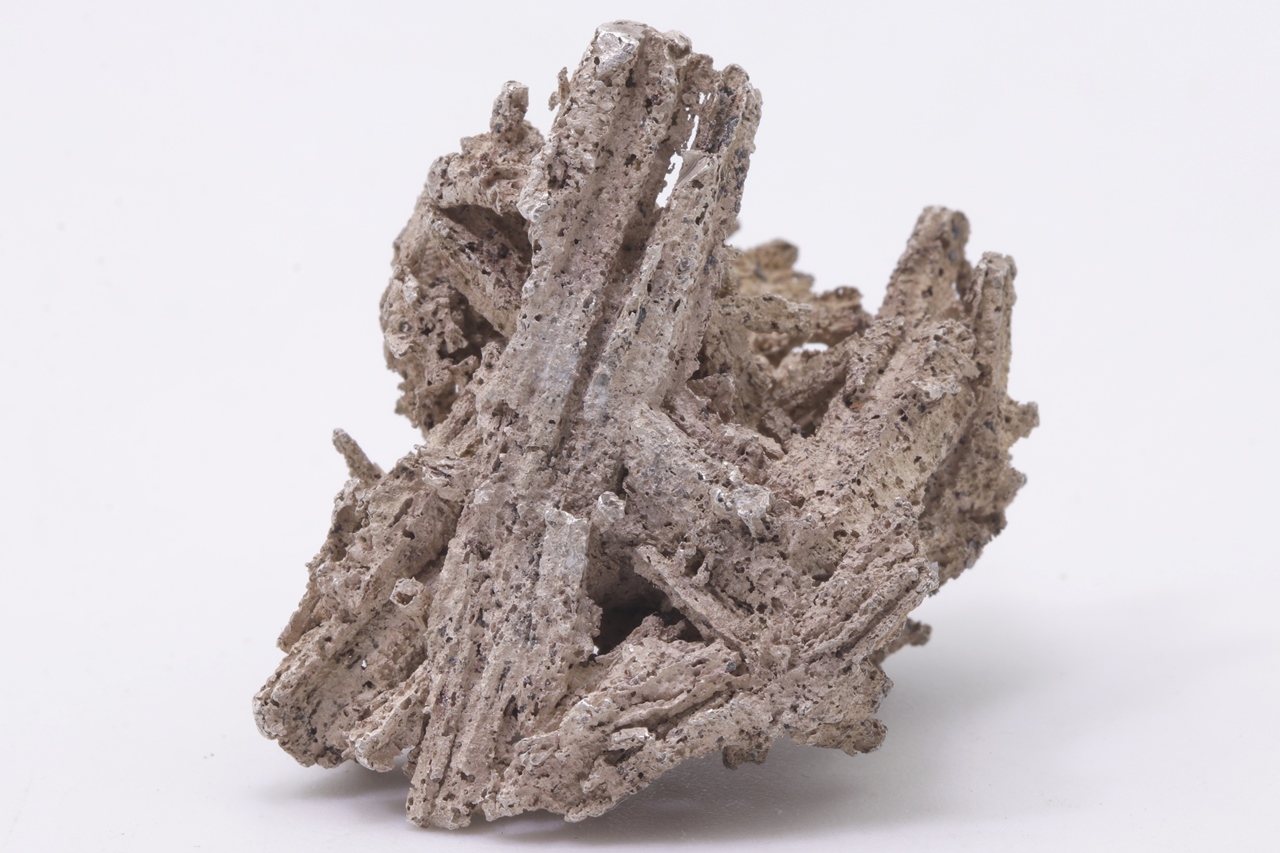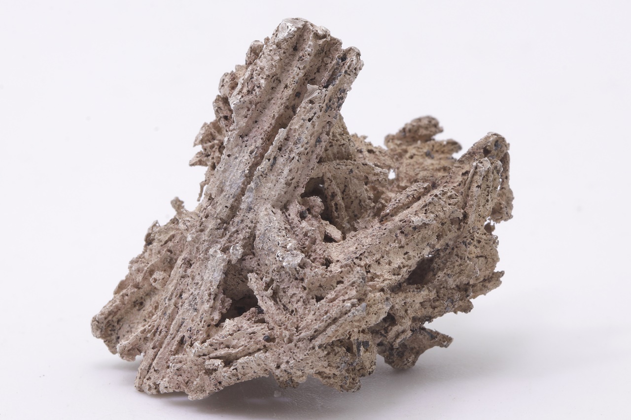 Reines, poröses Silber, das säulenförmige Dyskrazit-Kristalle ersetzt. Die längste Säule ist 3,5 cm lang.