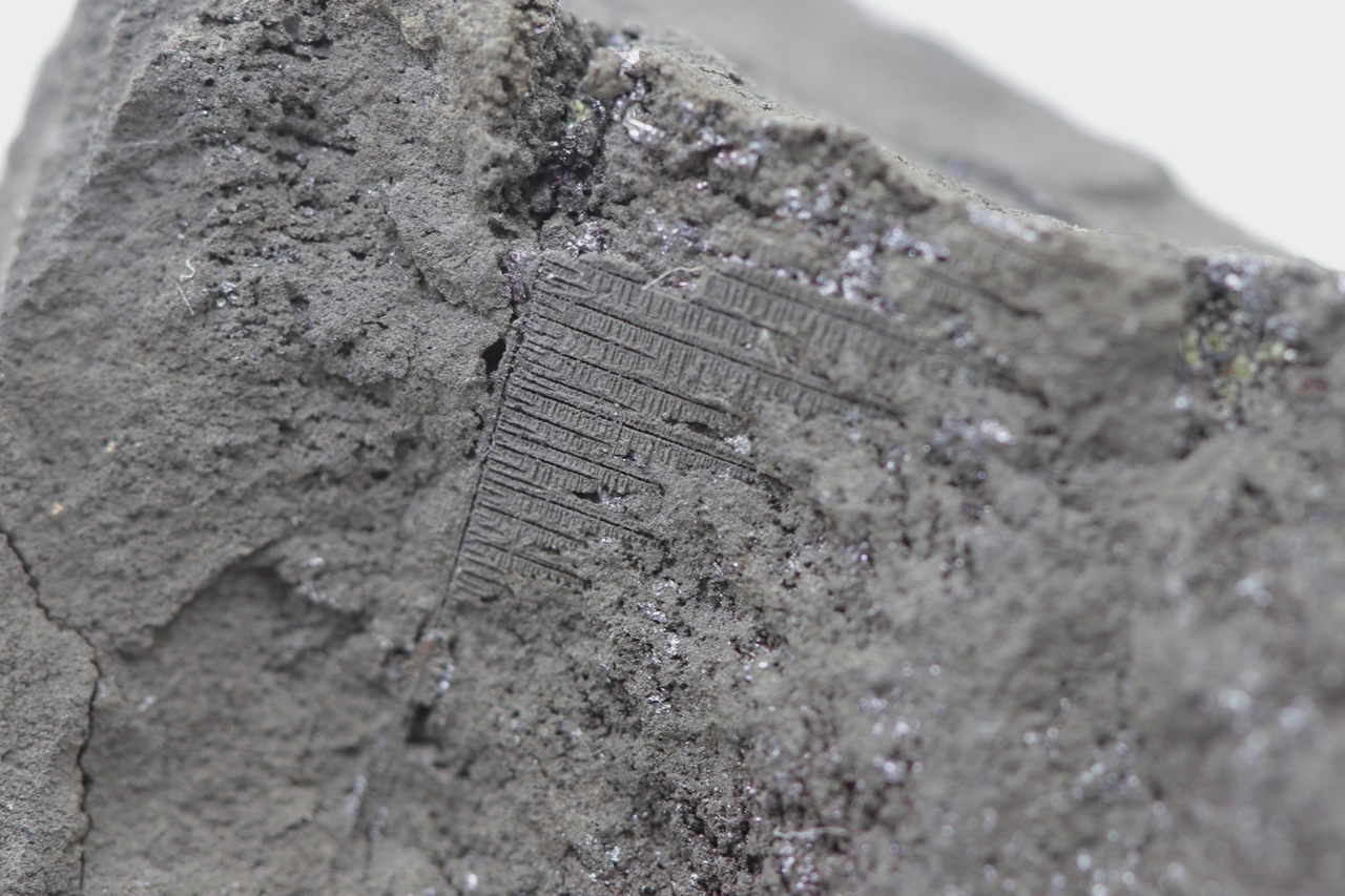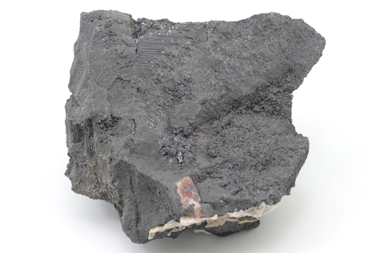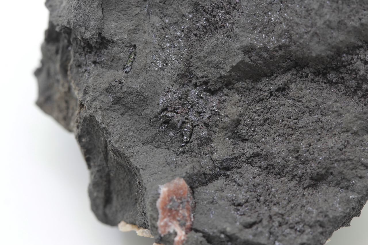 Ein massives Muster von graubraunem Arsen mit skelettartigen Strukturen, die sich nach dem Auslaugen von Silber gebildet haben. Diese Strukturen enthalten sehr kleine, glasartig glänzende Kristalle von rotem Proustit. Das Silber bildet sehr kleine grauschwarze Aggregate, die auf dem Arsen wachsen. Diese Probe ist untypisch für diesen Stollen, aber sehr ähnlich der Paragenese, die auf der 5. Sohle des Bergwerks Svornost gefunden wurde .