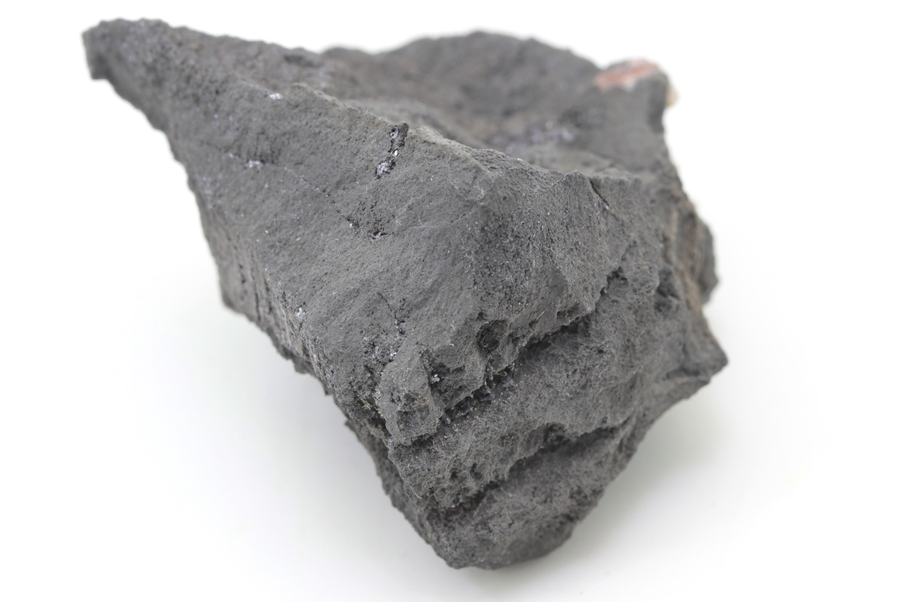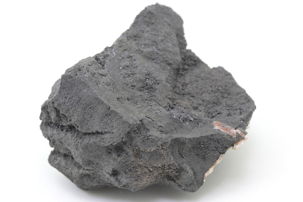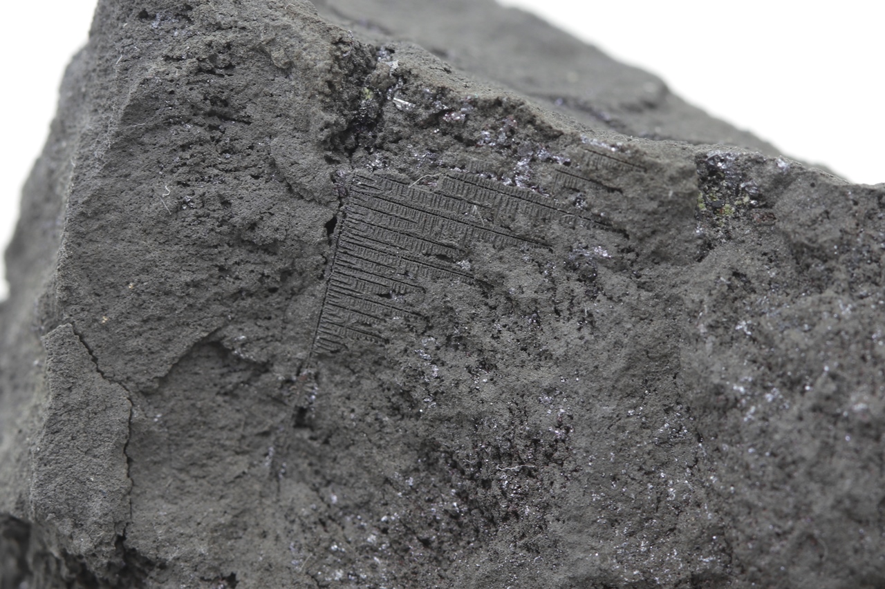 Ein massives Muster von graubraunem Arsen mit skelettartigen Strukturen, die sich nach dem Auslaugen von Silber gebildet haben. Diese Strukturen enthalten sehr kleine, glasartig glänzende Kristalle von rotem Proustit. Das Silber bildet sehr kleine grauschwarze Aggregate, die auf dem Arsen wachsen. Diese Probe ist untypisch für diesen Stollen, aber sehr ähnlich der Paragenese, die auf der 5. Sohle des Bergwerks Svornost gefunden wurde .