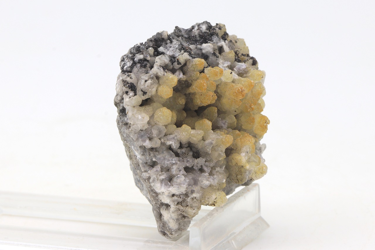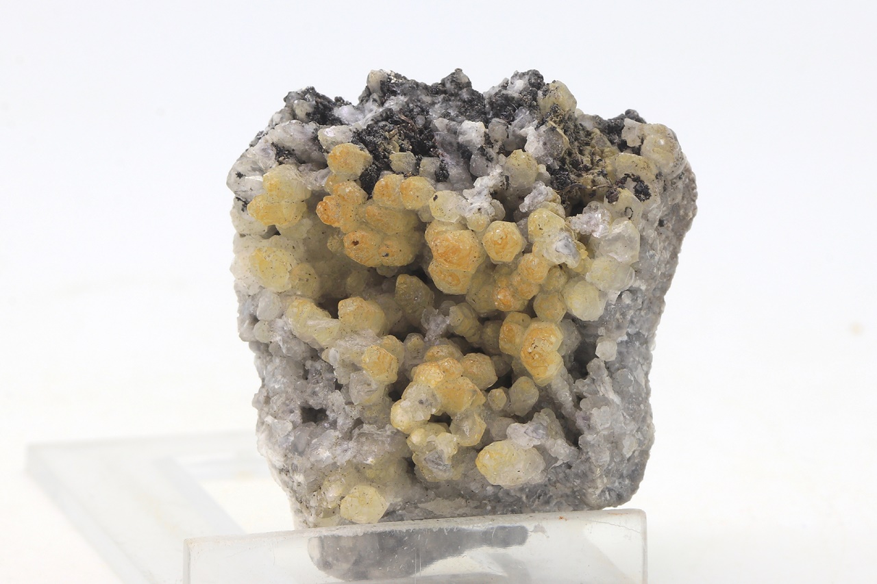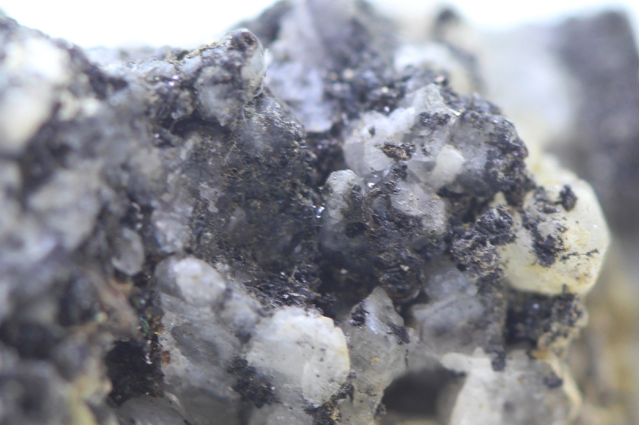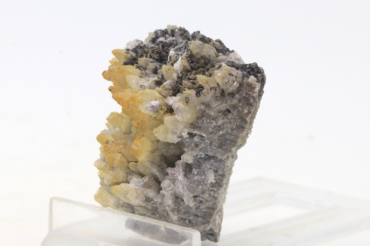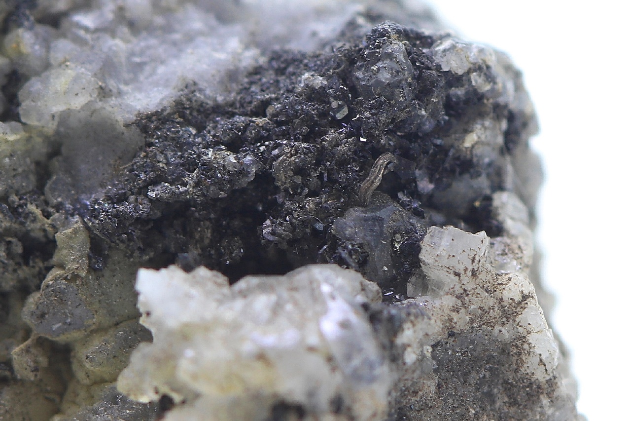 Druse von Calcit auf der Oberseite reichlich bewachsen mit Drähten aus reinem Silber mit kleinen, tafelförmigen Kristallen von Pyrhotin.