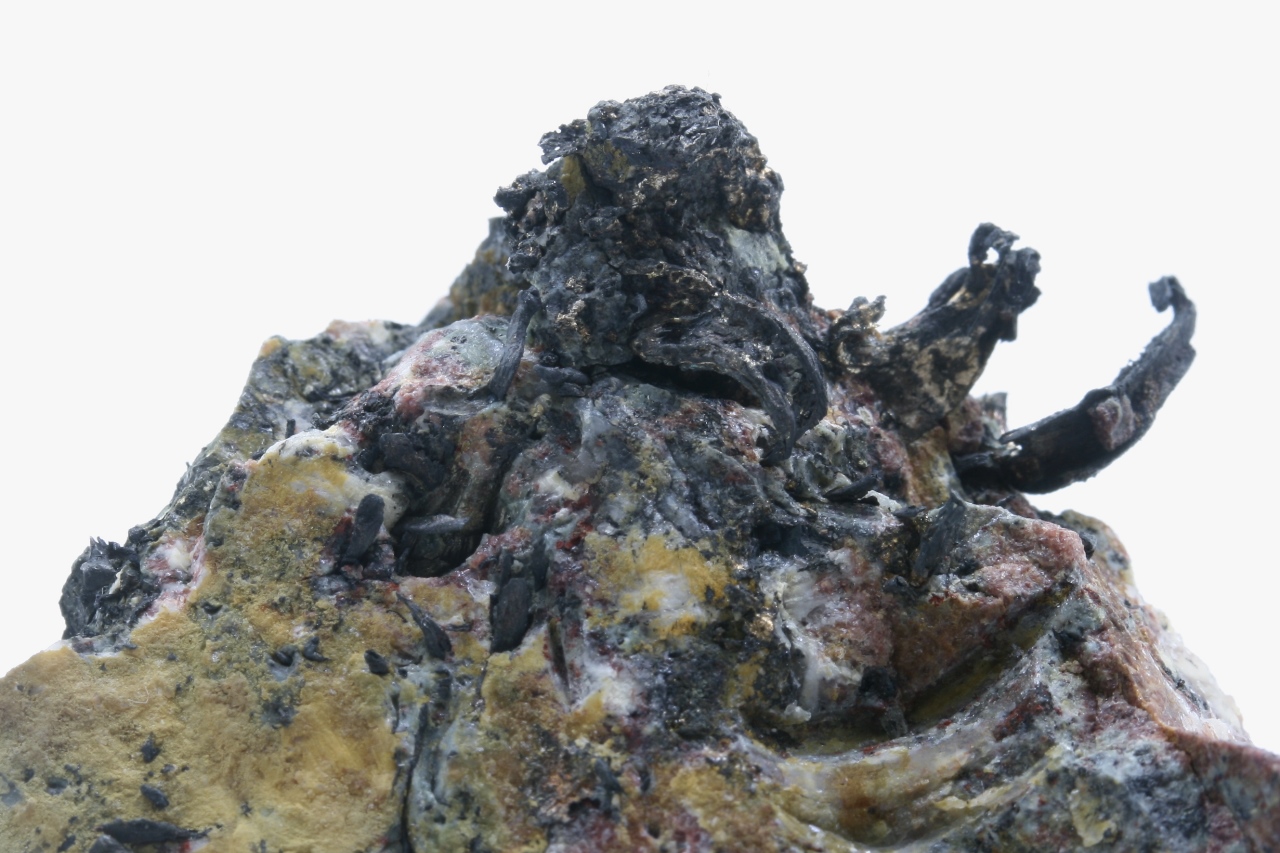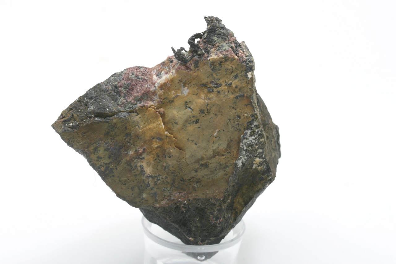 Hellrosa Rhodochrosit bewachsen mit Silberdrähten. Der größte Draht ist 10 mm groß.