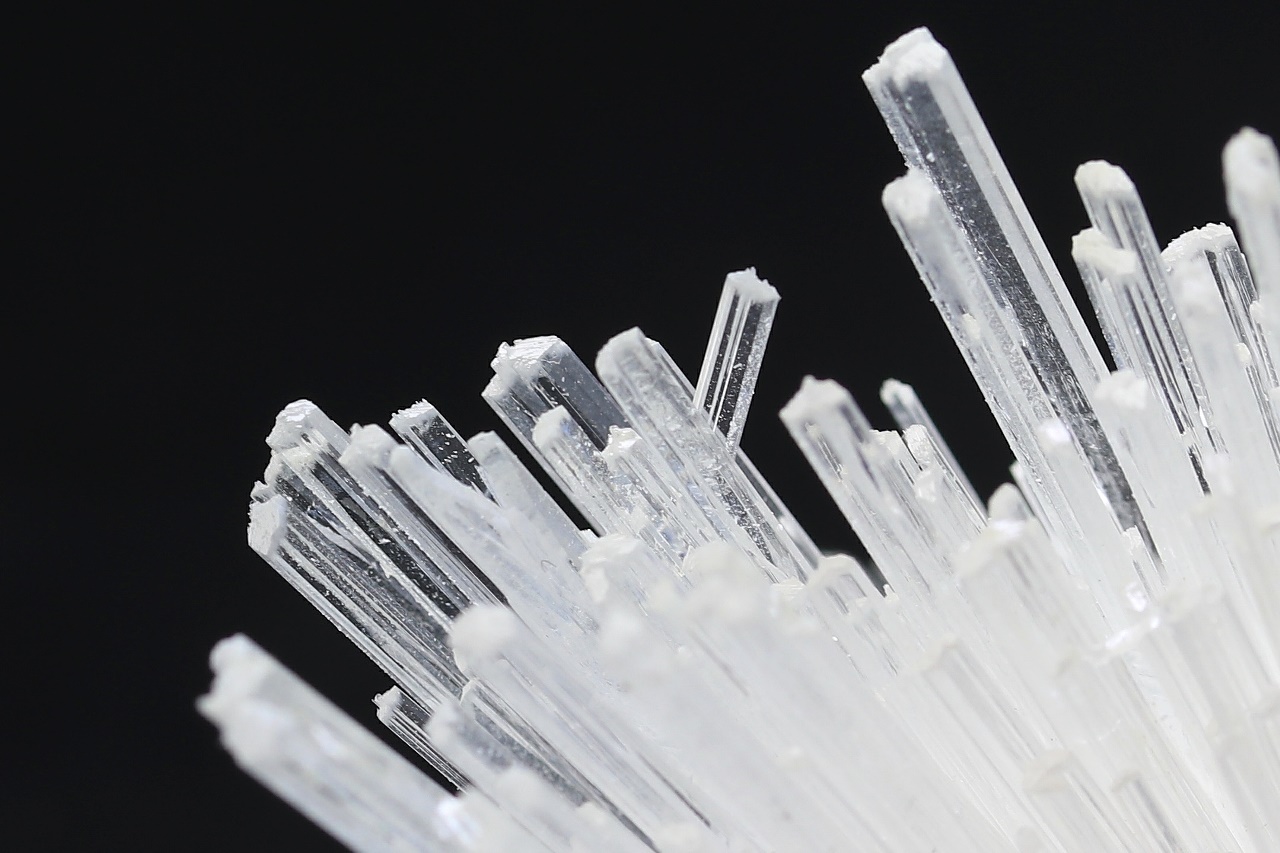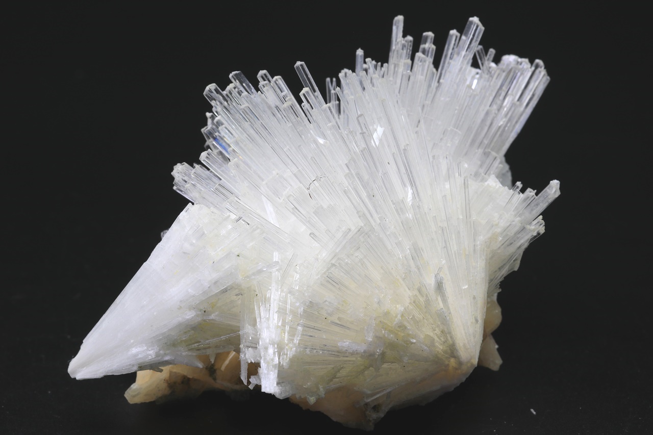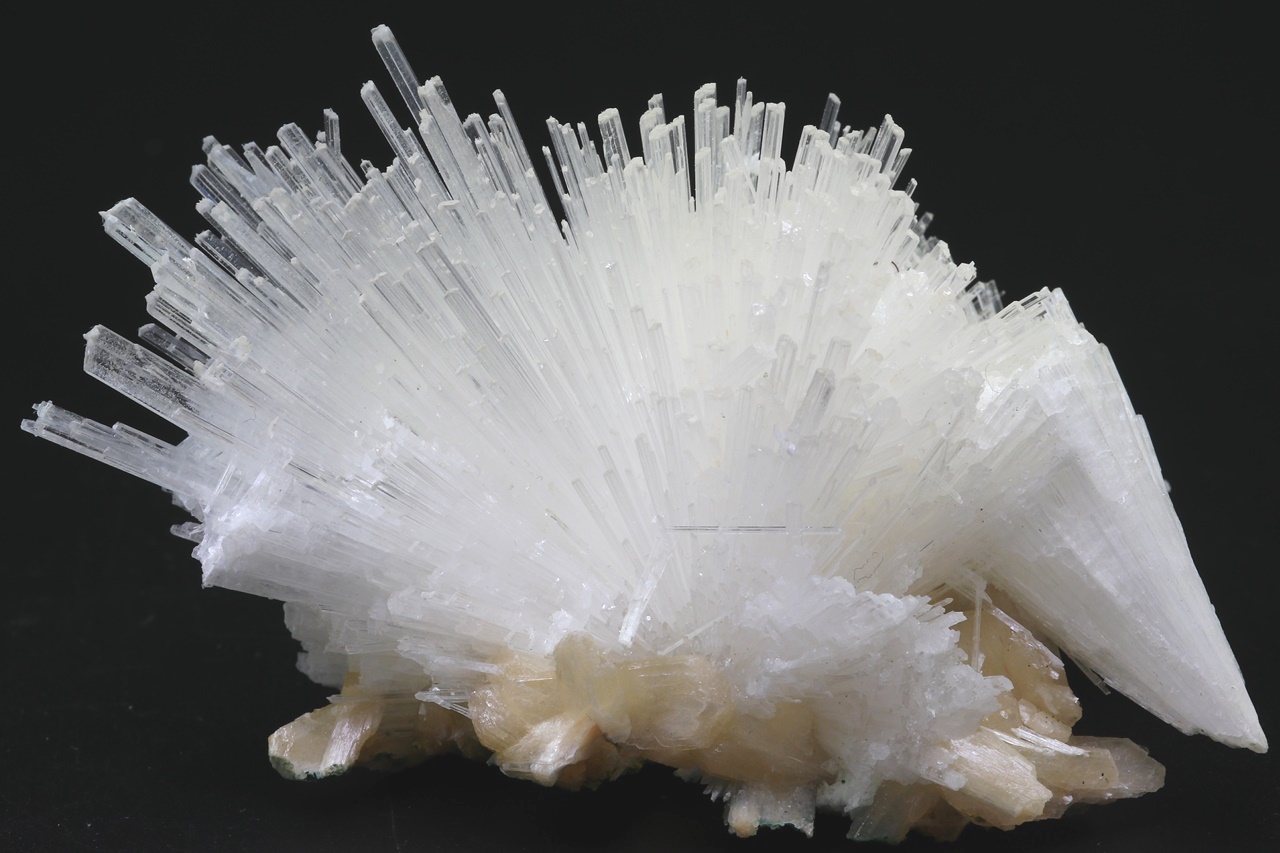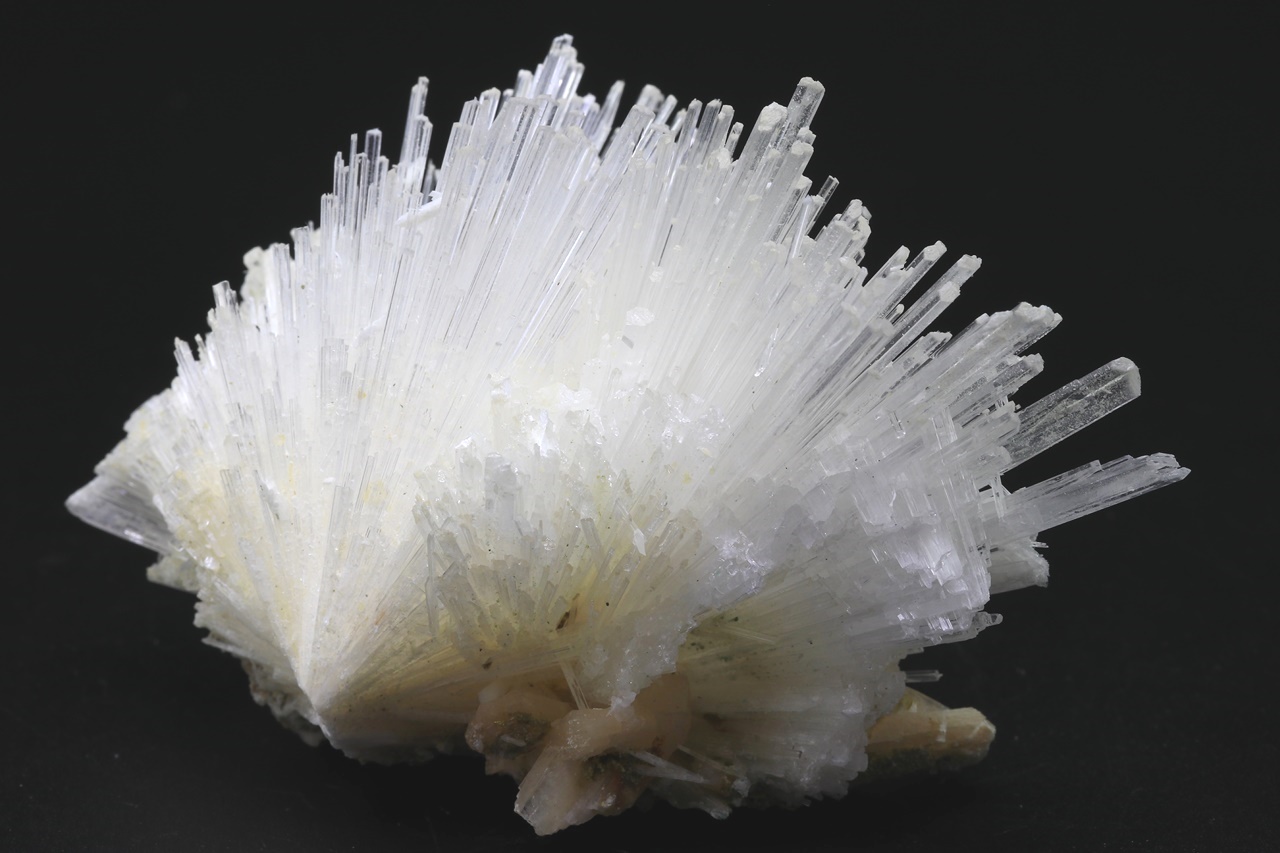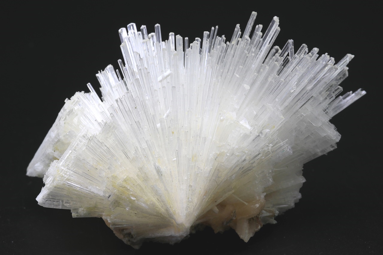 Radiär gewachsene Kristalle von klarem Skolezit von bis zu 6 cm Größe mit hellrosa Skolezit. Die Probe muss im Geschäft abgeholt werden.