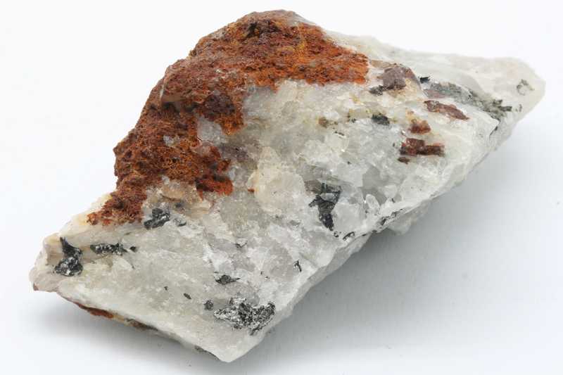Probe von Scorodit aus Horní Slavkov. Probe von schwarzen Scoroditkörnern im Quarz .