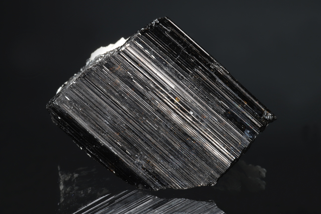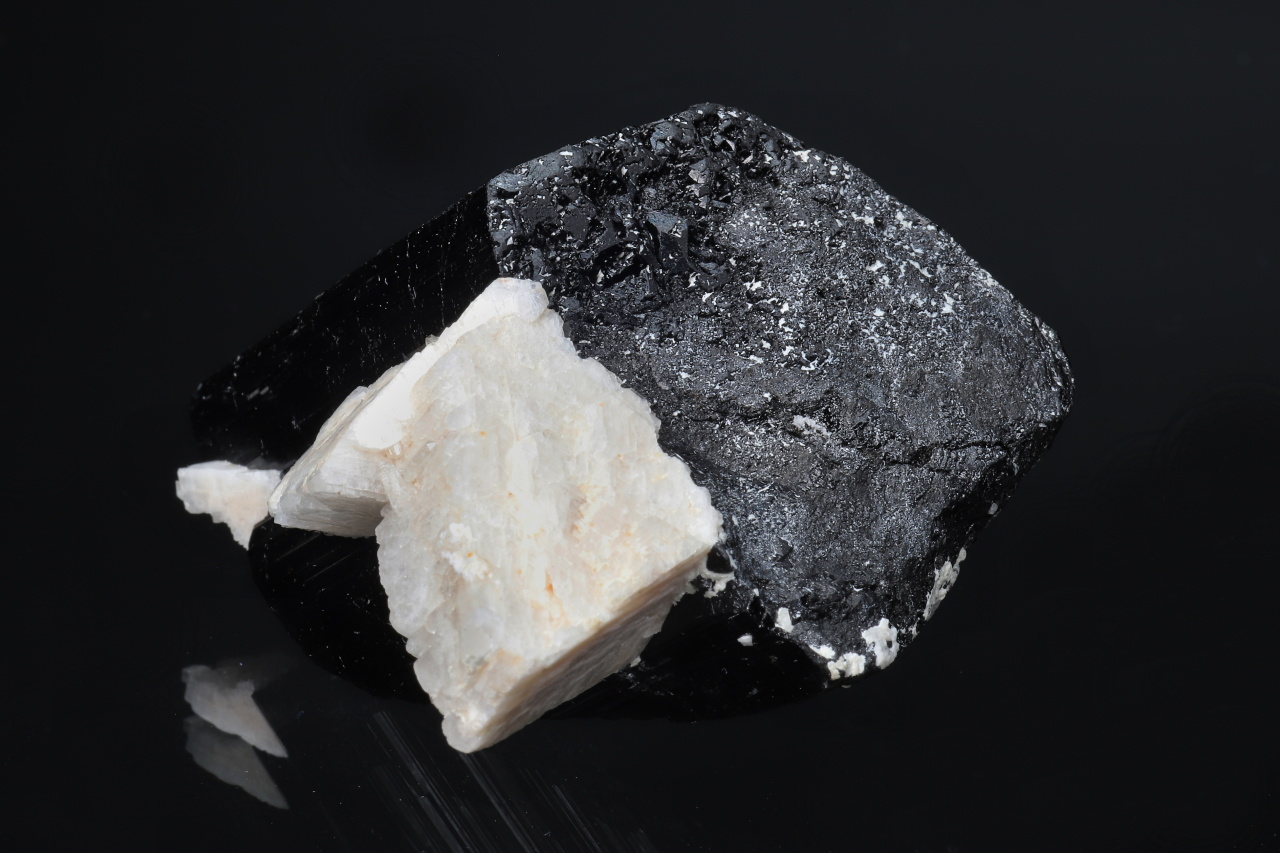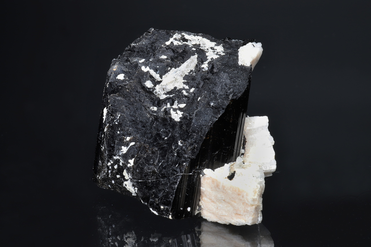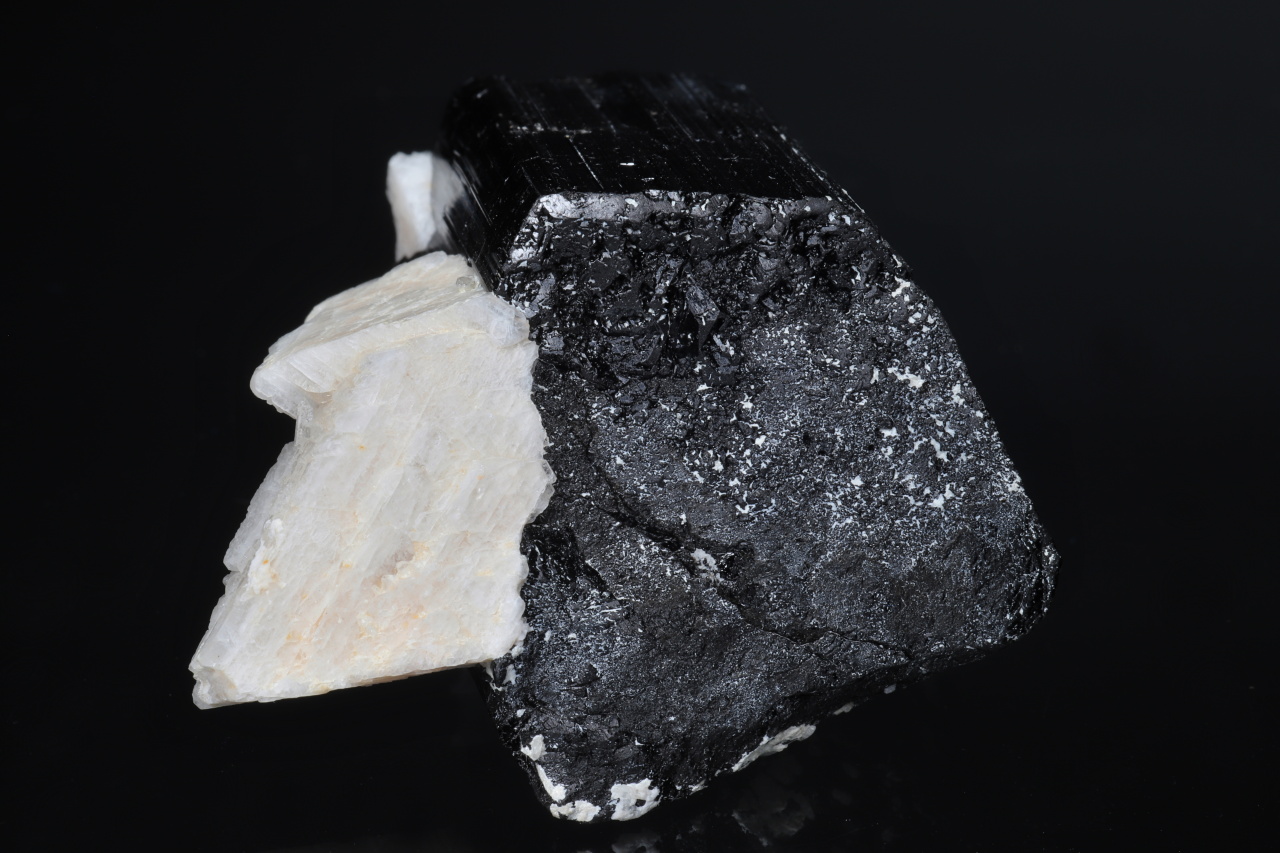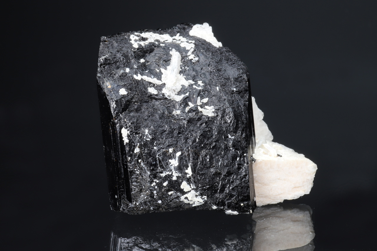 Dicke säulenförmig gerillte, glänzende Skoryl-Kristalle, die natürlich geheilt und mit Kristallen aus weißem Albit bewachsen sind. Schönes Beispiel für Minerale aus den Pegmatit-Hohlräumen in Dolní Bory.