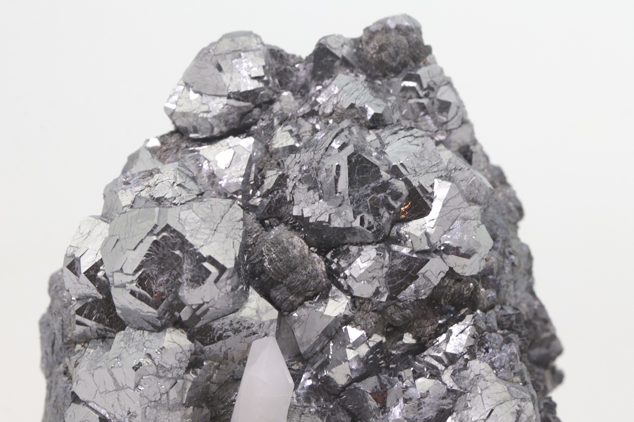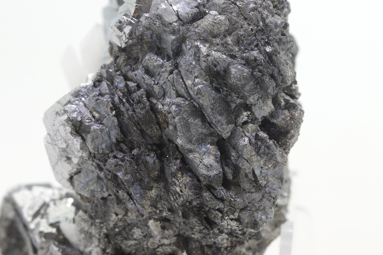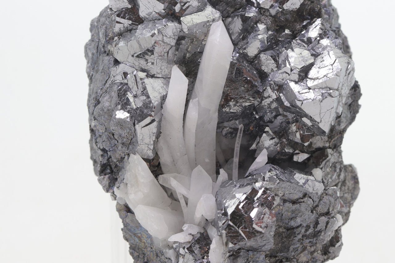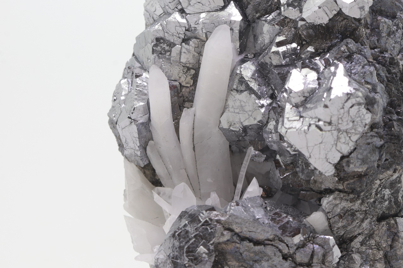 Wunderschöne, bis 1,5 cm große, metallisch glänzende Kristalle des Skutterudits, gewachsen auf mattem, grauem Löllingit, der kugelförmige Aggregate bildet. Die Stufe wird dann von gebogenen Kristallen des weißen Quarzes überwachsen .