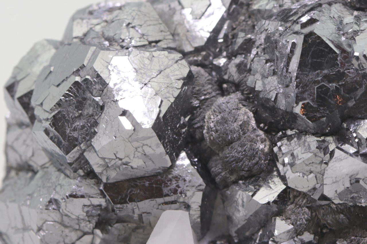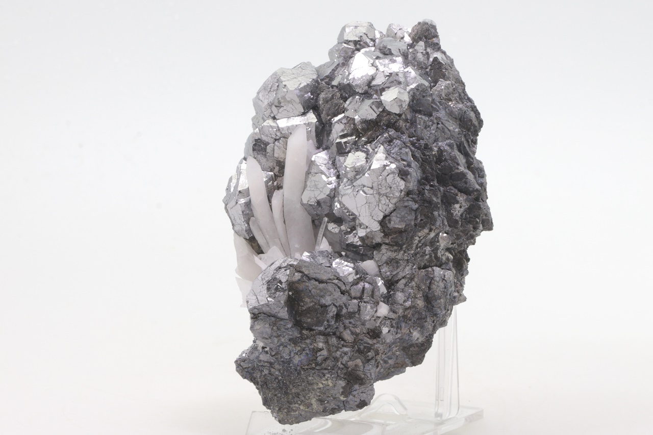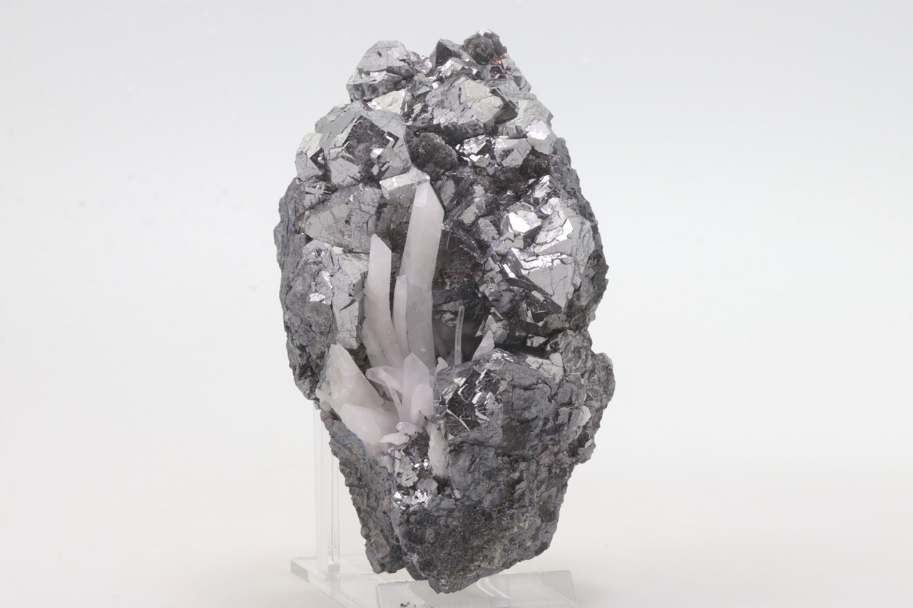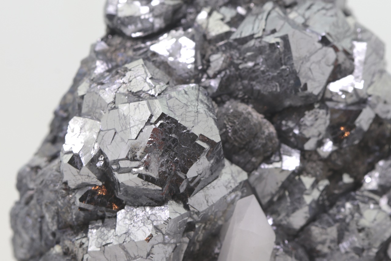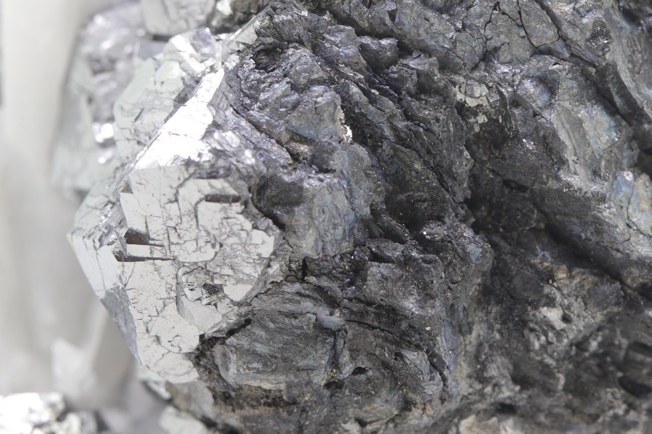 Wunderschöne, bis 1,5 cm große, metallisch glänzende Kristalle des Skutterudits, gewachsen auf mattem, grauem Löllingit, der kugelförmige Aggregate bildet. Die Stufe wird dann von gebogenen Kristallen des weißen Quarzes überwachsen .