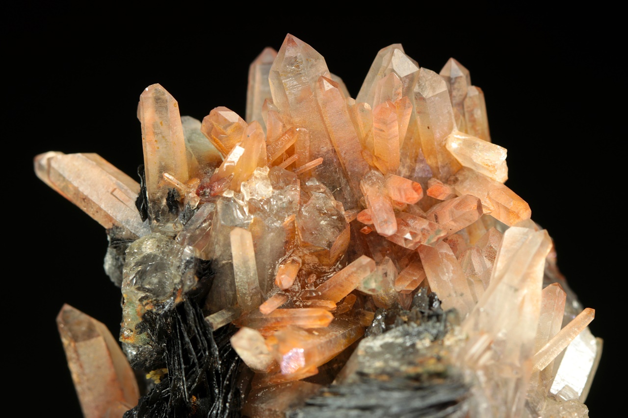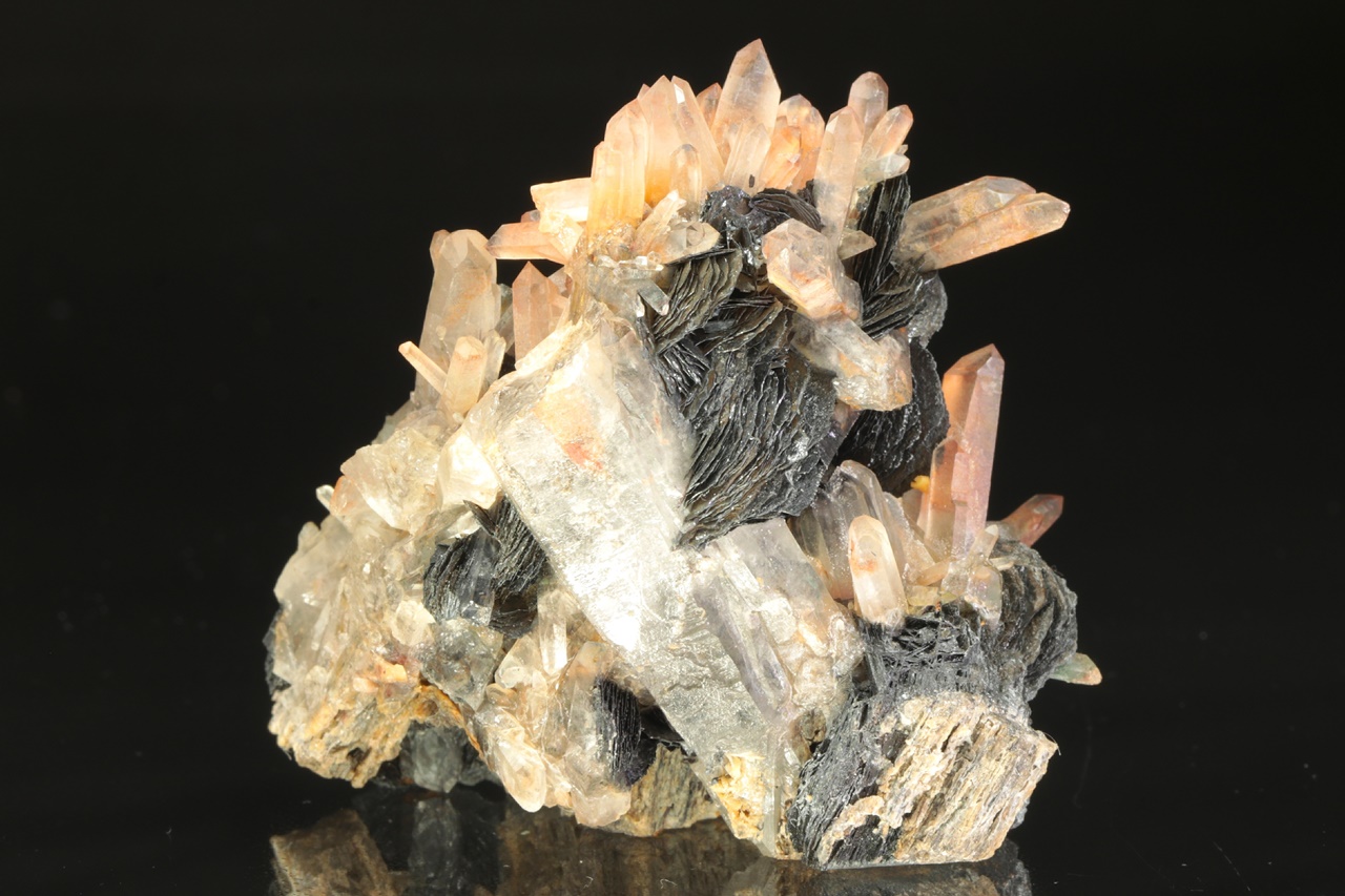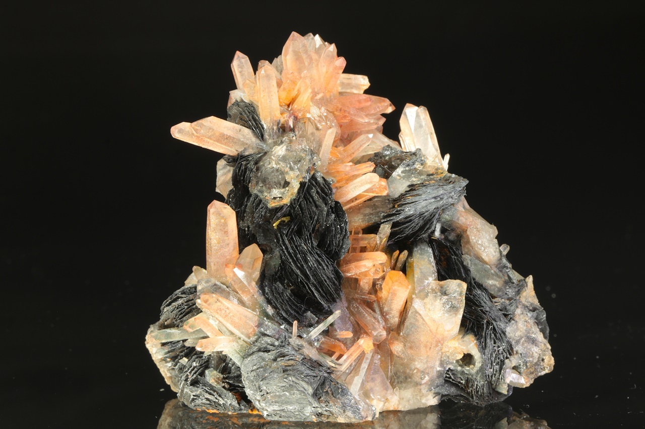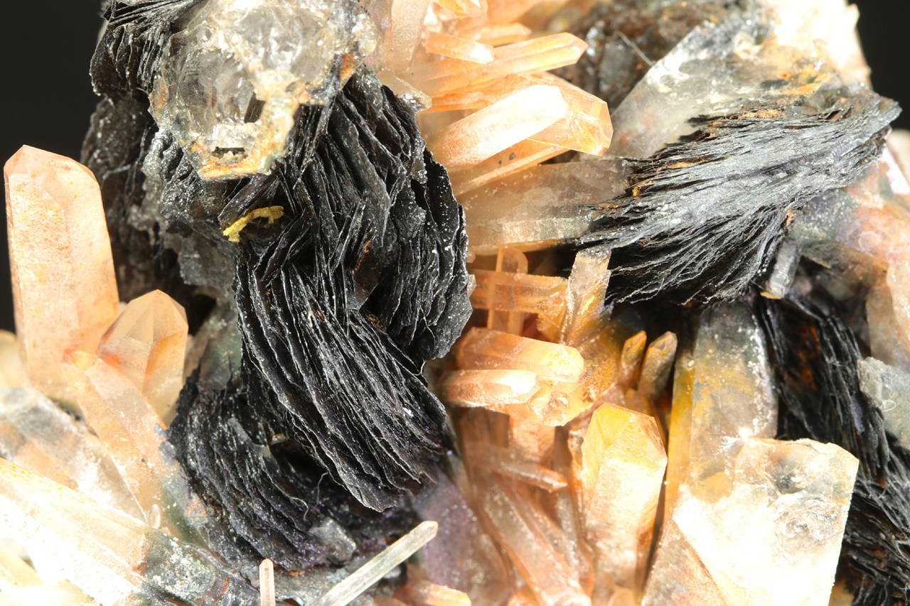 Büschel von schwarzen, tafelförmigen Hematitkristallen, manchmal „Alpenrose“ genannt, mit einem rötlichen Kristall.