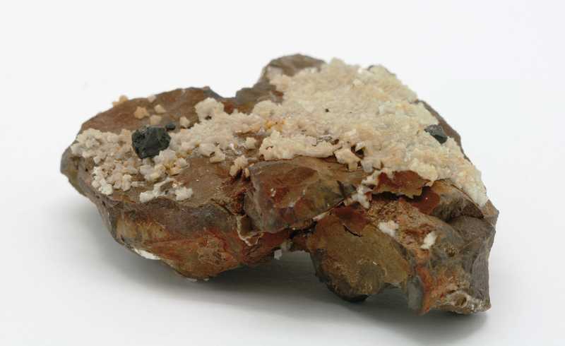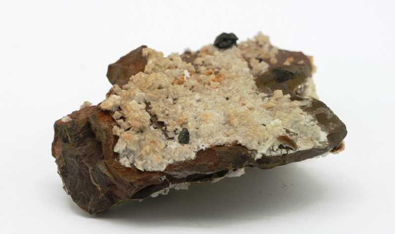 Interessantes Beispiel einer Pelosiderit-Konkretion, auf deren Klüften Ankeritkristalle wachsen, auf die ein metallisch glänzender Sfalerit-Kristall aufsitzt. Der größte Kristall ist 6 mm groß.