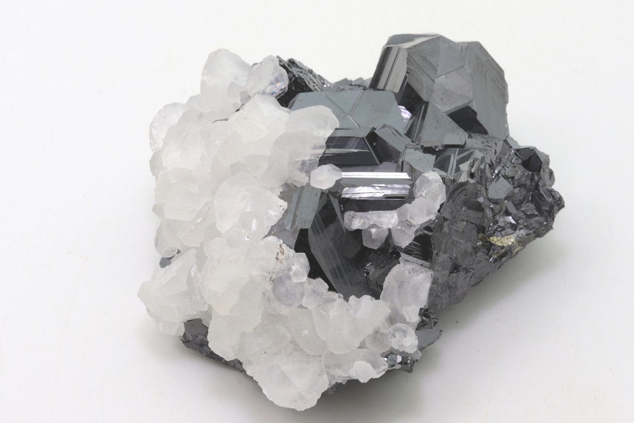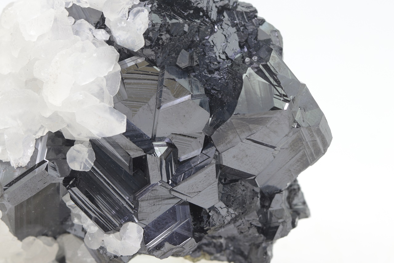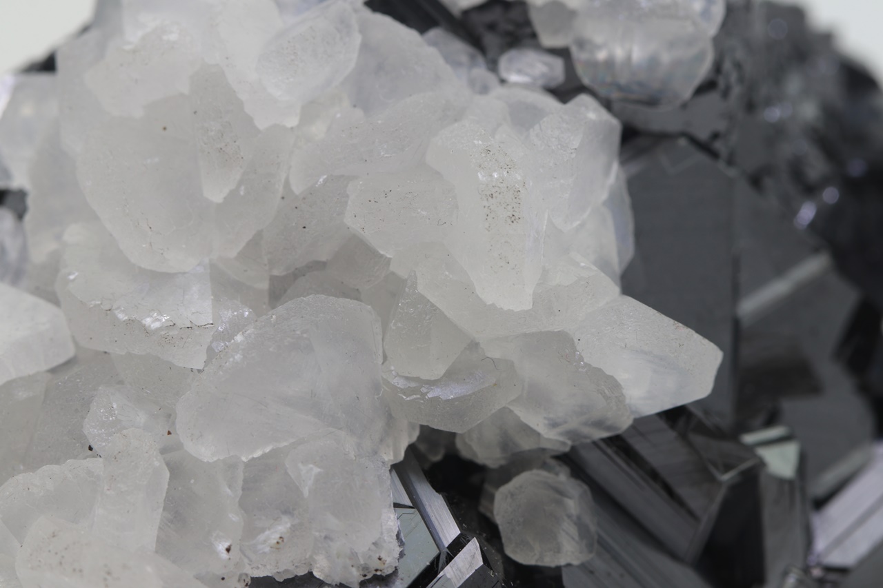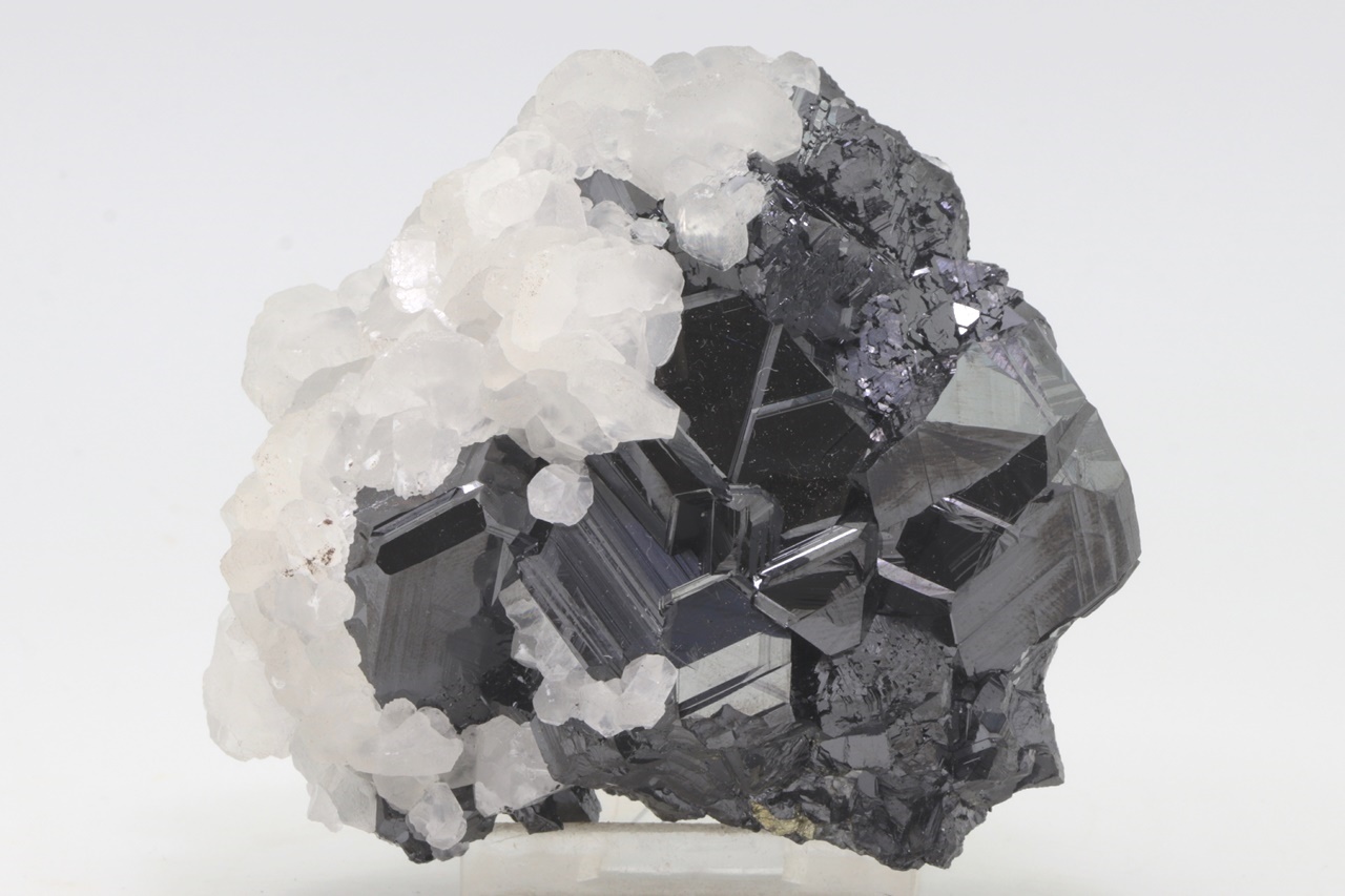 Außergewöhnlich glänzende, große (bis zu 2,5 cm), strahlenförmig gruppierte Kristalle schwarzen Sfalerits, bedeckt mit weißem, durchsichtigem Kalcit.
