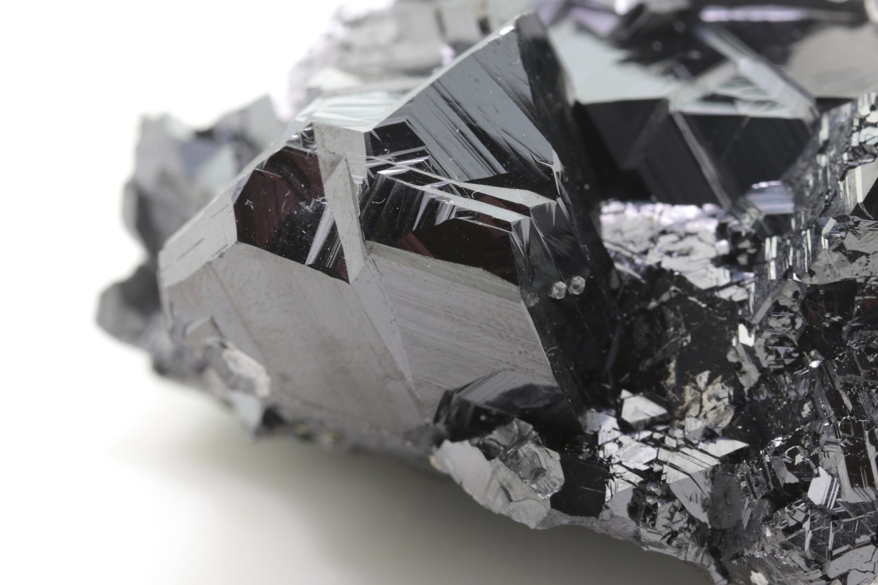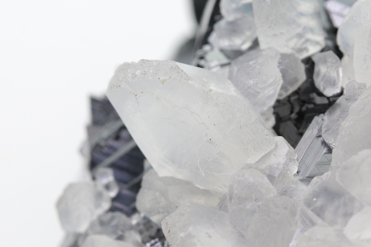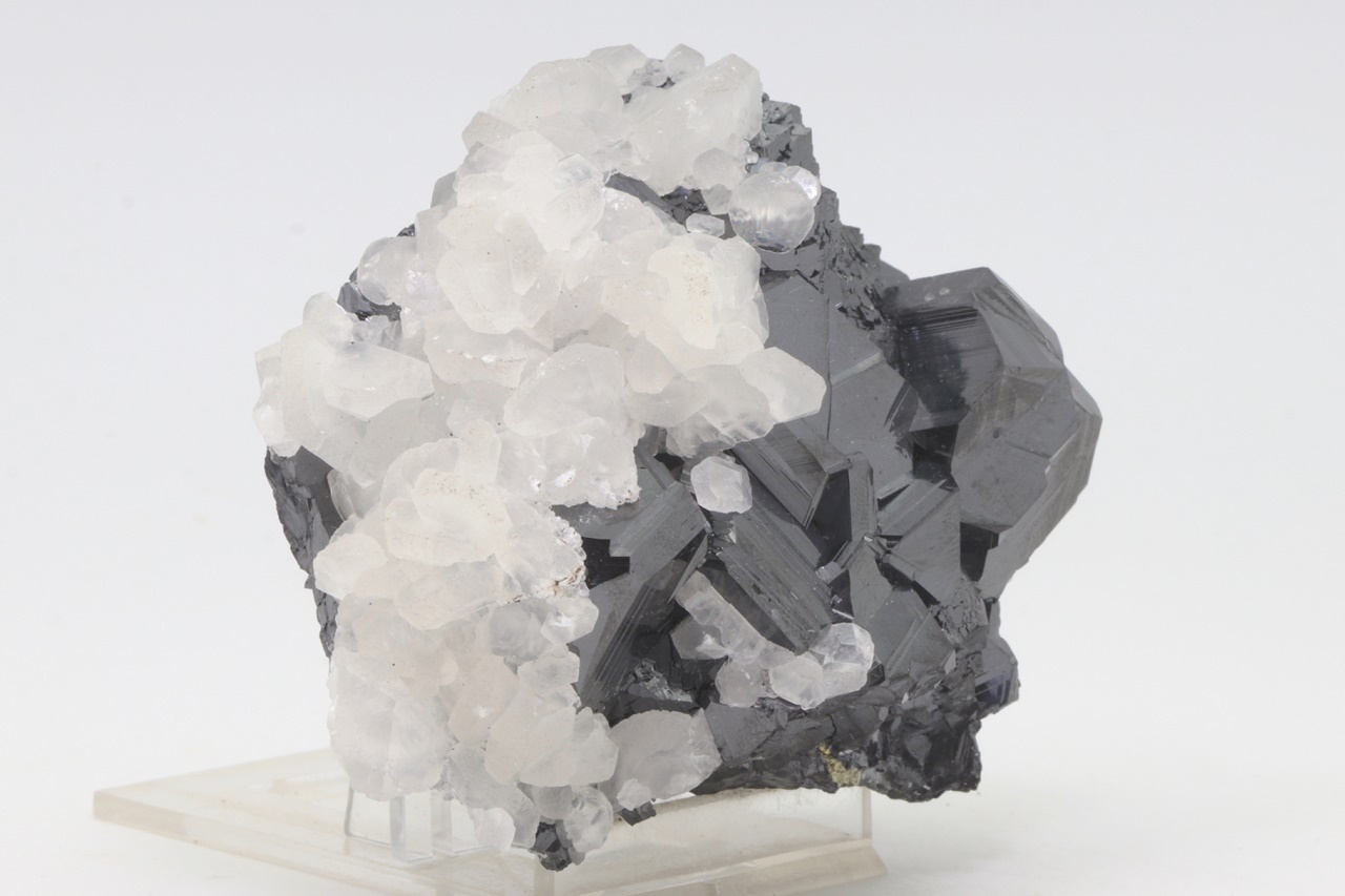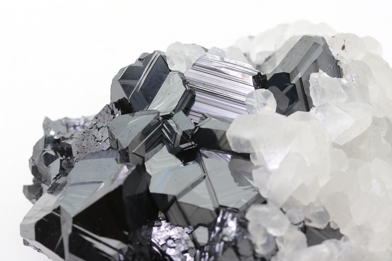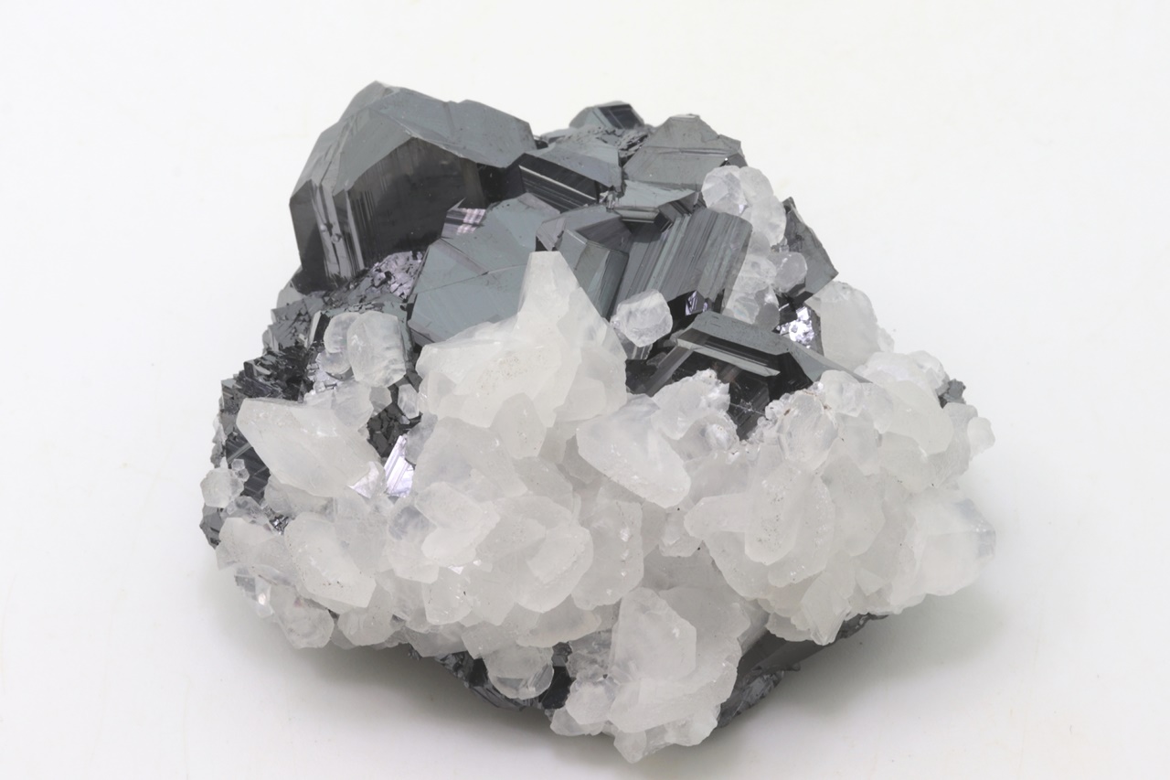 Außergewöhnlich glänzende, große (bis zu 2,5 cm), strahlenförmig gruppierte Kristalle schwarzen Sfalerits, bedeckt mit weißem, durchsichtigem Kalcit.