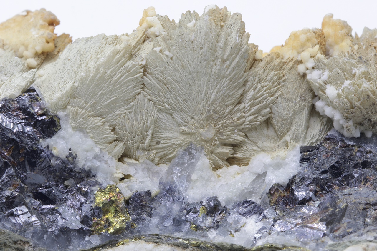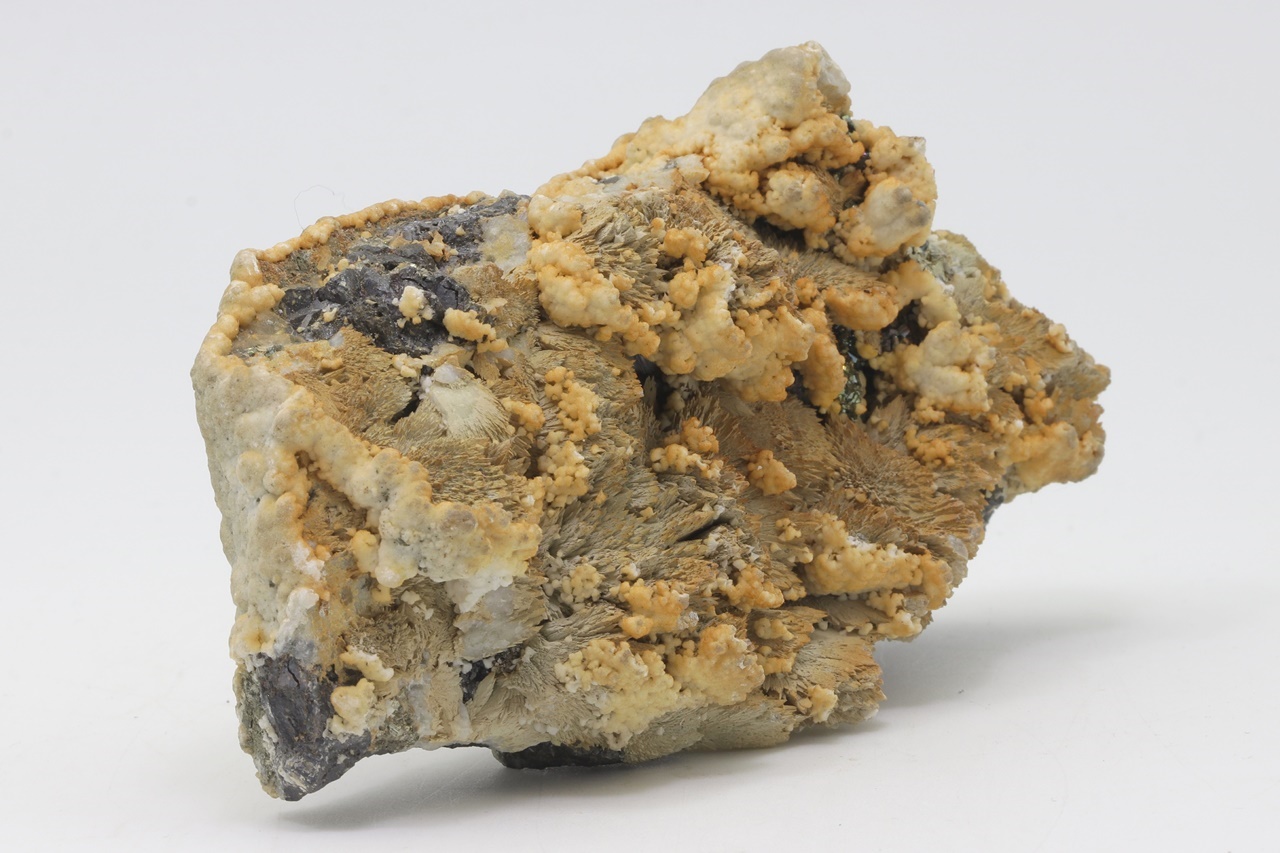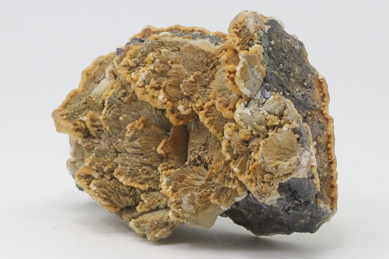 Gliedrige Kristalle des beigen Dolomits, überwachsen mit ockerfarbenem Kalcit, gewachsen auf schwarzem Sphalerit.