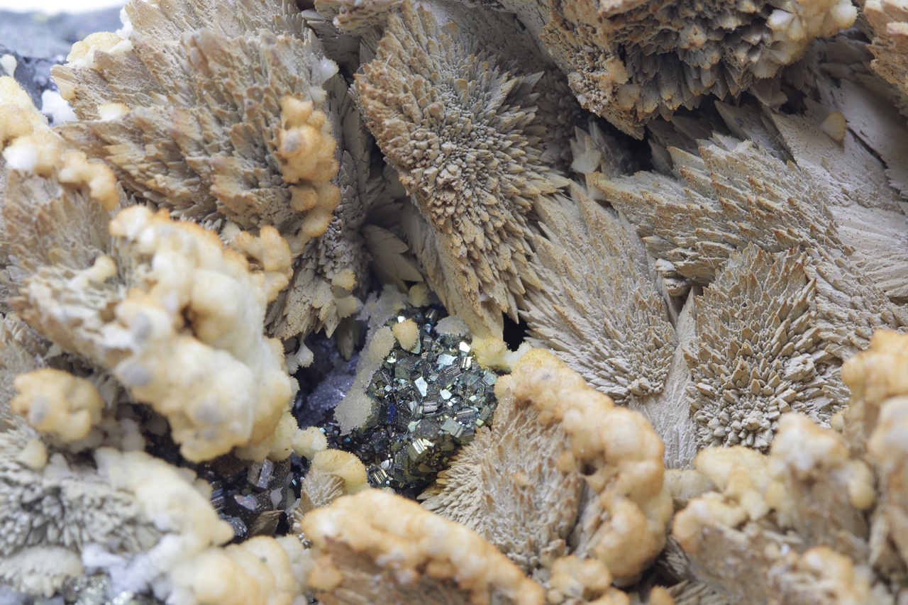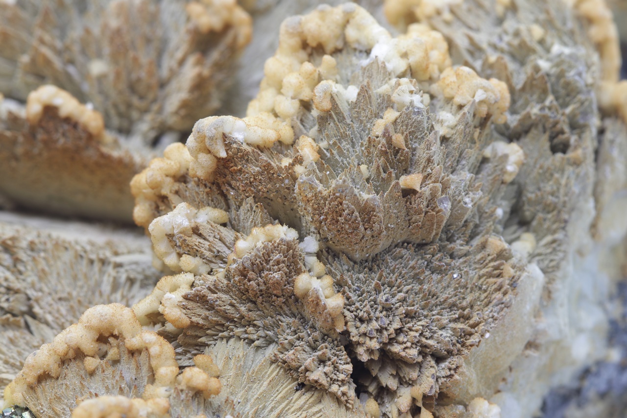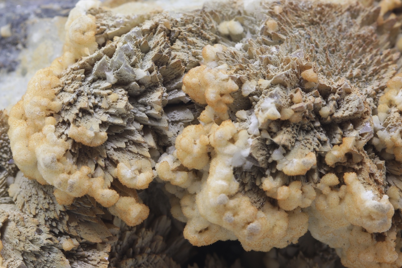 Gliedrige Kristalle des beigen Dolomits, überwachsen mit ockerfarbenem Kalcit, gewachsen auf schwarzem Sphalerit.