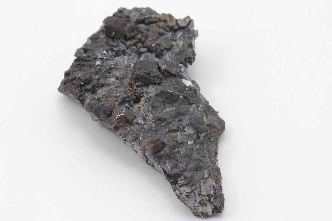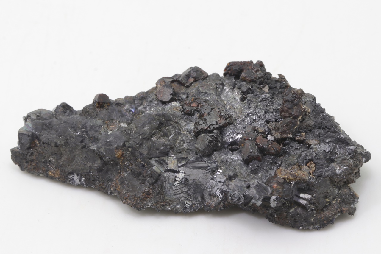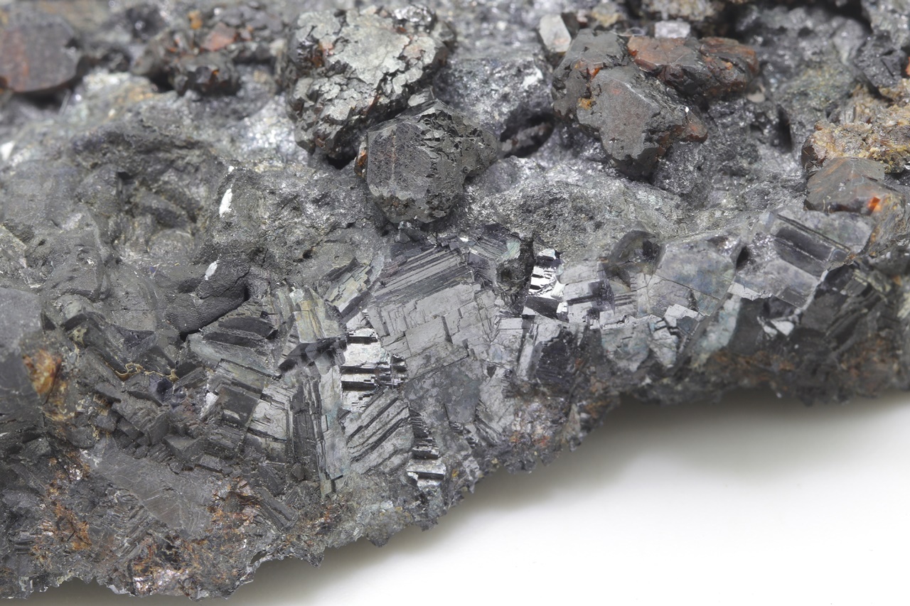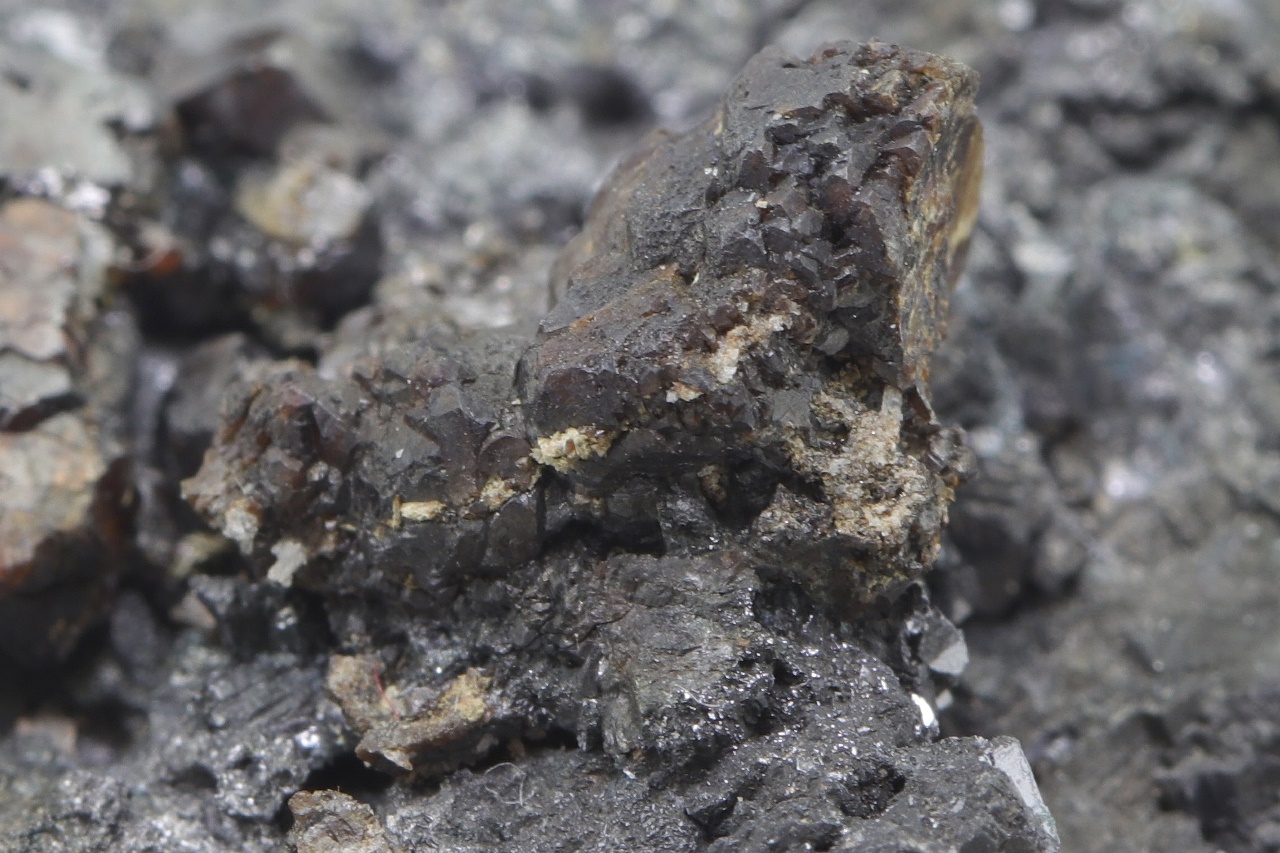 Graue Kristalle von Galenit, bewachsen mit bis zu 7 mm großen, dunkelbraunen Kristallen von Sfalerit.