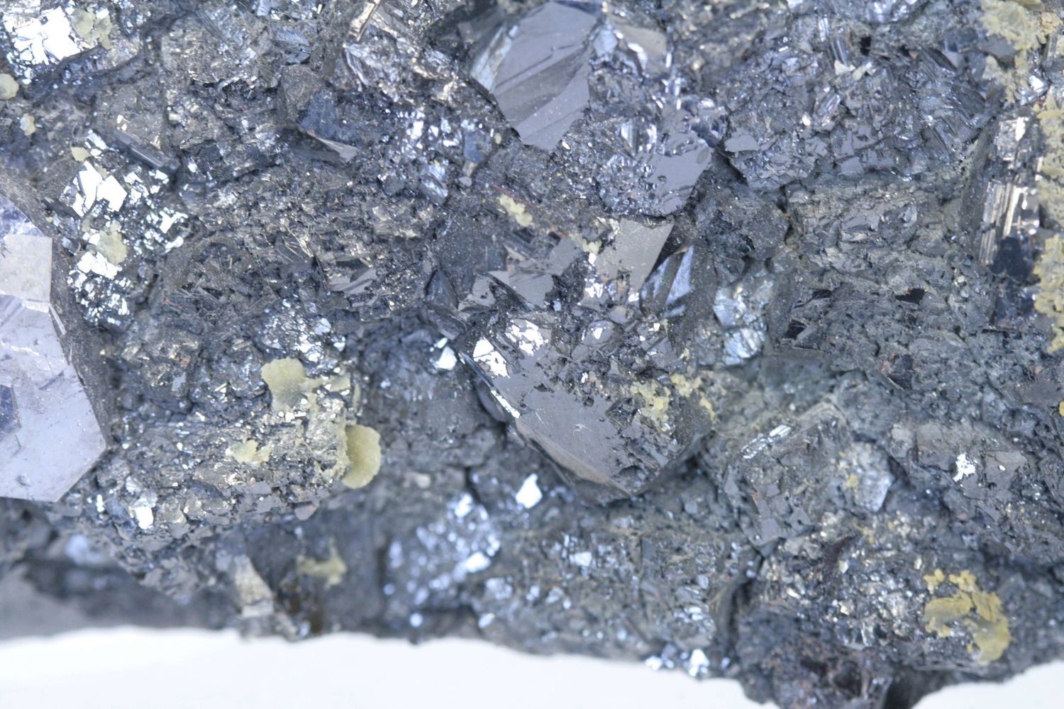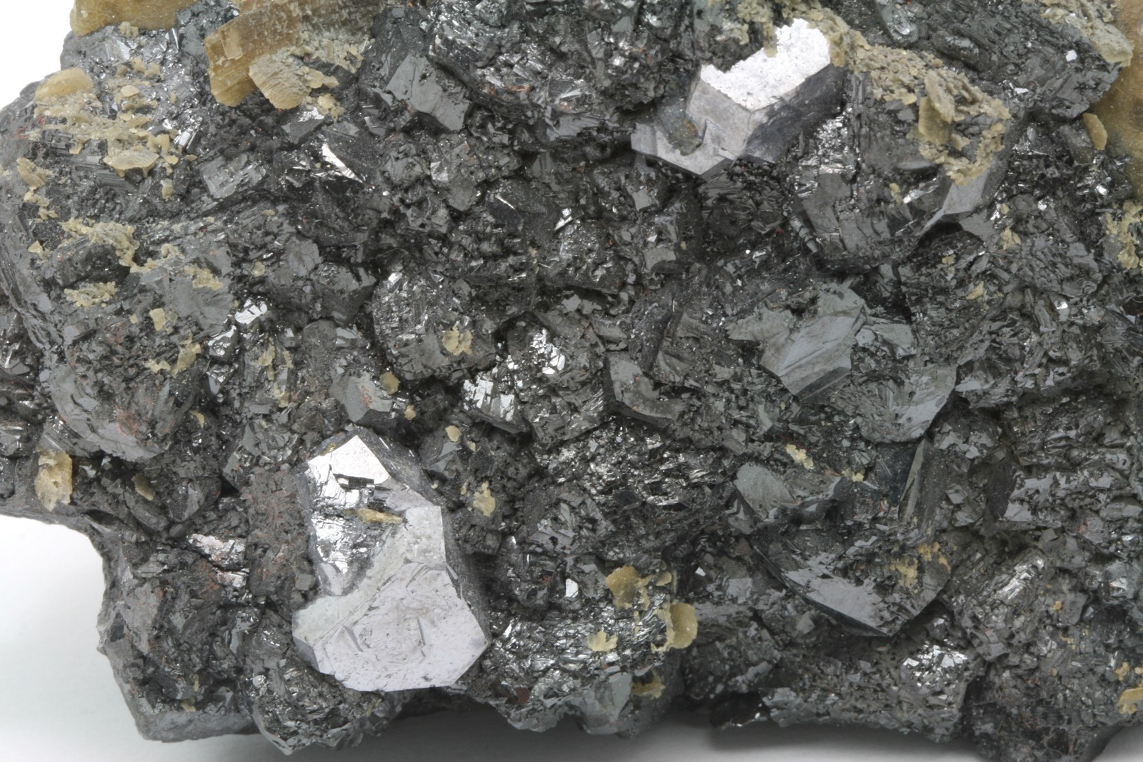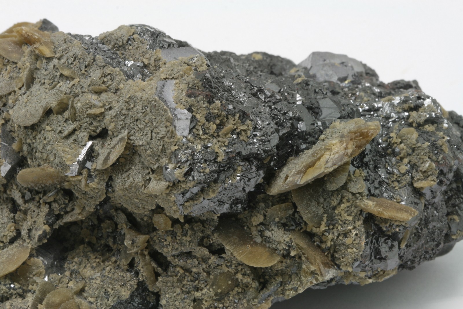 Hochwertiges Sphalerit-Erzbeispiel mit entwickelten schwarzen Sphaleritkristallen, metallisch grauen Galenitkristallen und braunen, spatförmigen Sideritkristallen, die gerade eine Höhlung mit großen Sphaleritkristallen überwachsen.