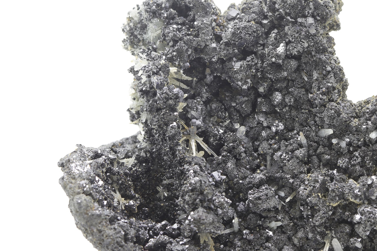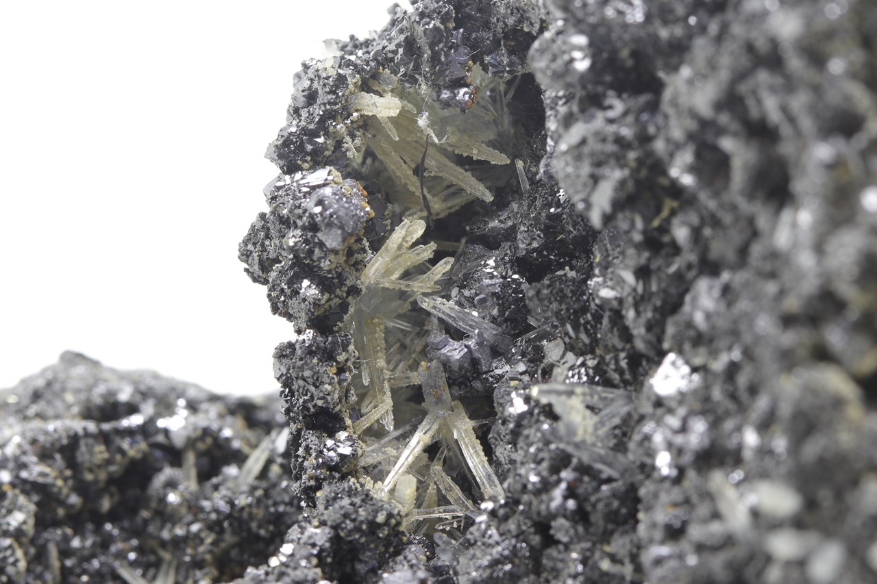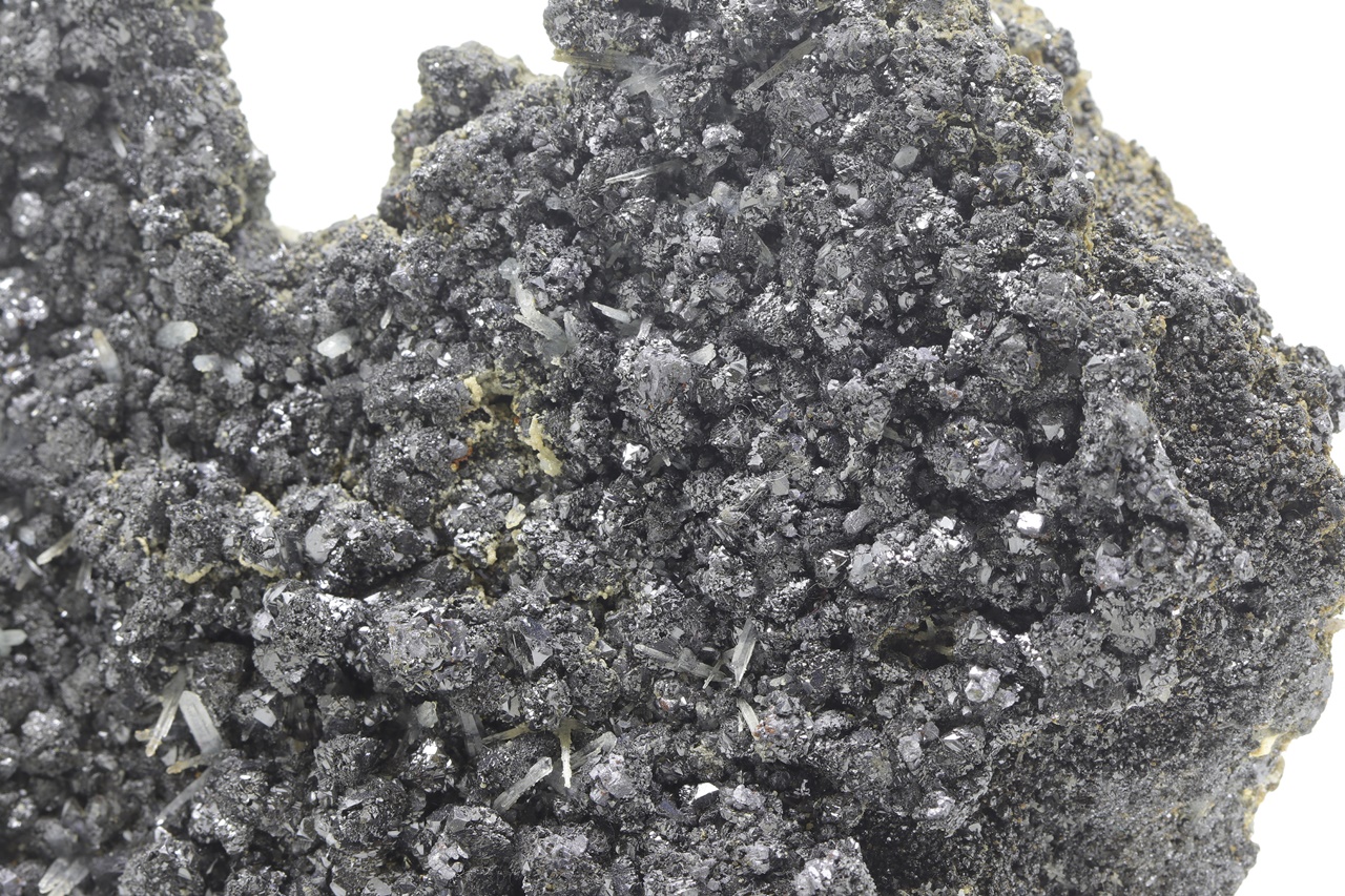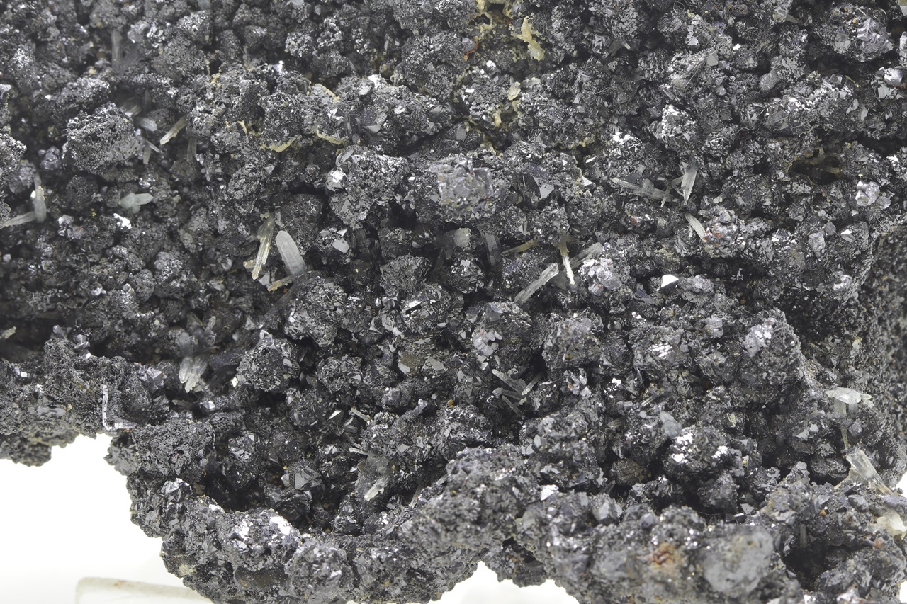 Druse von schwarzen, glänzenden Sphalerit-Kristallen, stellenweise mit Quarznadeln bewachsen.
