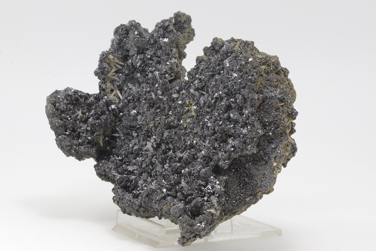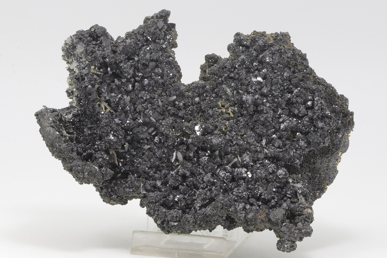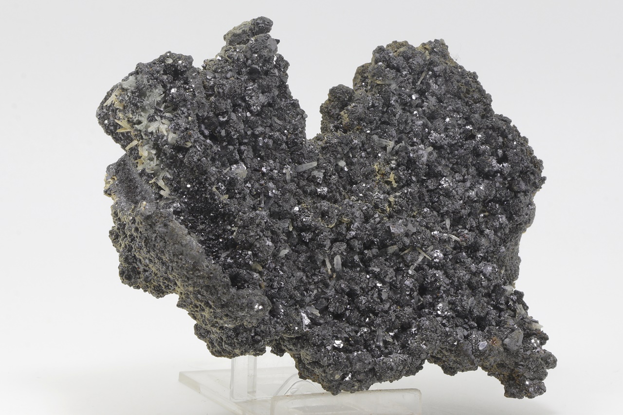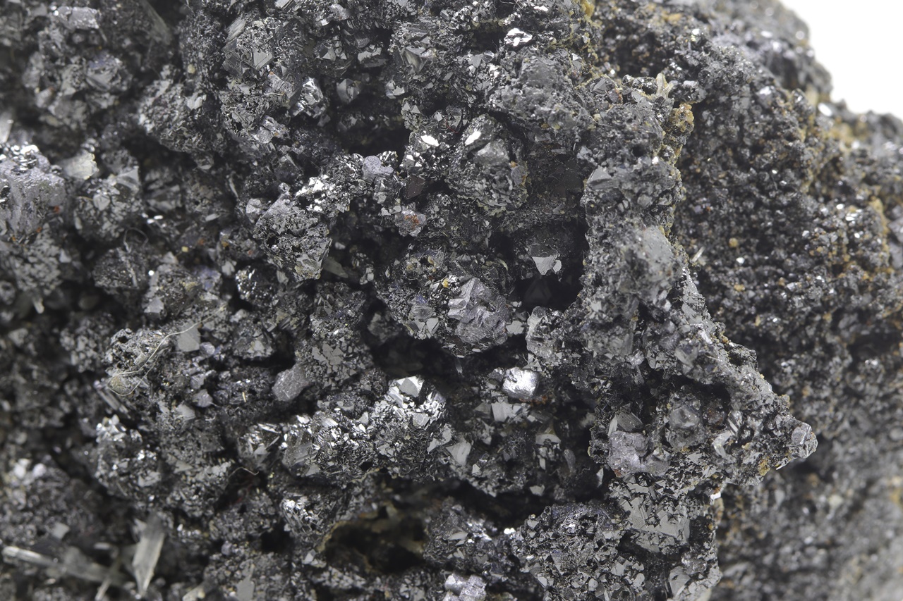 Druse von schwarzen, glänzenden Sphalerit-Kristallen, stellenweise mit Quarznadeln bewachsen.