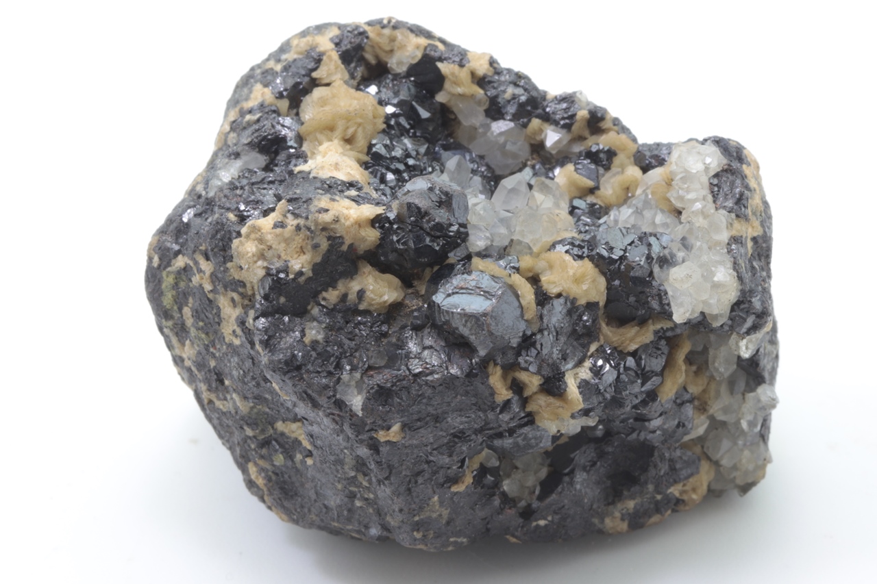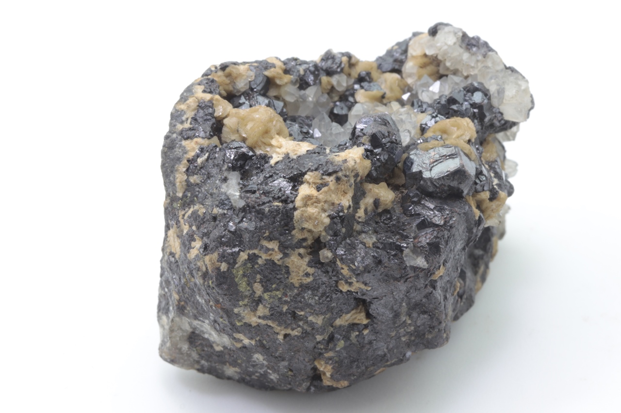 Glänzende schwarze Sphaleritkristalle von bis zu 8 mm, überwachsen von Kristallen aus klarem Quarz und gelbem Siderit.