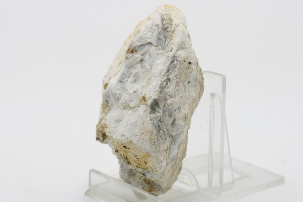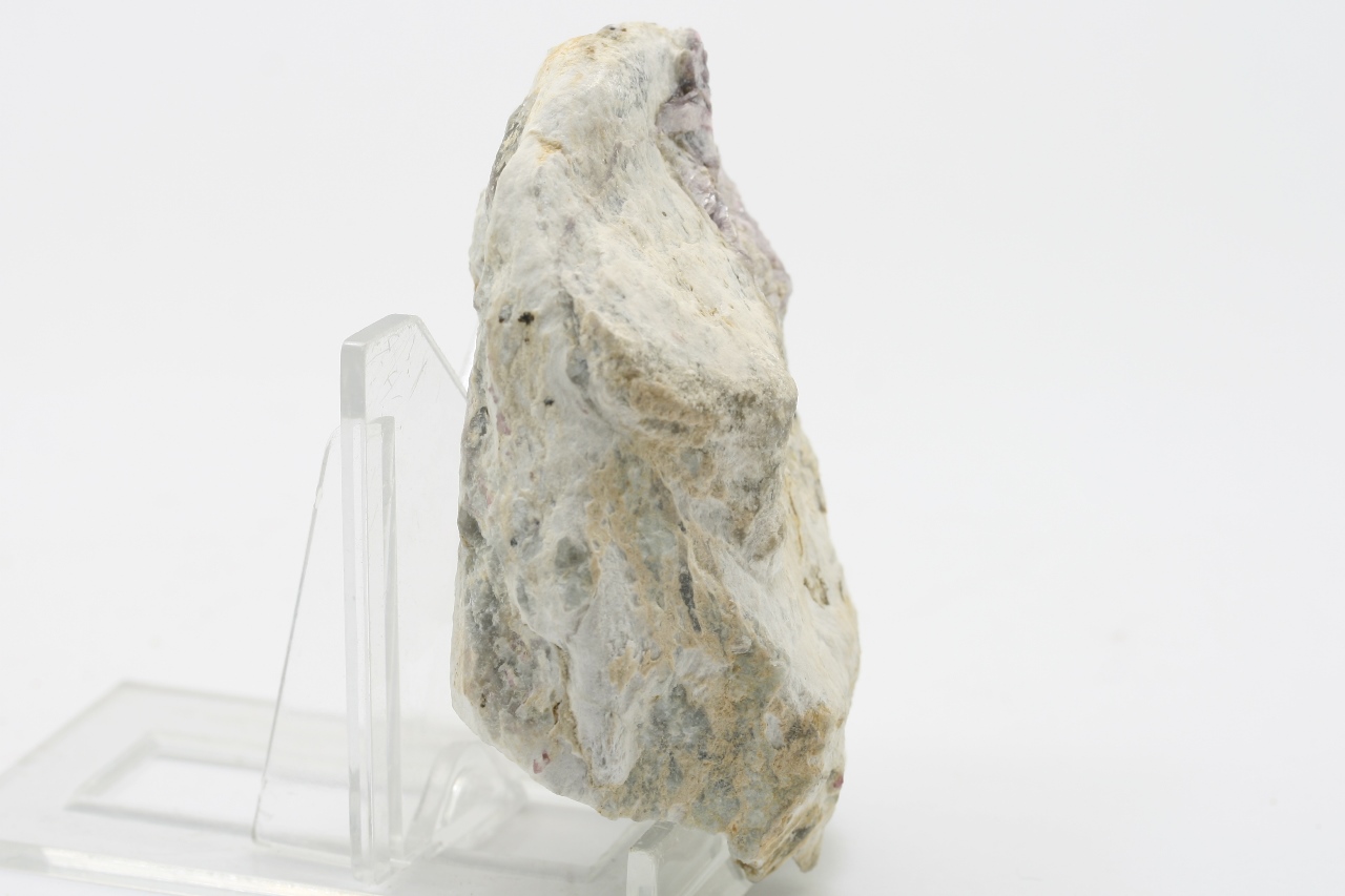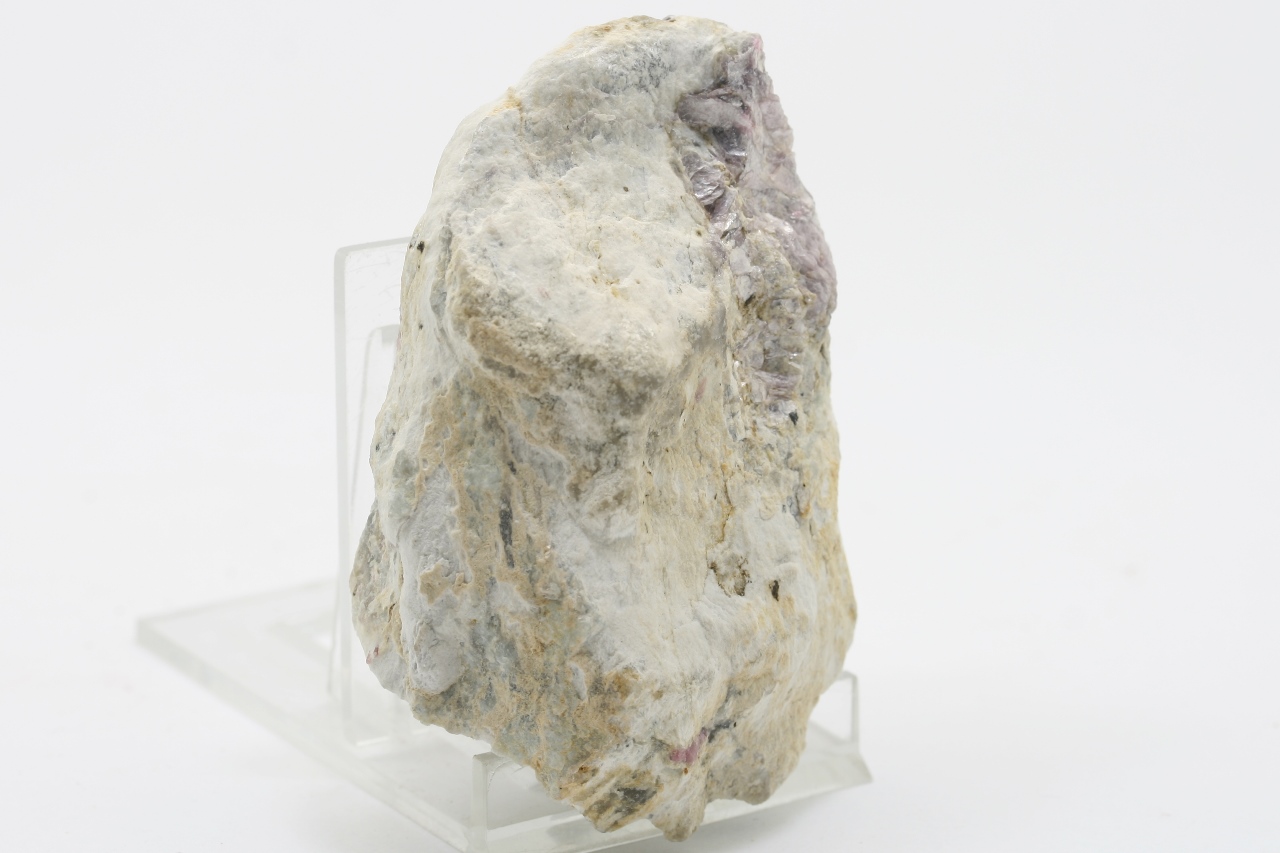 Großer, kreideweißer lithischer Pyroxen mit einem hellrosa schuppigen Aggregat aus Glimmer.