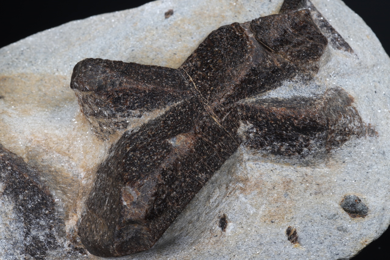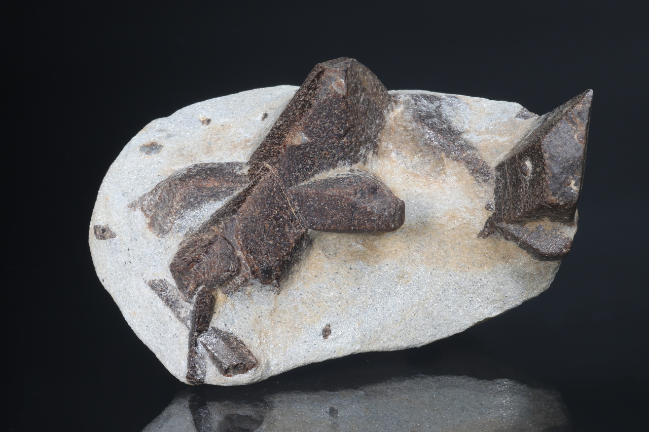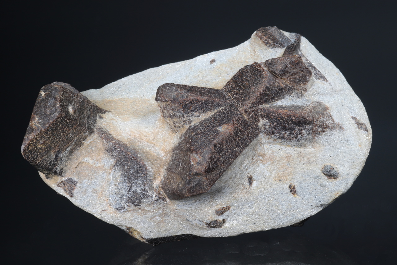 Schöne Kreuzverzwillinge von Staurolith mit einer Größe von bis zu 68 mm in hellem Glimmer. Sehr ästhetische, kontrastreiche Probe von Staurolith aus einem klassischen russischen Fundort.