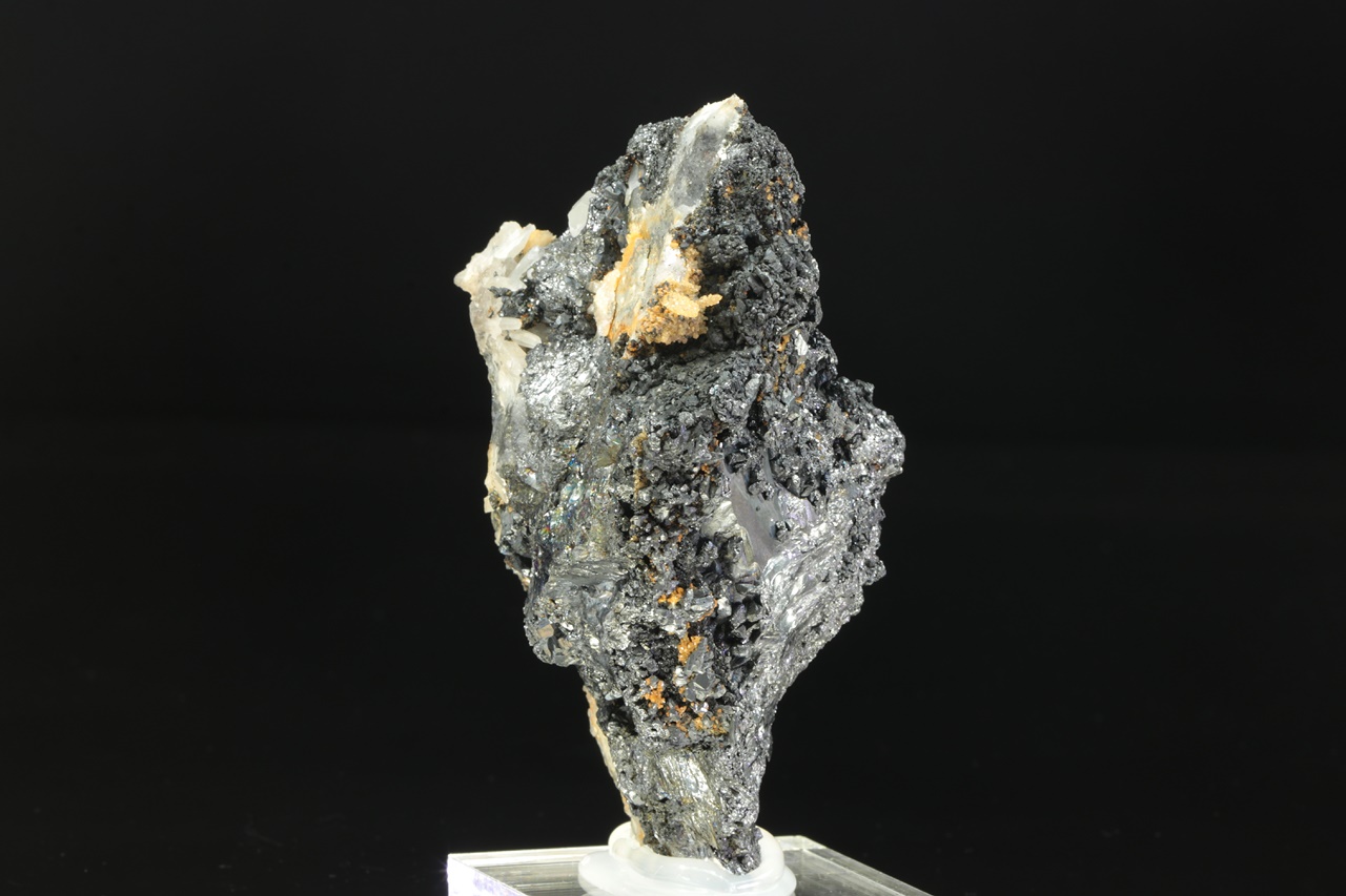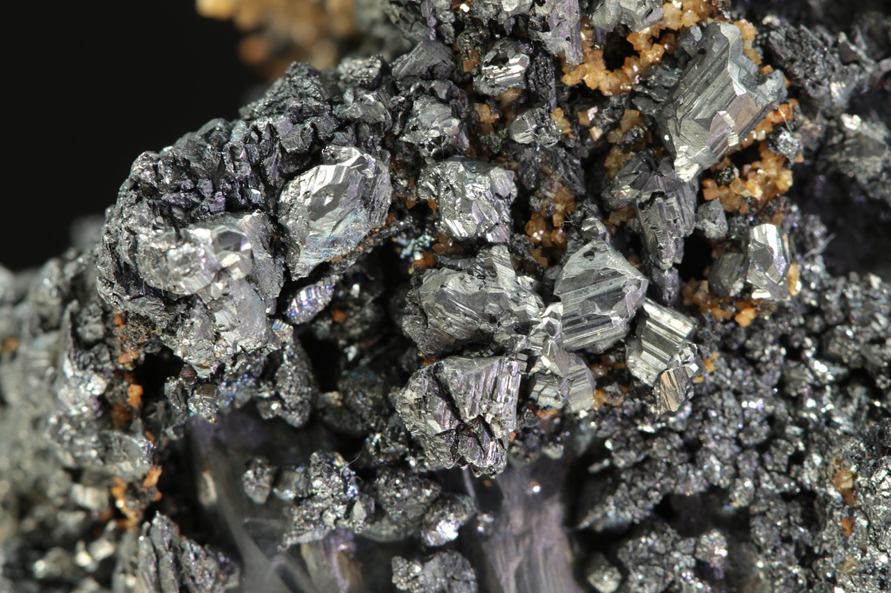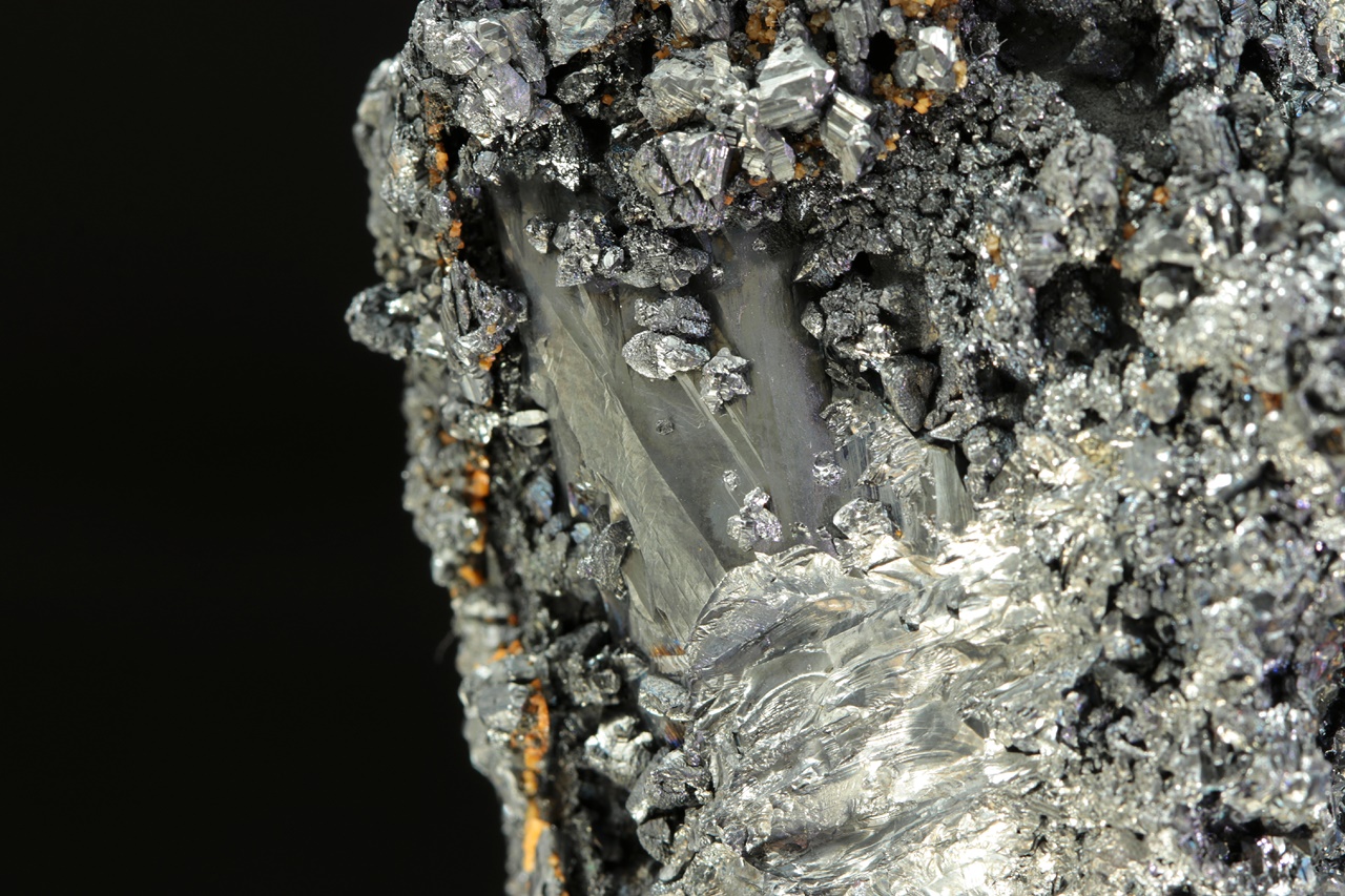 Ein großer Pyrargyrit-Kristall, auf dem reichlich gewachsene, schöne, treppenartige Stefanit-Kristalle bis zu 3 mm Größe sitzen.