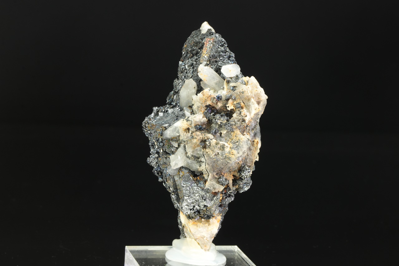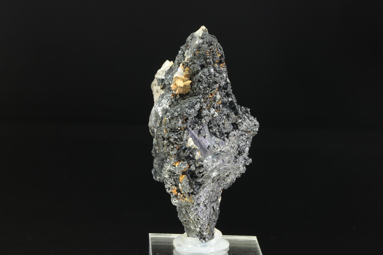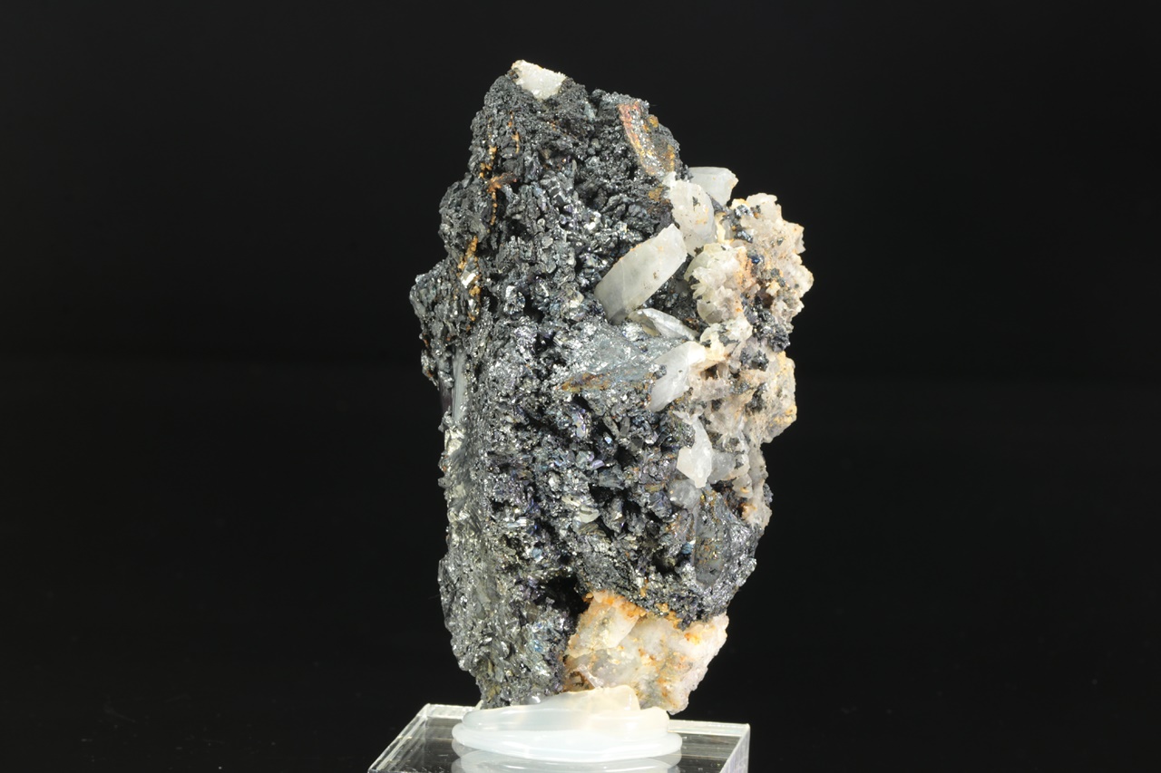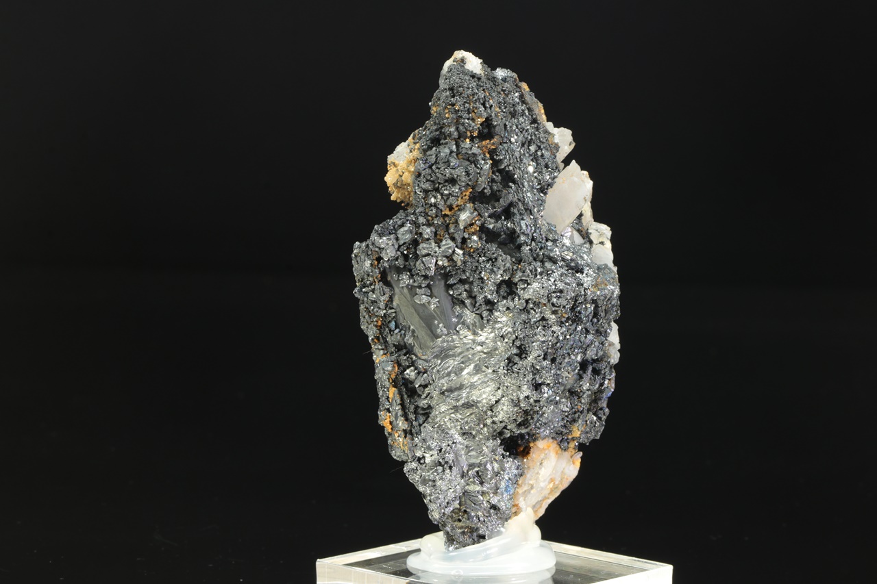Ein großer Pyrargyrit-Kristall, auf dem reichlich gewachsene, schöne, treppenartige Stefanit-Kristalle bis zu 3 mm Größe sitzen.