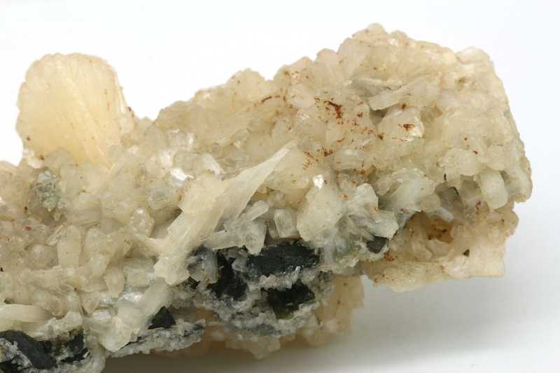 Tafelförmige Kristalle von gelblichem Zeolith – Stellerit. Die Tafeln von Stellerit sind etwa 22 mm groß und wachsen auf Epidot.