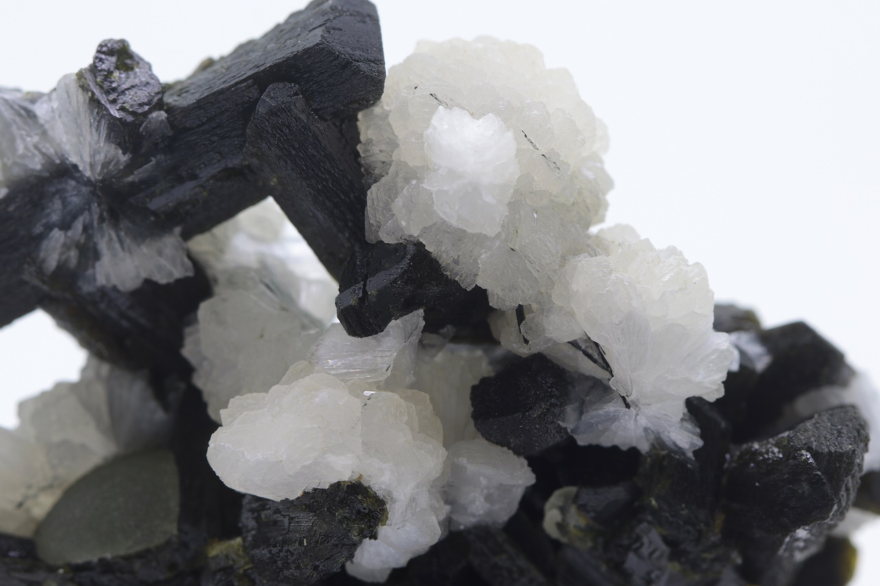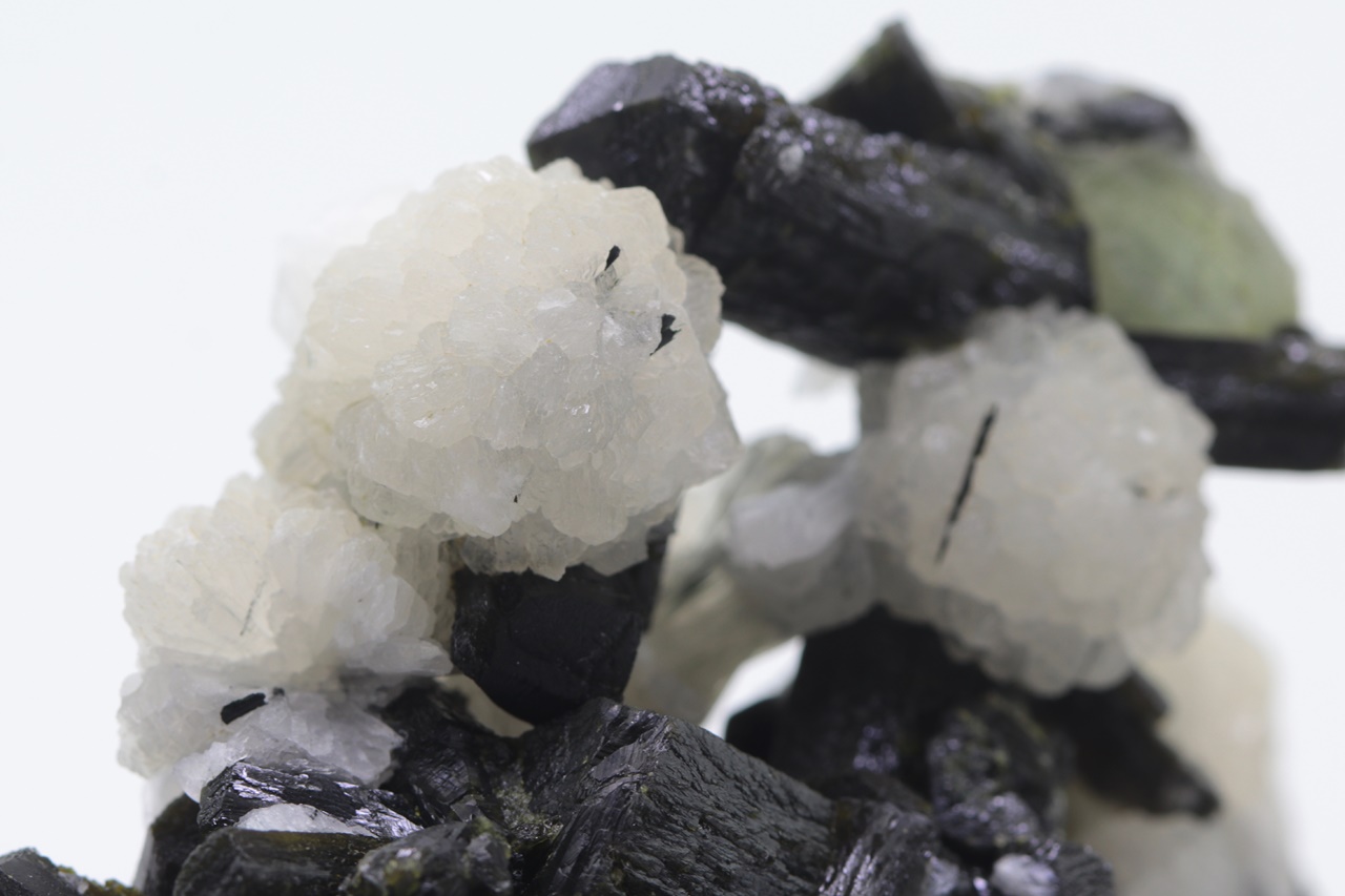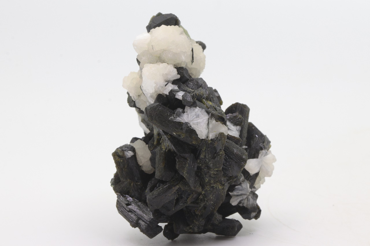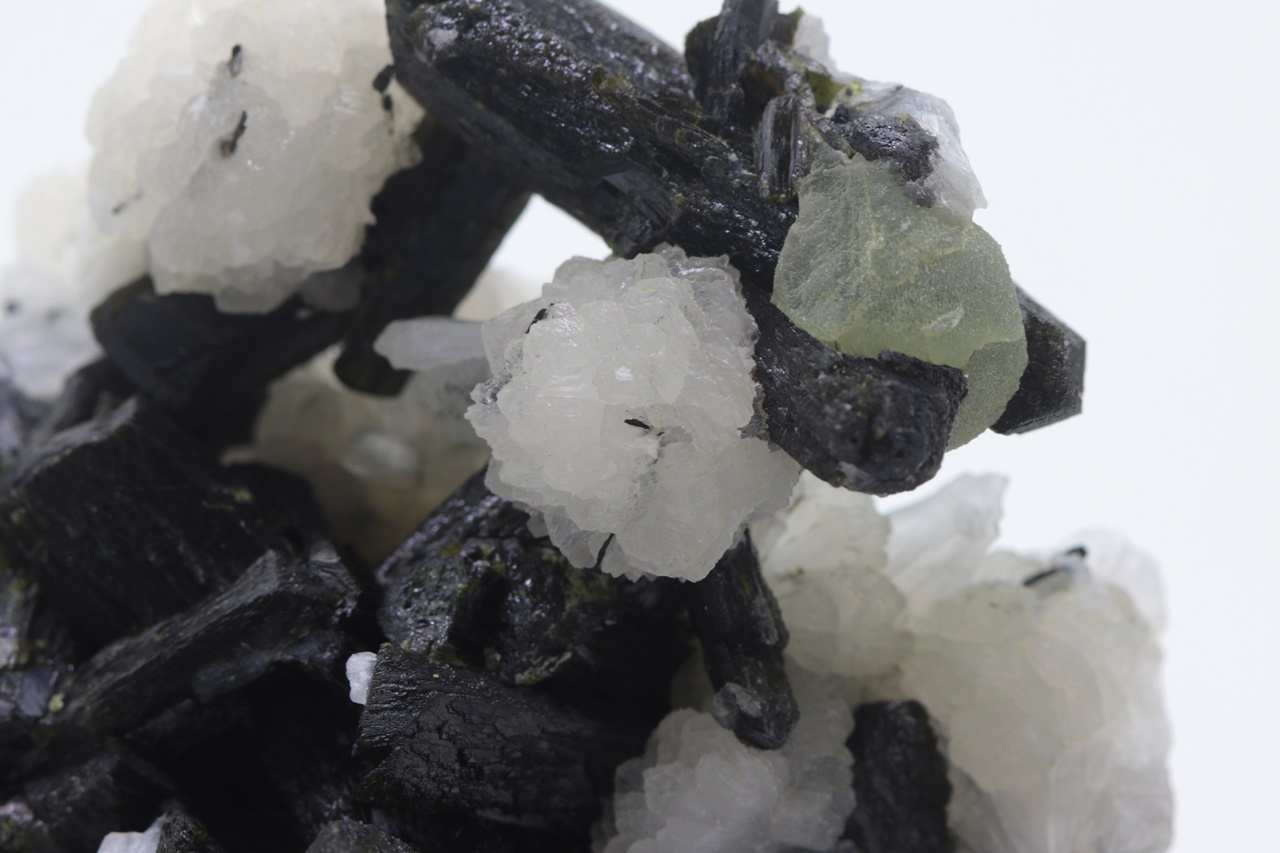 Cluster dunkelgrüner Epidot-Kristalle bis zu 2,5 cm groß mit kugelförmigen Aggregaten aus weißem Stellerit (Mineral aus der Stilbit-Gruppe) und grünen Aggregaten aus Prehnit.