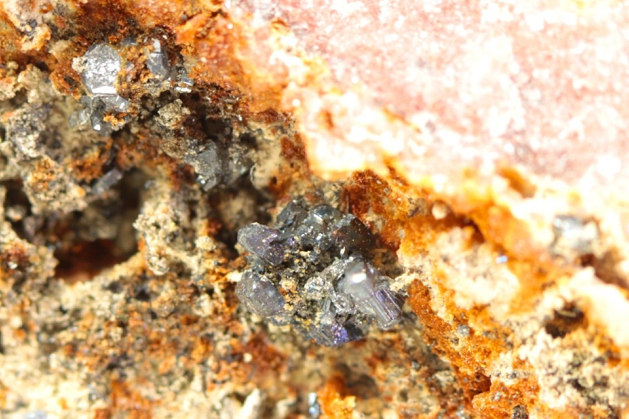 Srostlice metallisch glänzender Kristalle von Stafanit. Die größte Kristallgruppe ist 3 mm groß.