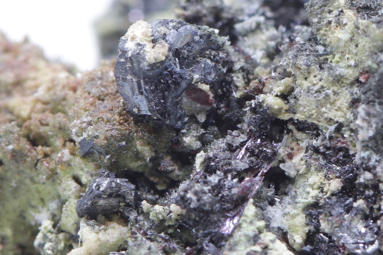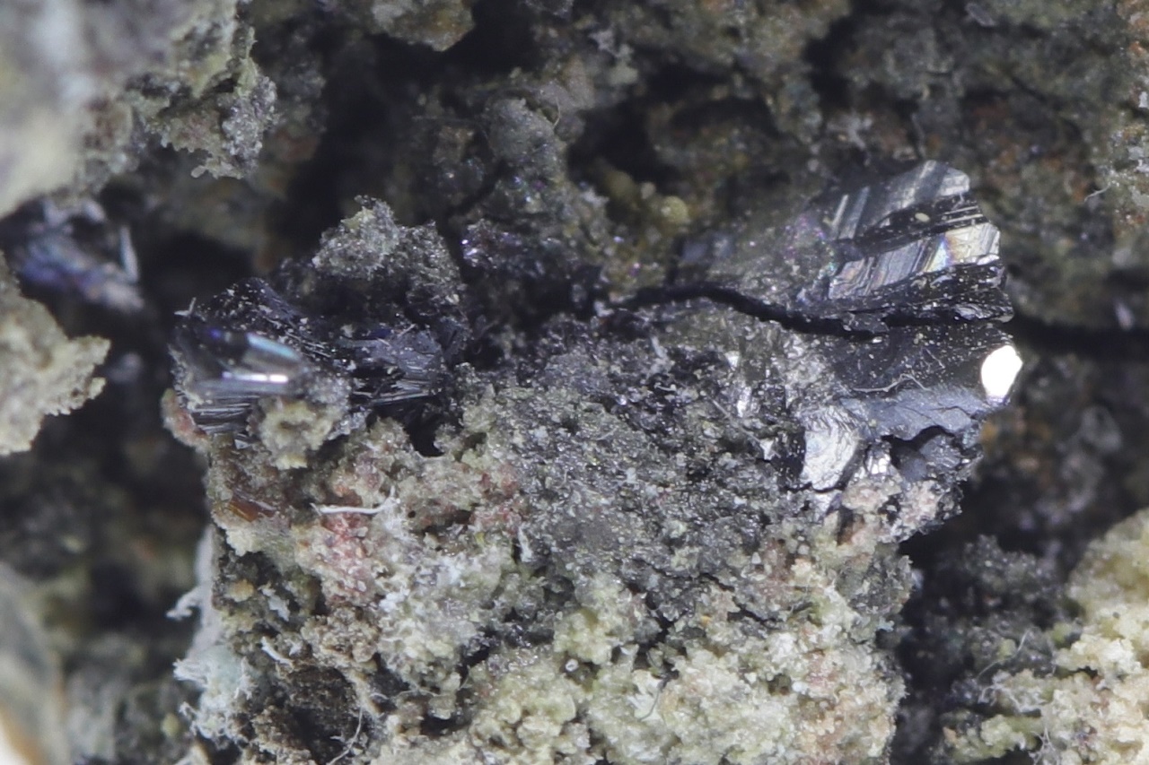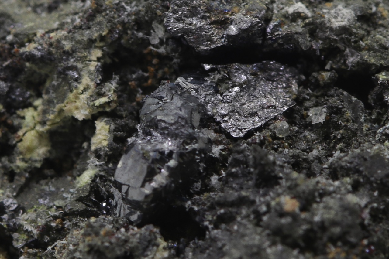 Stufe bestreut mit mehreren Stefanit-Kristallen, der größte davon ist 5 mm groß.
