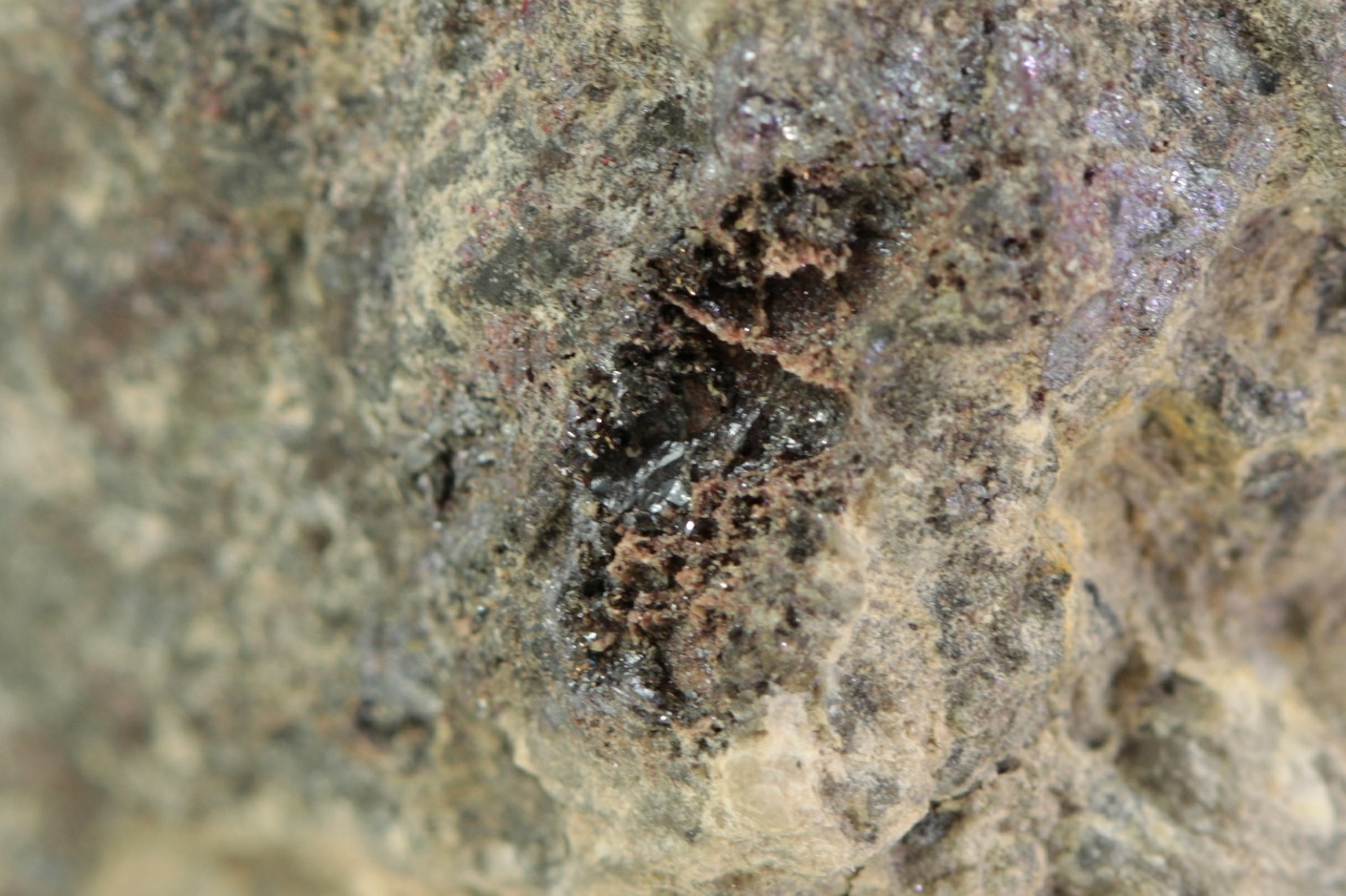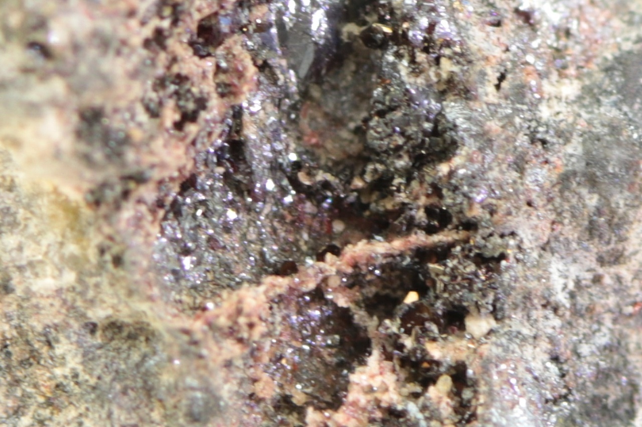 Glänzende, schwarze Sternbergit-Plättchen mit rotem Proustit, gewachsen in einer Höhle mit den Abmessungen 5 × 3 mm.
