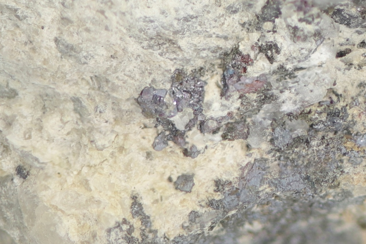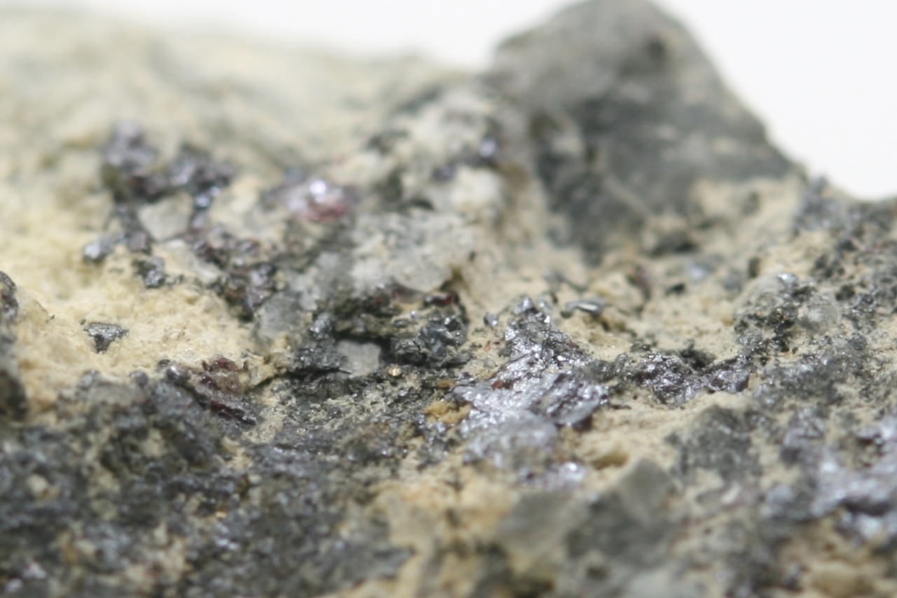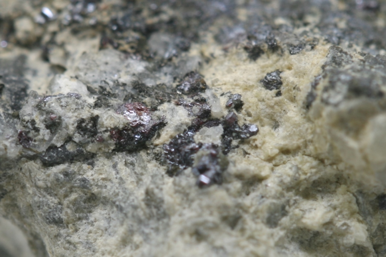 Schwarze hexagonale Kriställchen von Sternbergit mit rotem Proustit. Für beide Minerale ist Joachimsthal die Typlokalität.