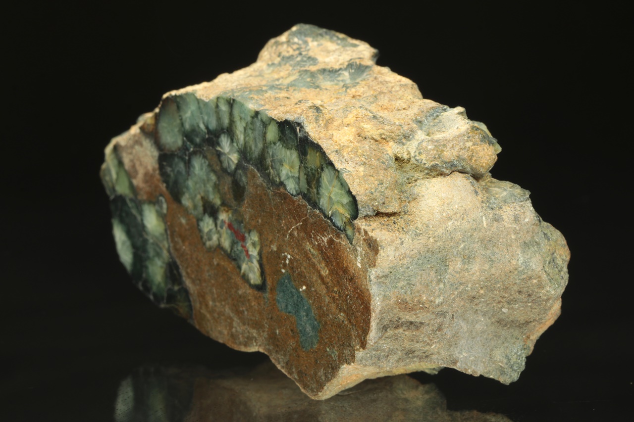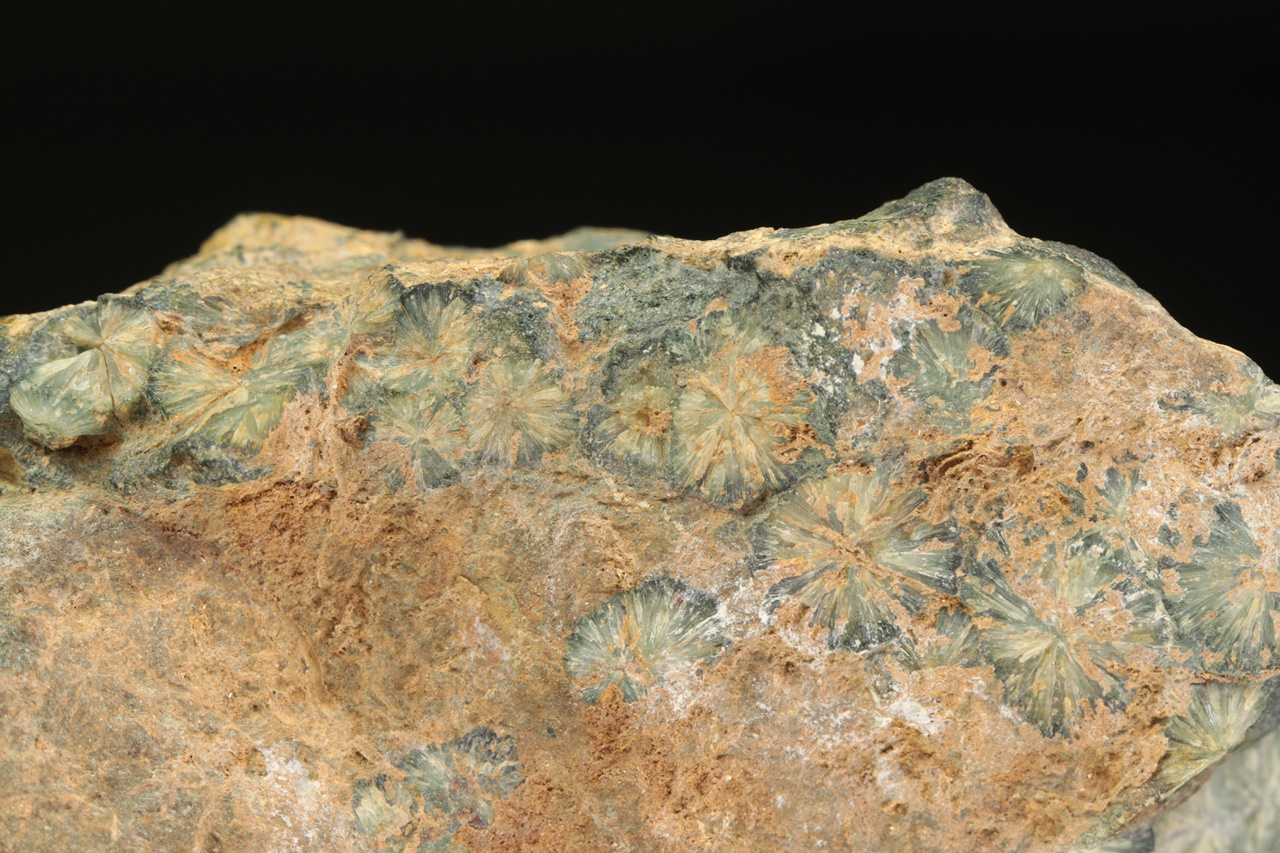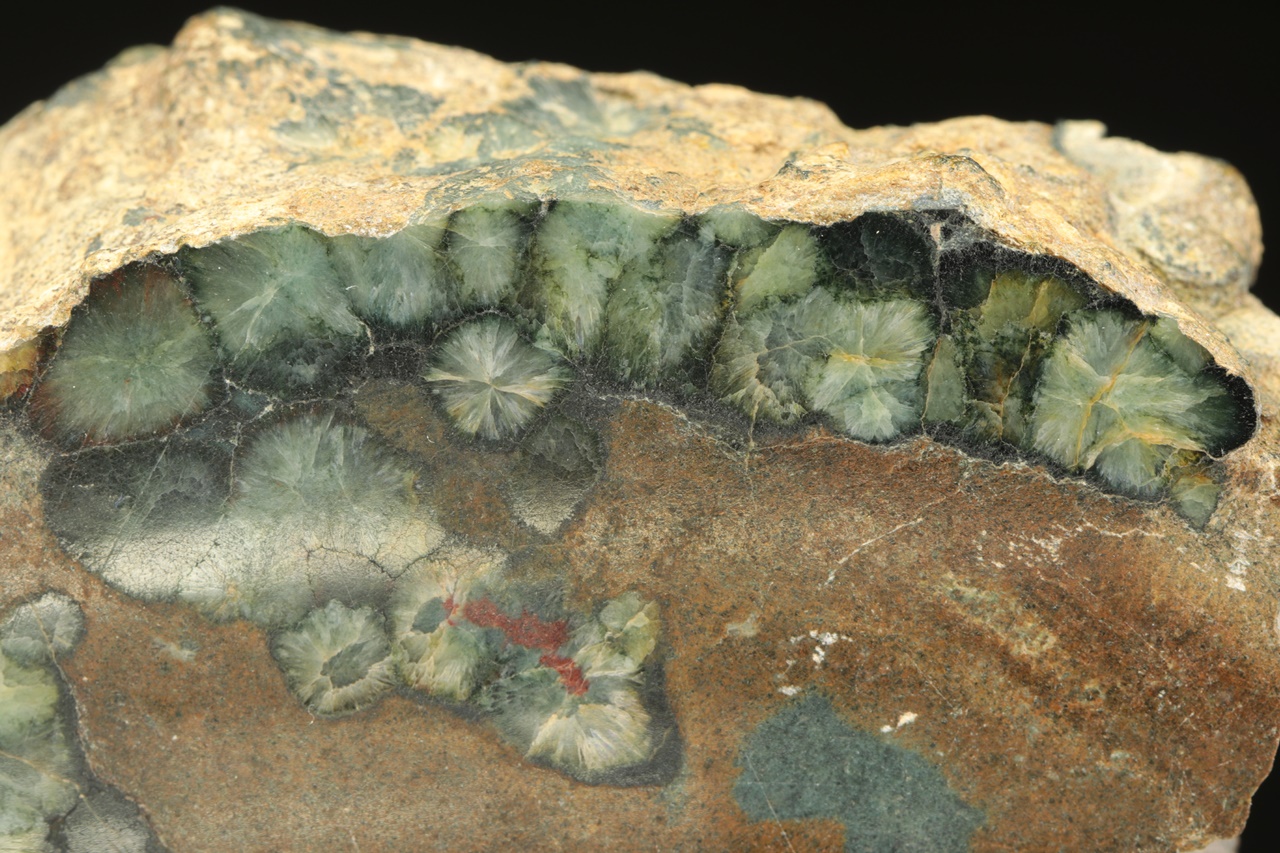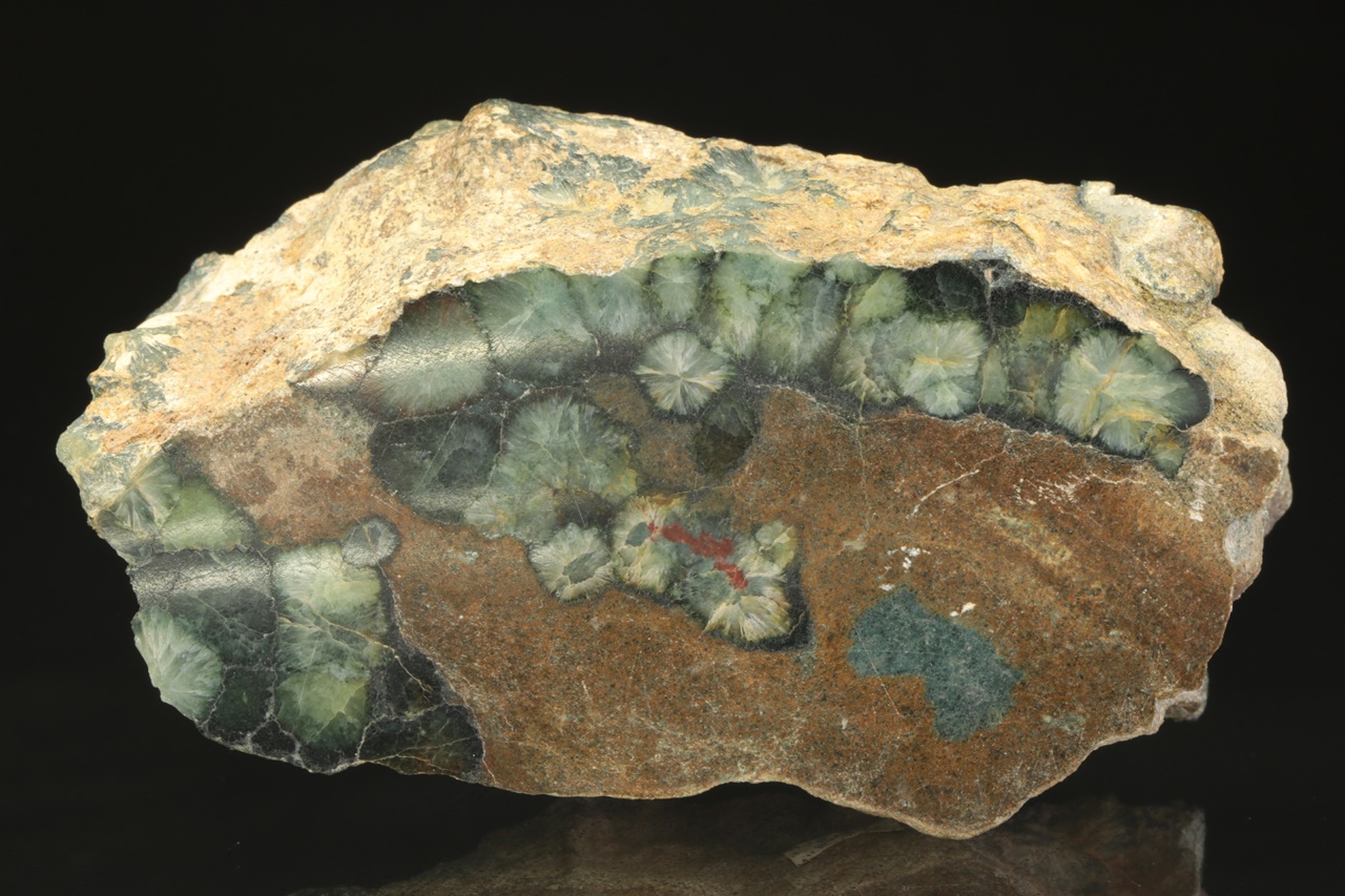 Polierter Muster von grünen radialen Quarz-Aggregaten mit bis zu 1 cm Größe.