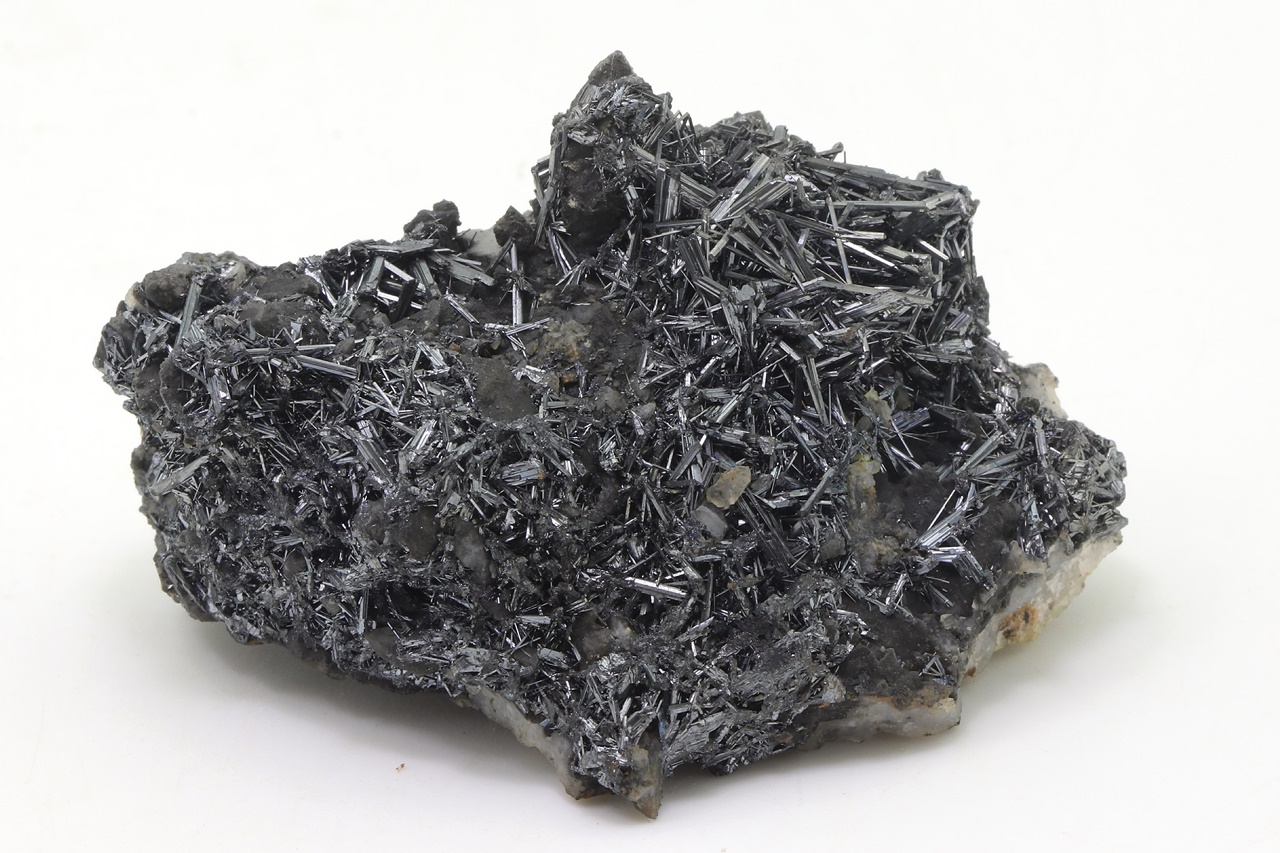 Historische Probe einer Quarzdruse, reich bewachsen mit nadelförmigen Kristallen von glänzendem Antimonit. Die größten Antimonit-Kristalle sind über 1 cm groß .