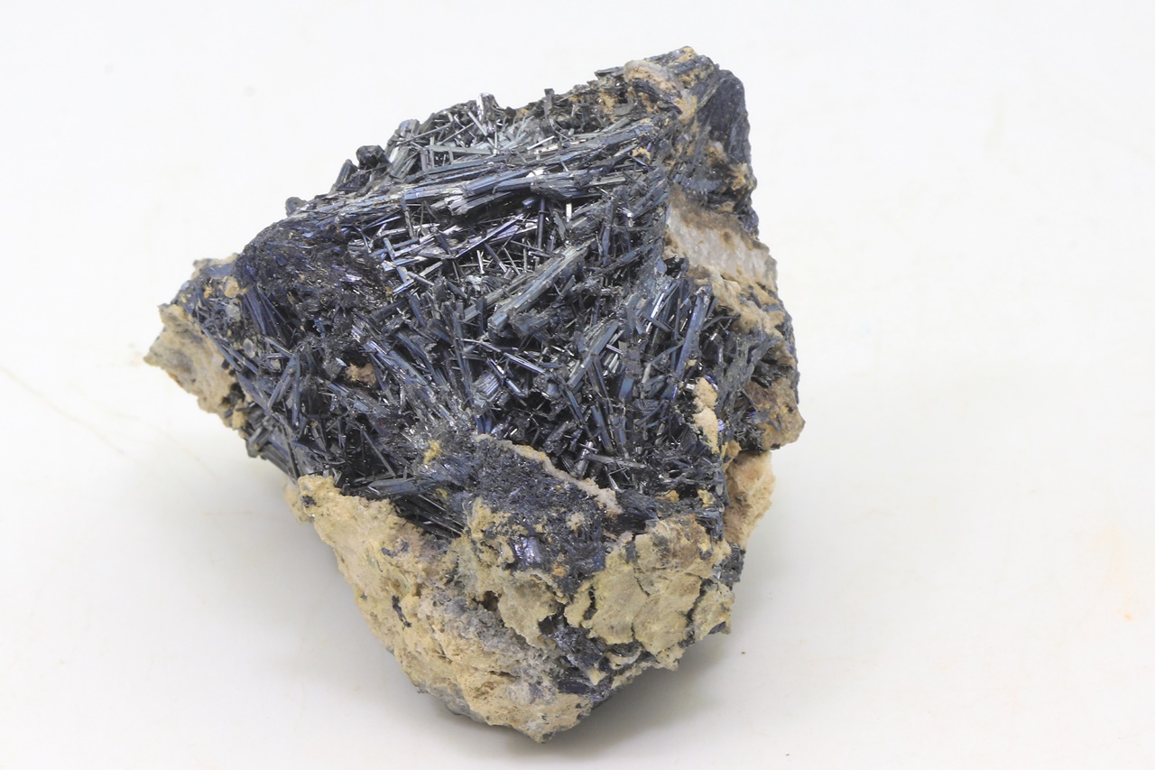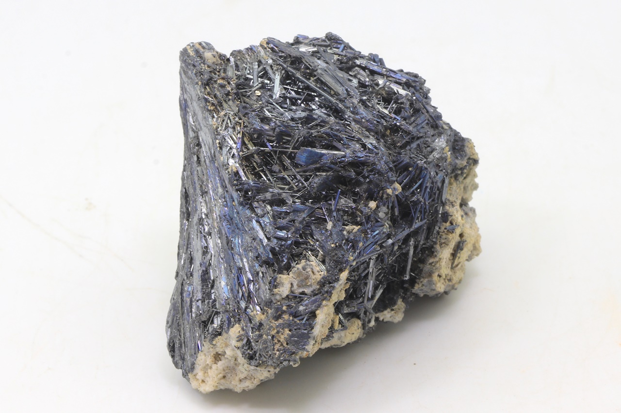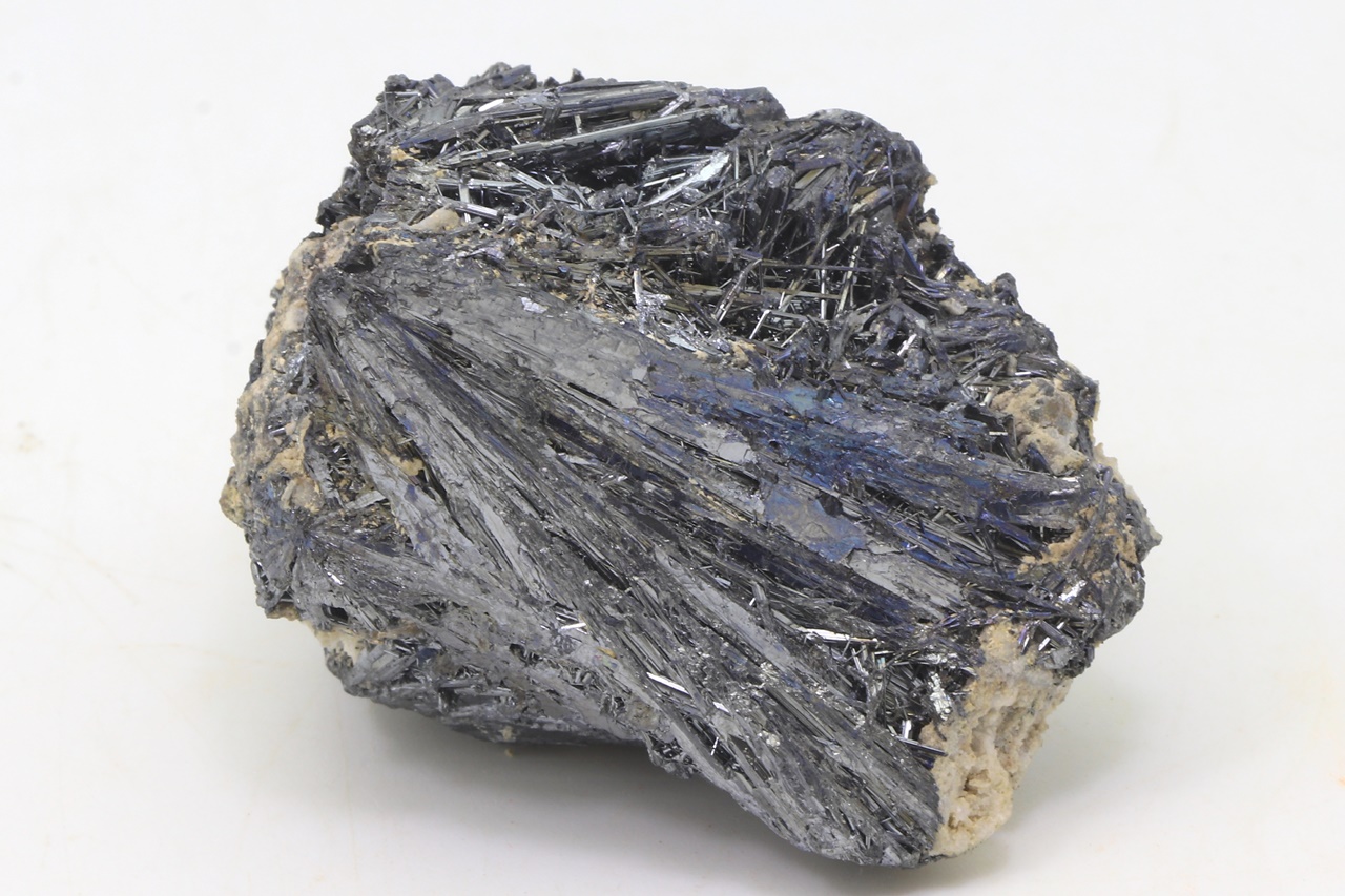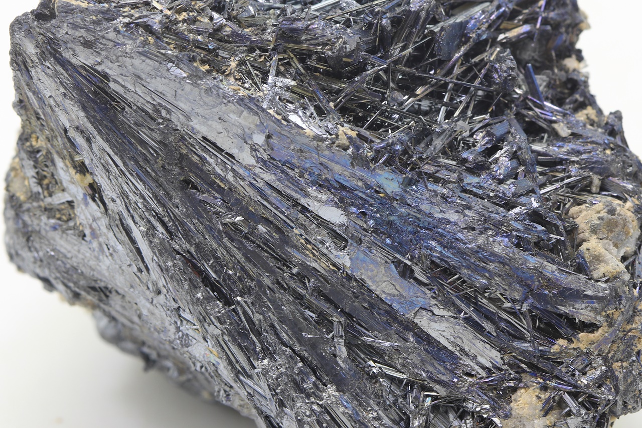 Lange Nadeln von schwarzem Antimonit mit leichten Anlauffarben.