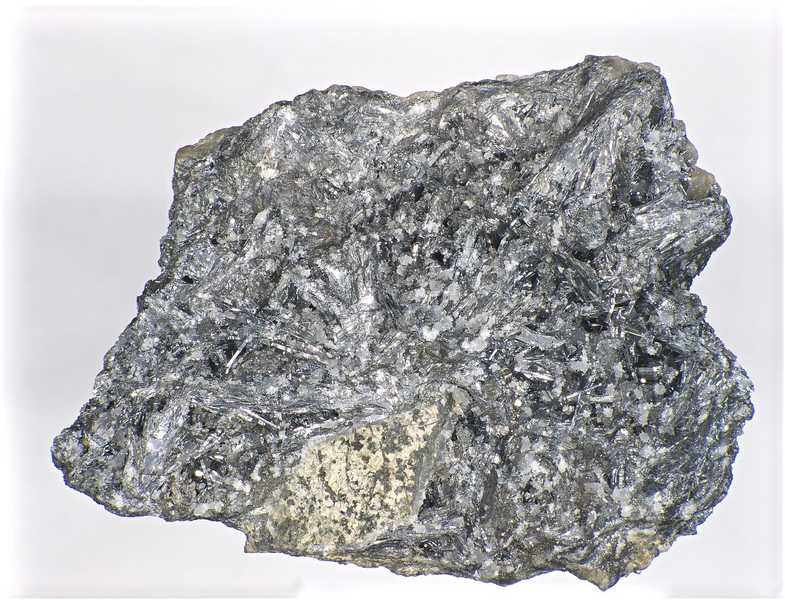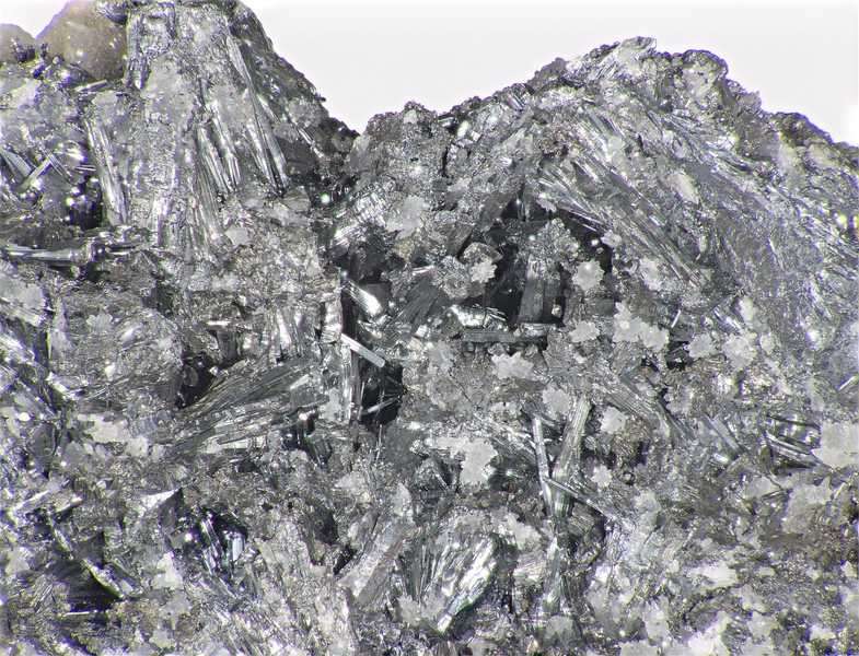 Schönes Beispiel für Antimonit aus dem klassischen Fundort Příbram – Bohutín. Reichhaltiges Drusengefüge von nadeligen Antimonit-Kristallen, die teilweise in Hohlräume gewachsen sind.