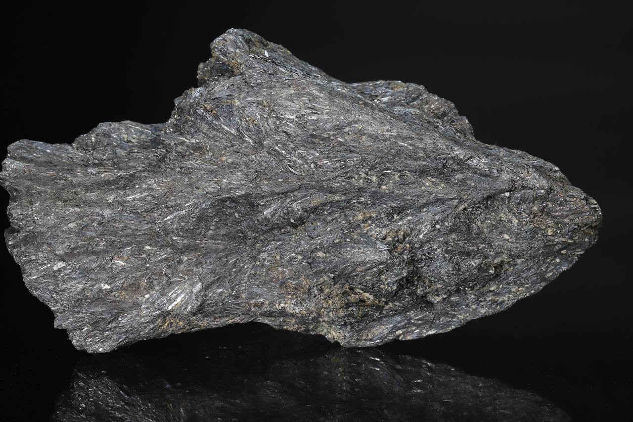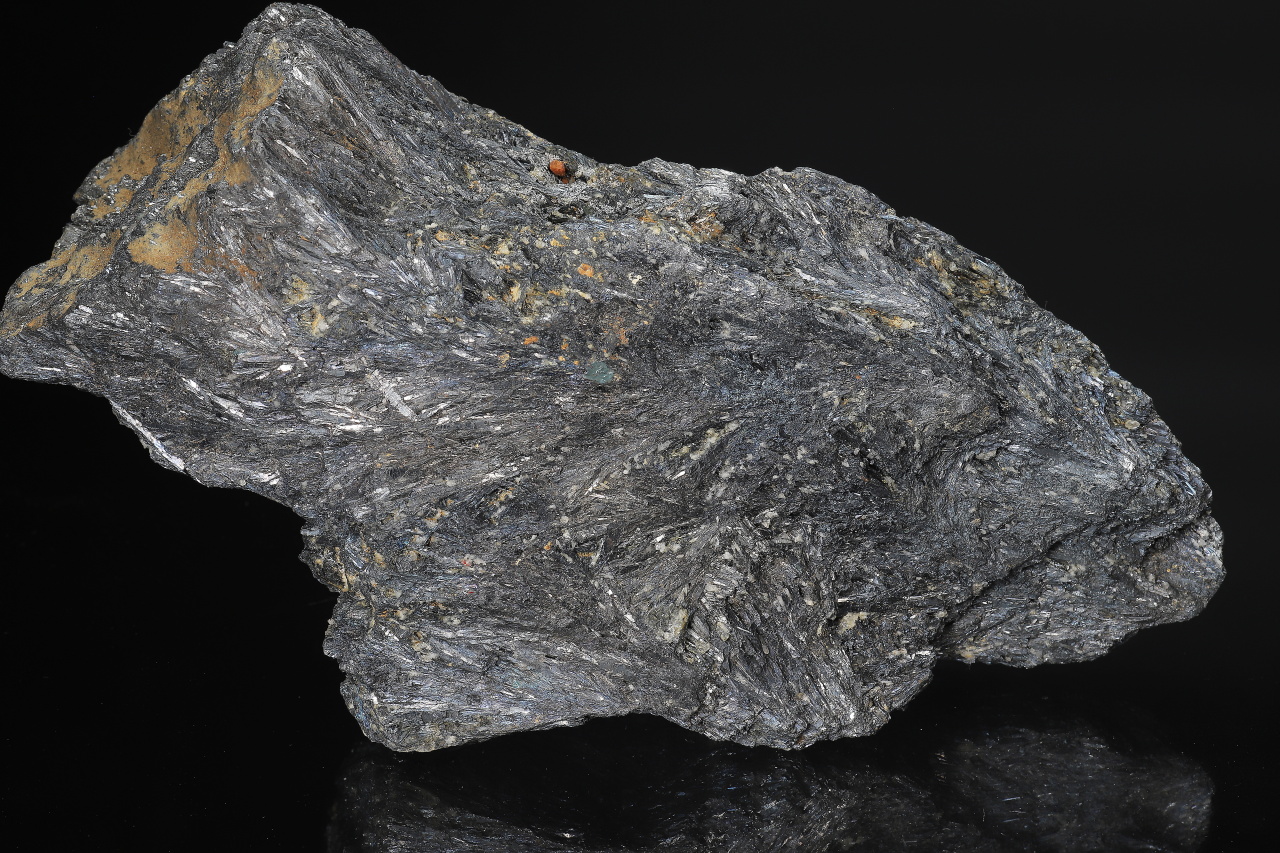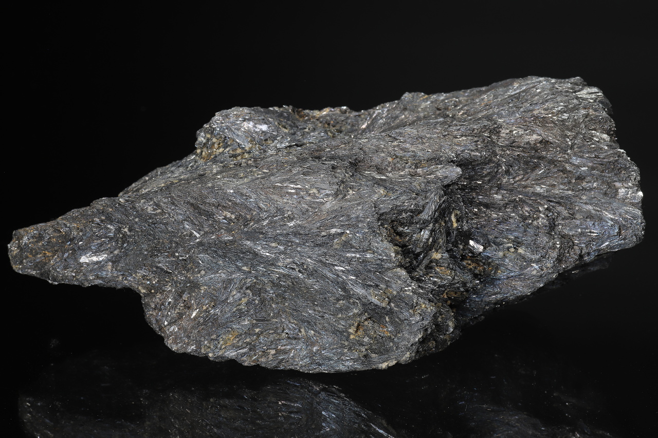 Massives Stück überwiegend aus stäbchenförmigen Kristallen des metallisch grauen Antimonits, teilweise übergangend in kurze Kristalle, die in Hohlräumen wachsen. Großes Exemplar von Antimoniterz aus den Bohutín-Minen bei Příbram.