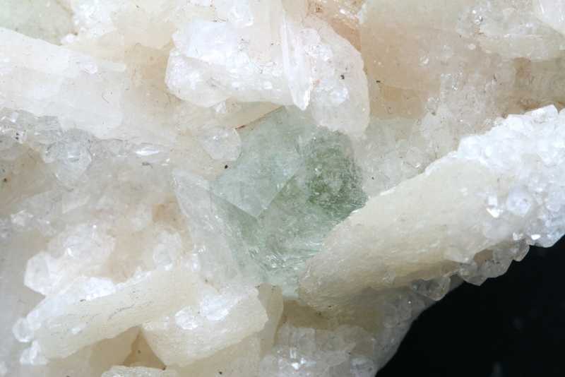 Sehr ästhetische Stufe von Stilbit mit Apophyllit aus Indien. Hochwertige Stufe von Drusen kristallischem Stilbit und klaren bis grünen zonalen Kristallen von Apophyllit.