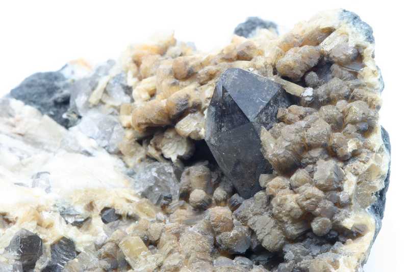 Stilbit-Probe aus Polen. Probe von Stilbit-Aggregaten bis zu 4 mm Größe zusammen mit einem Záhněda-Kristall von 15 mm Größe.