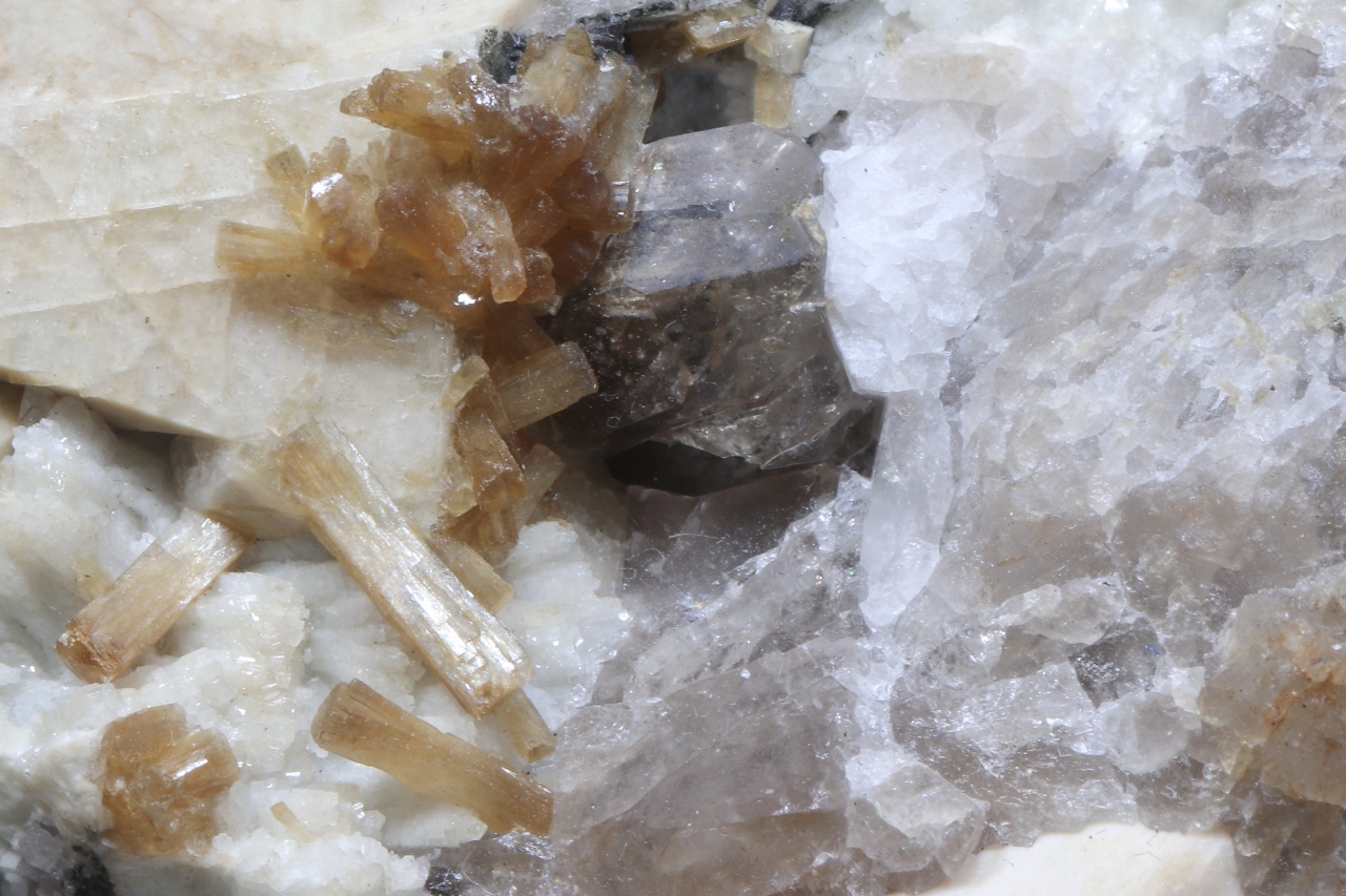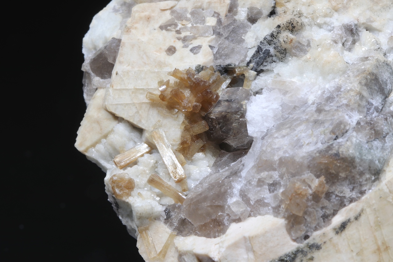 Schöne säulenförmige bräunlich-grüne Stiebit-Kristalle, die eine Länge von bis zu 1 cm erreichen, wachsen auf Orthoklasen und auch auf Záhnědas.
