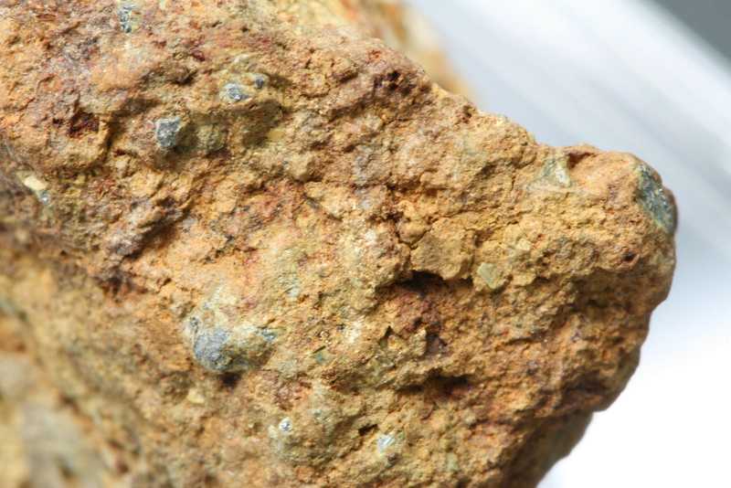 Fast durchgehende Ader von unvollkommenen, abgerundeten Tetradymit-Kristallen, die bis zu 2 mm groß sind und von einer gelben Montebrasit-Schicht bedeckt sind, einem seltenen bismuttellurat.