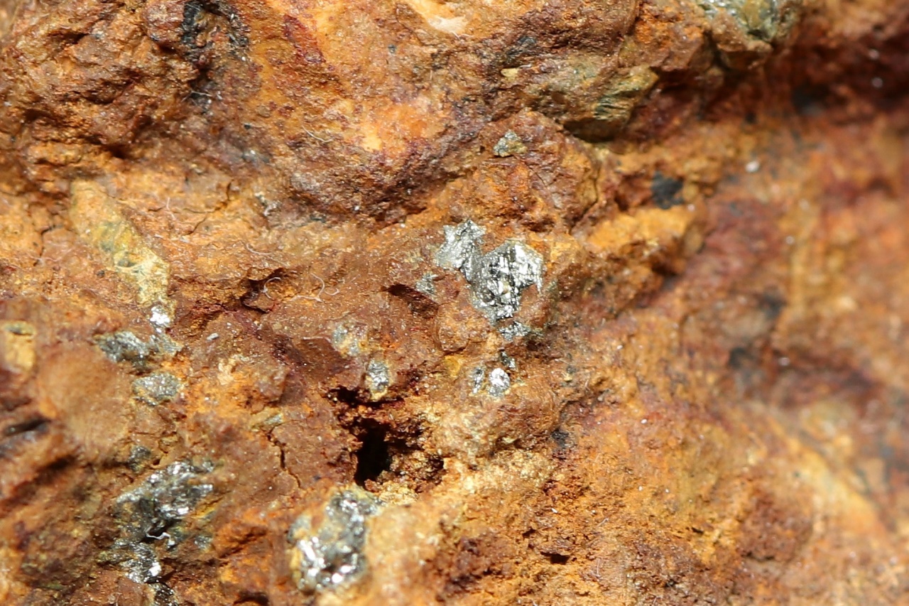 Sammelstufe von Tetradymit aus der Typlokalität Župkov in der Mitte der Slowakei. Reiche Lage voller grauer, metallisch glänzender Kristalle dieses Sulfids aus Tellur und Bismut durchzieht die ganze Stufe des silifizierten Andesits. Die Kristalle vom Tetradymit, bis zu 3 mm groß, sind stellenweise mit markant gelbem Montanit umhüllt, der durch den Zerfall des Tetradymits entsteht.