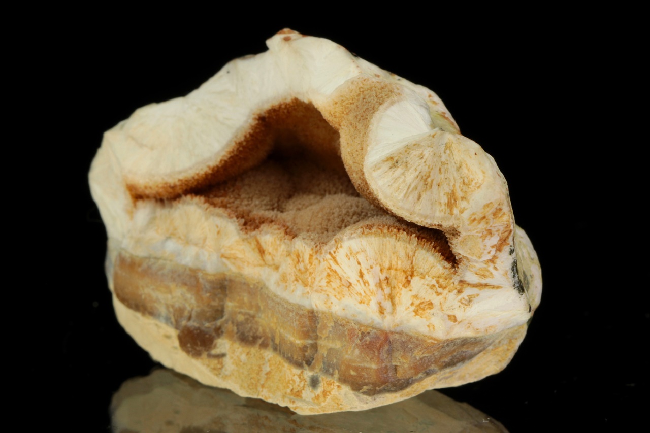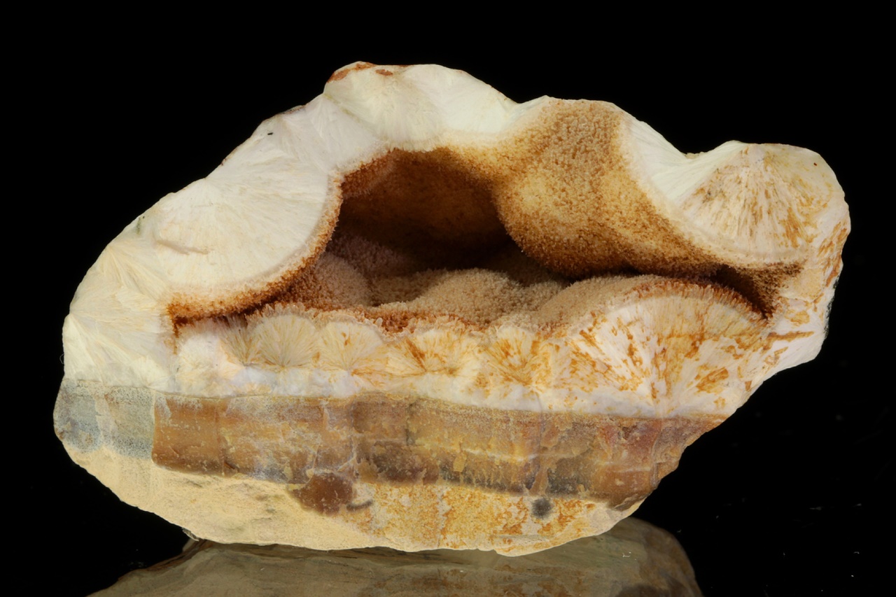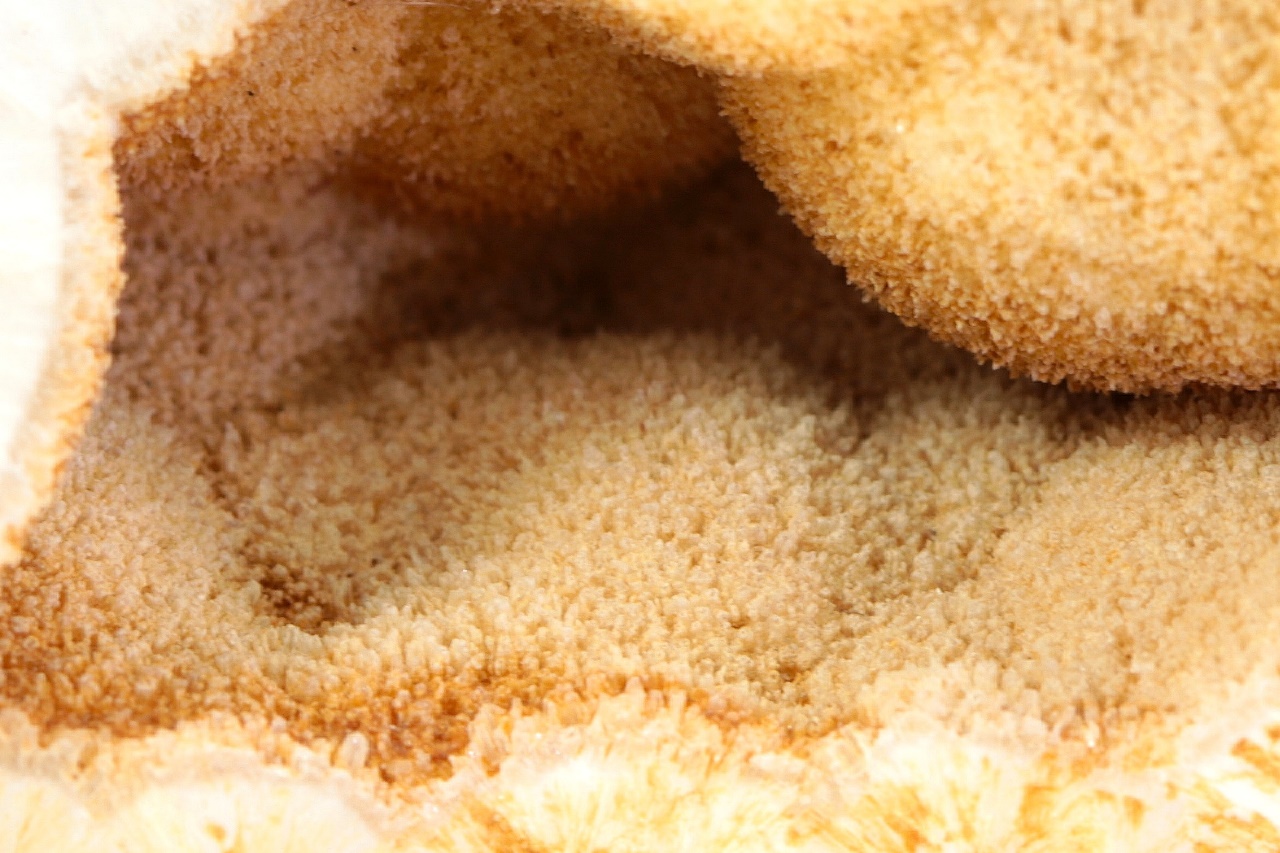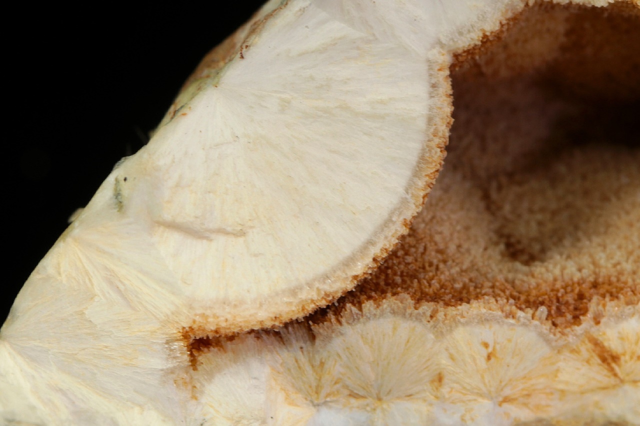 Radiäre Aggregate des weißen Zeoliths Thomsonit, die in eine Höhle gewachsen sind.