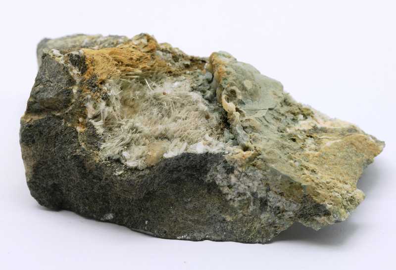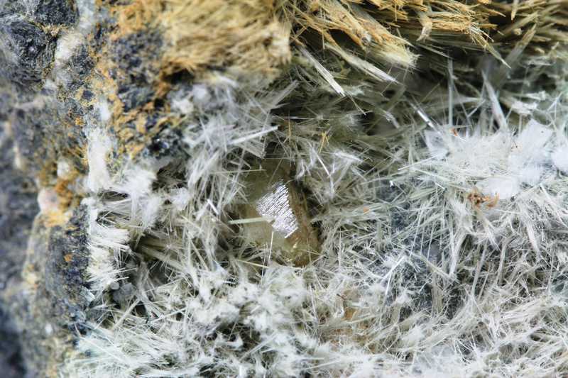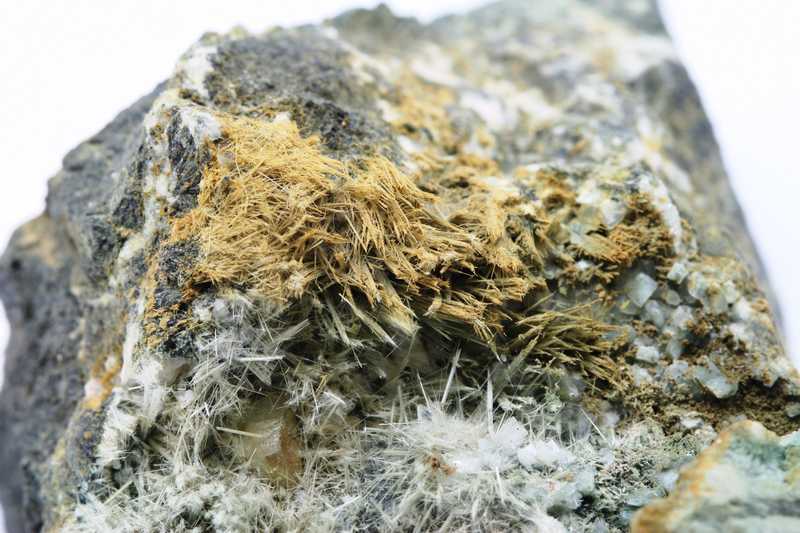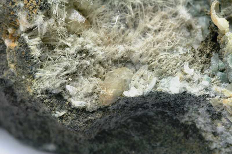 Auf diesem schönen Muster befinden sich 2 Kristalle des gelblichen Titanits, umgeben von Byssolit. Der größte Kristall ist 6 mm groß.