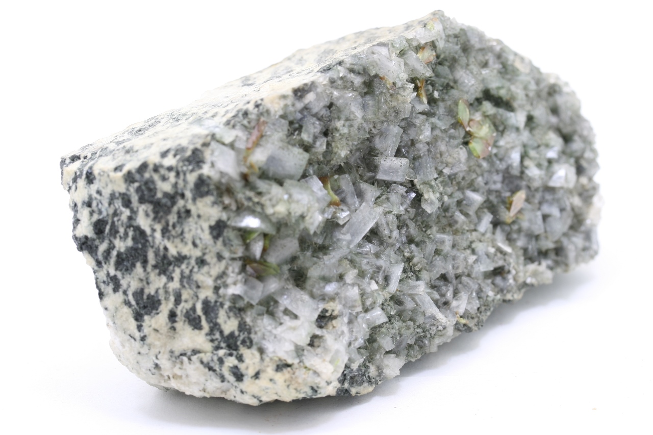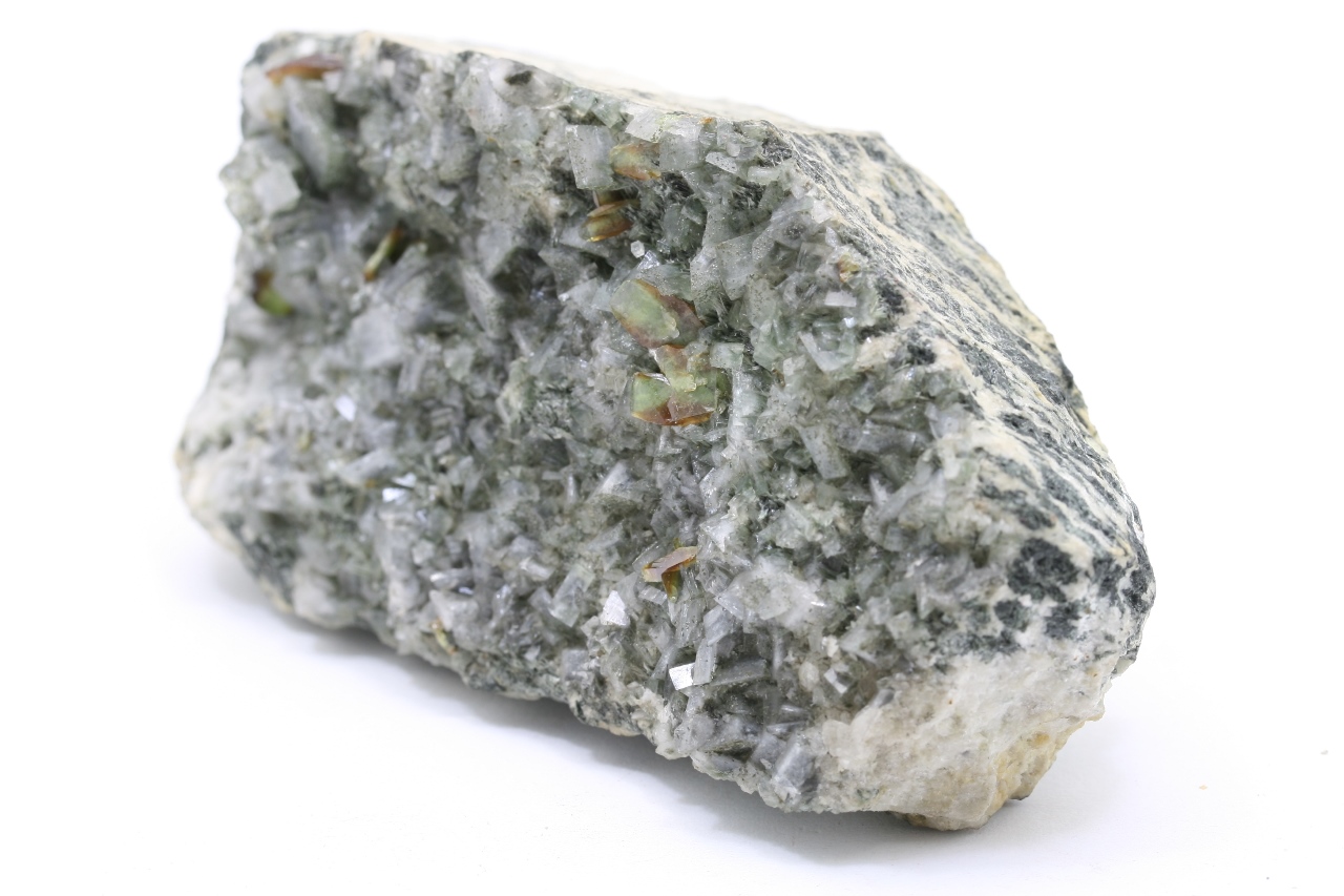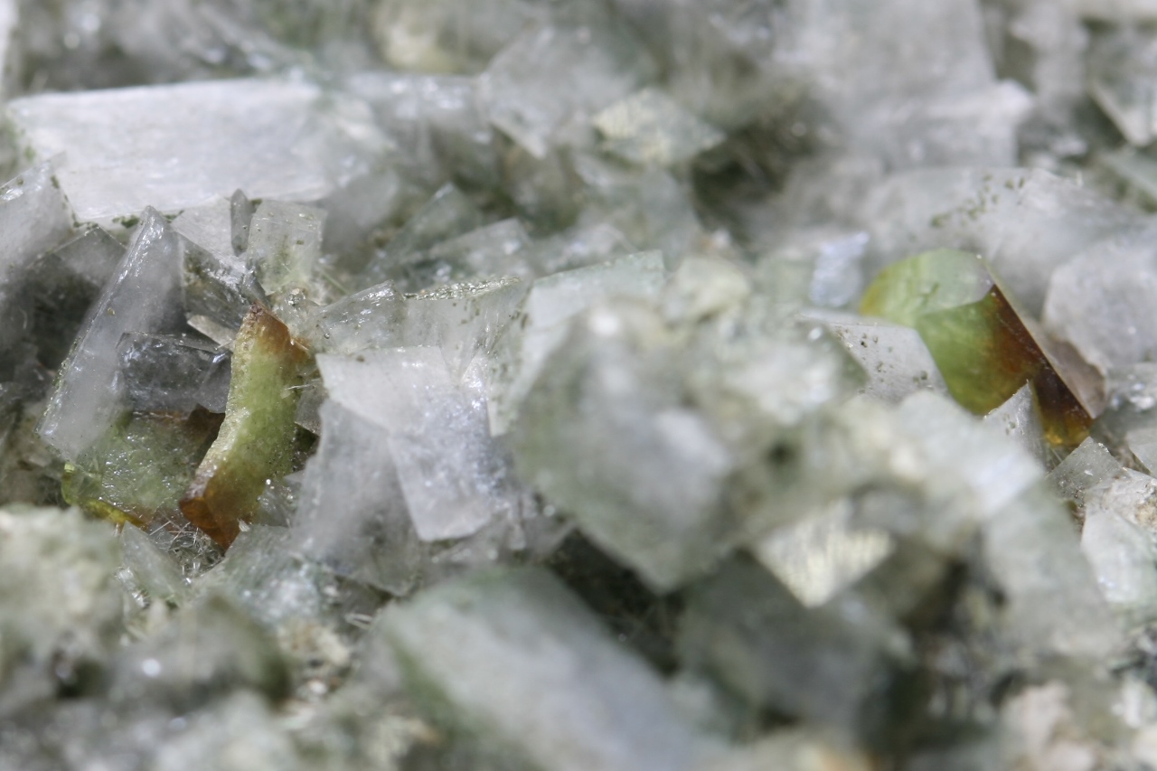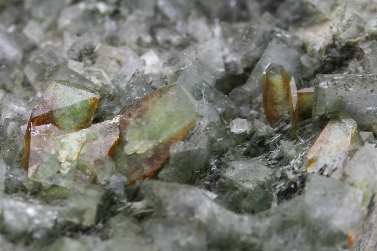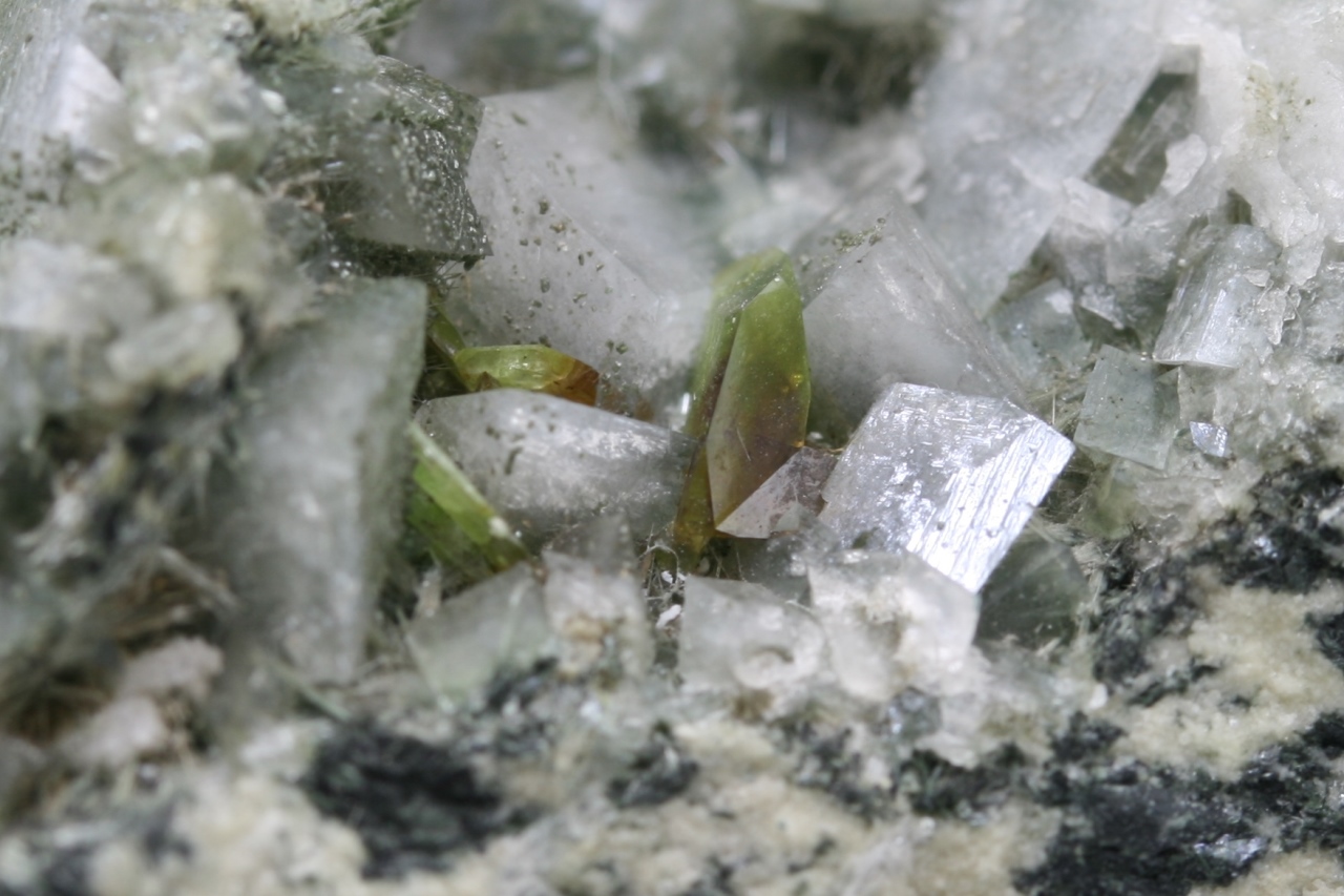 Einige Kristalle von grünem Titanit an Kanten, die zu braun übergehen.