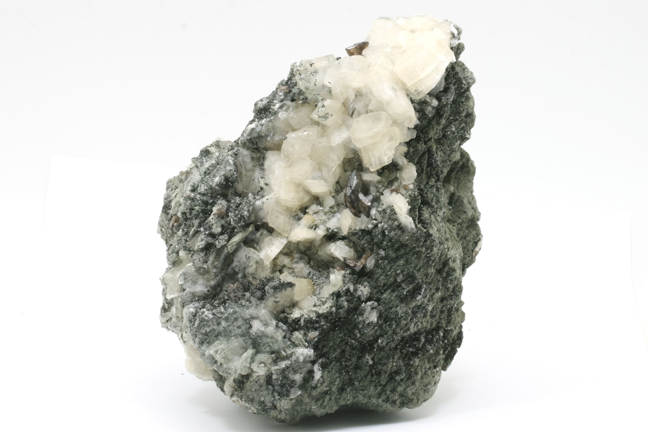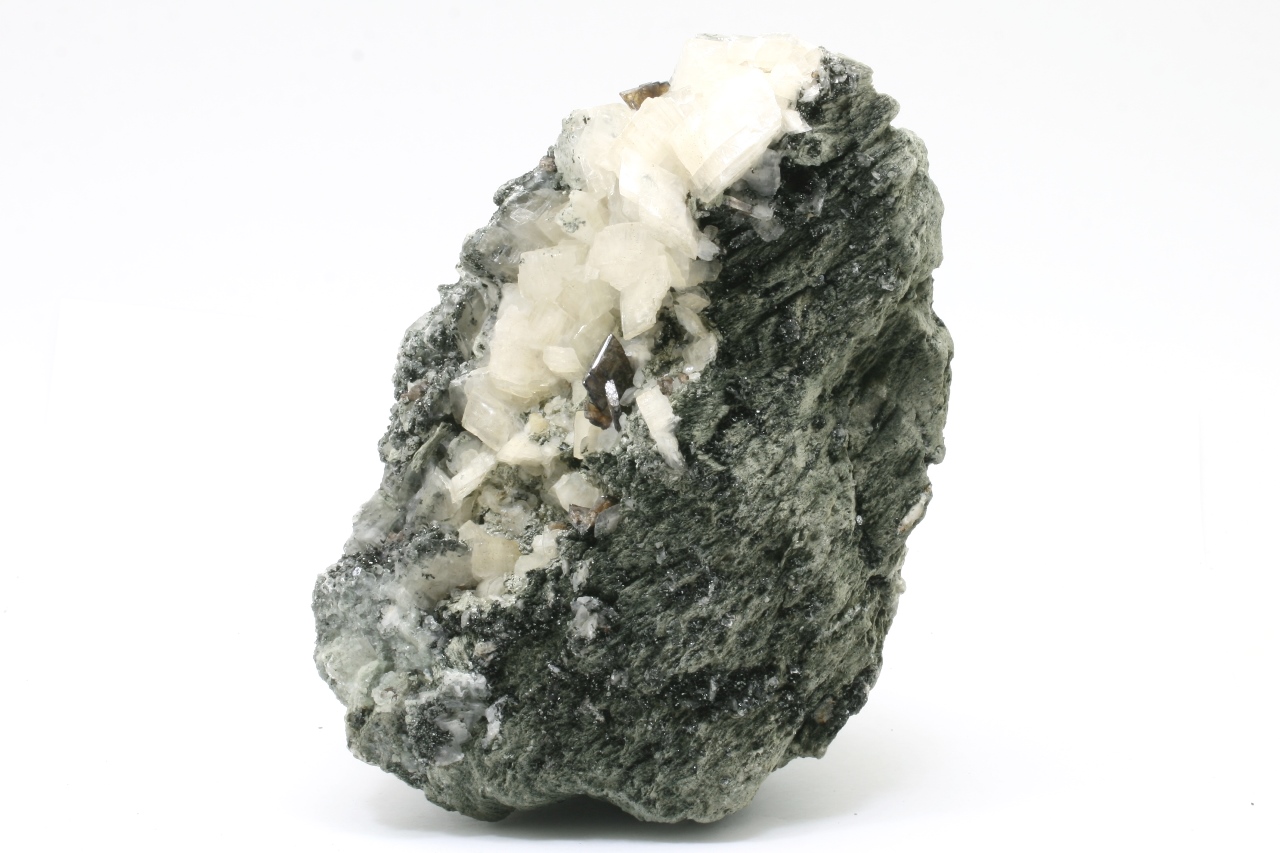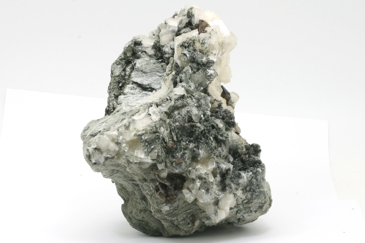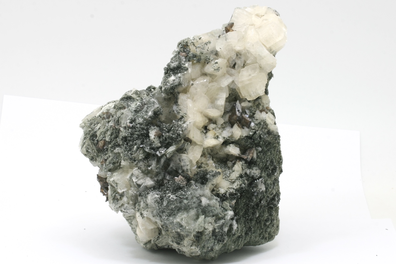 Weiße Domite von Calcit, mit braunen Kristallen von Titanit, bis zu 15 mm groß, gewachsen auf einer chloritischen Schiefer.
