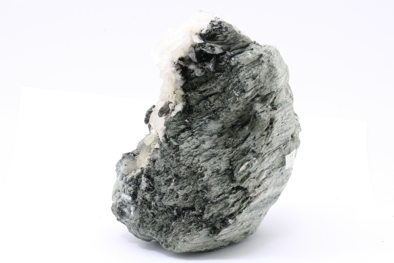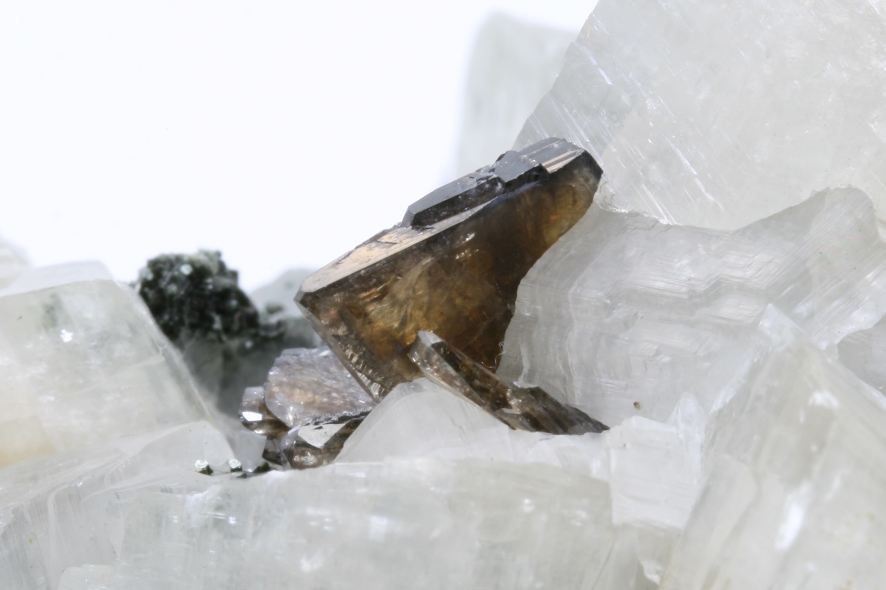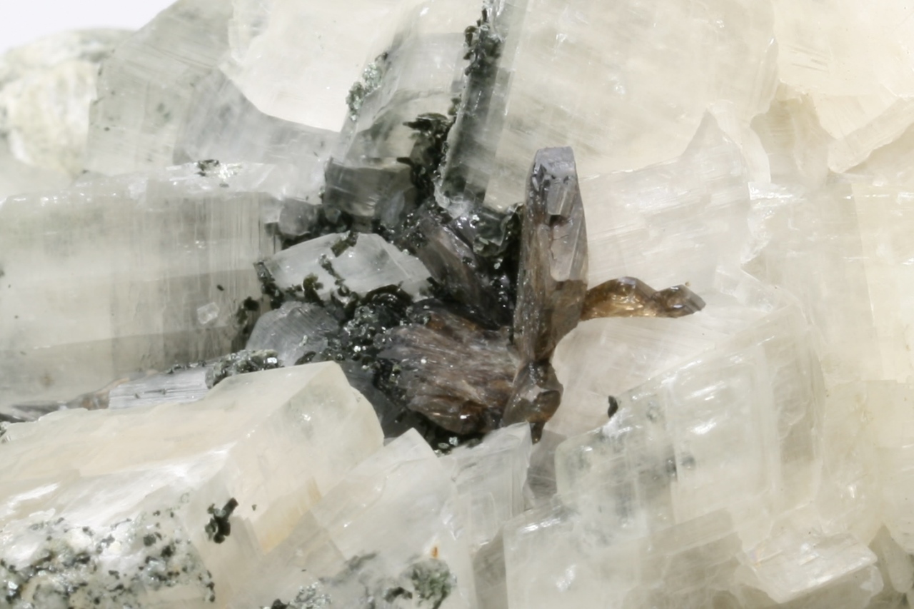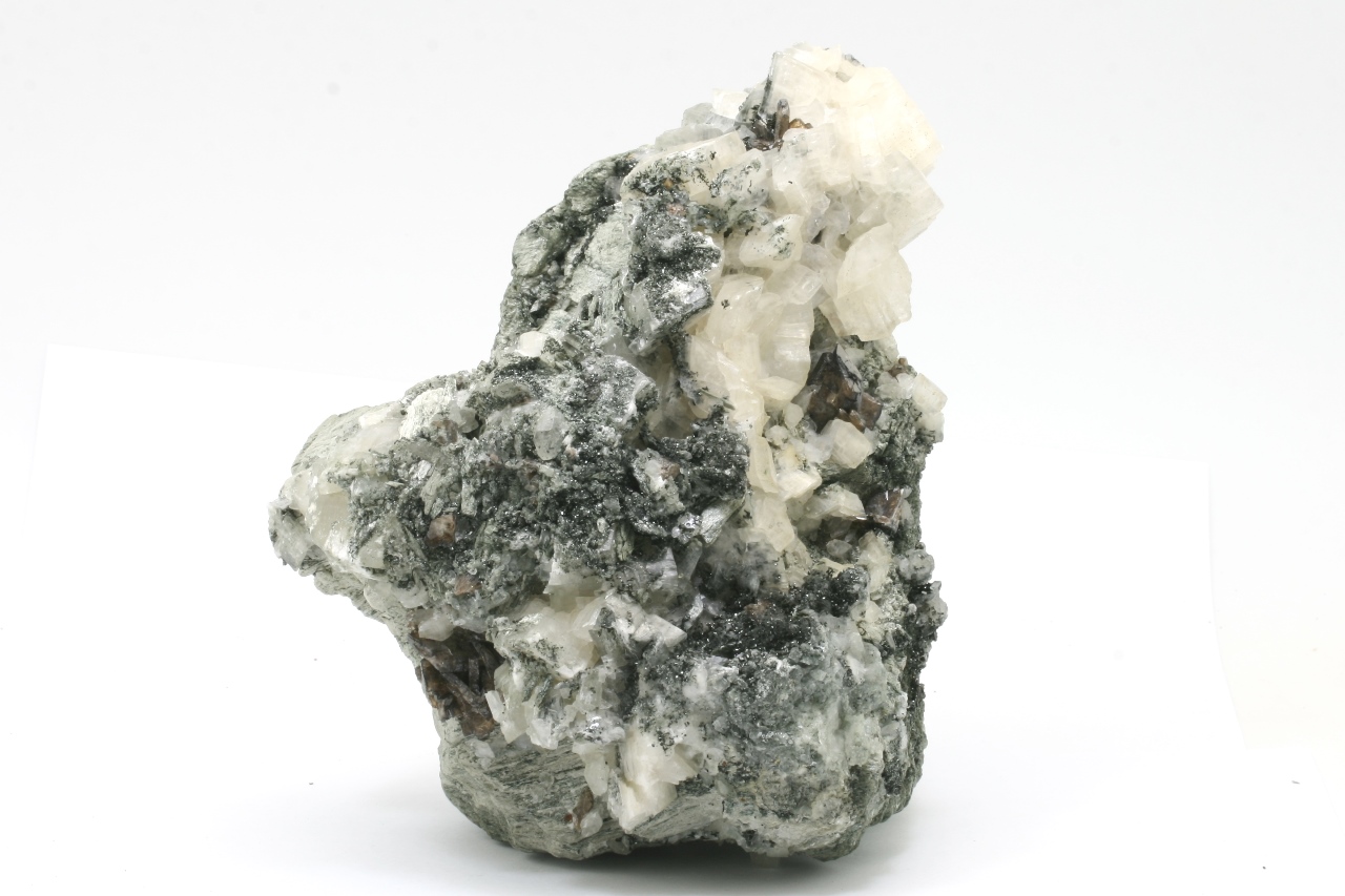 Weiße Domite von Calcit, mit braunen Kristallen von Titanit, bis zu 15 mm groß, gewachsen auf einer chloritischen Schiefer.